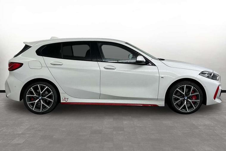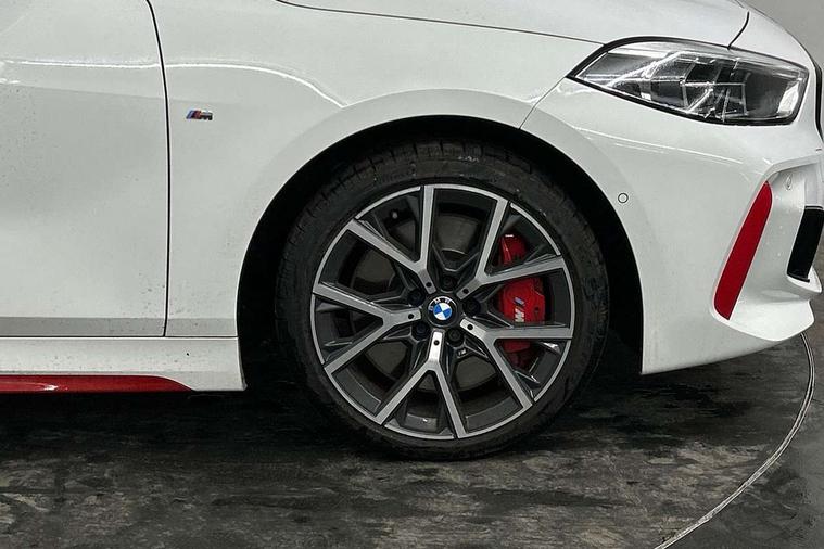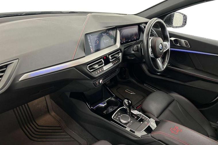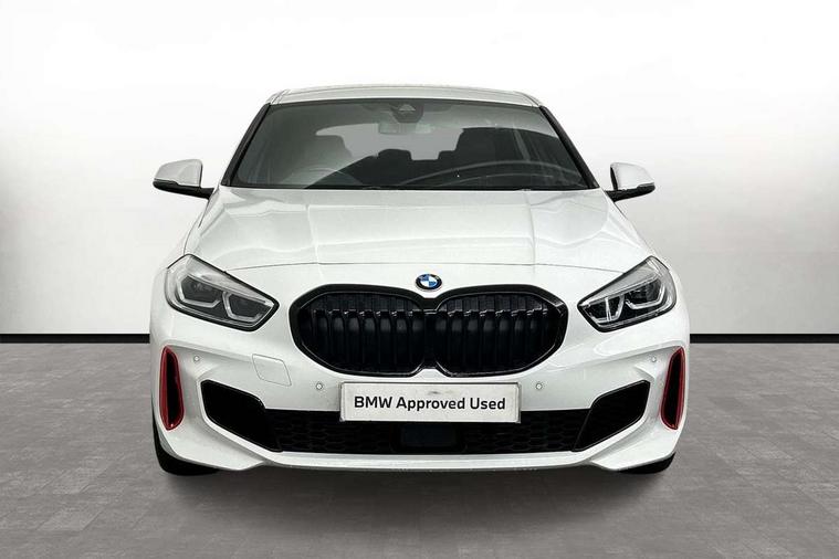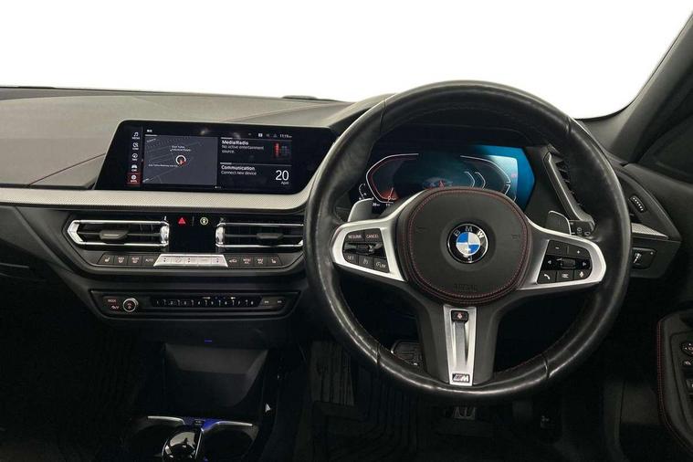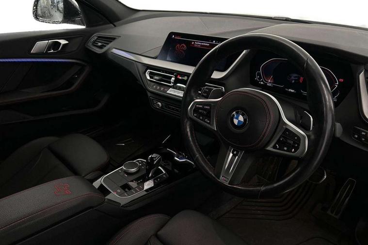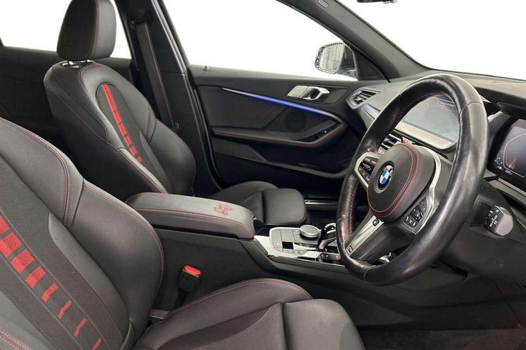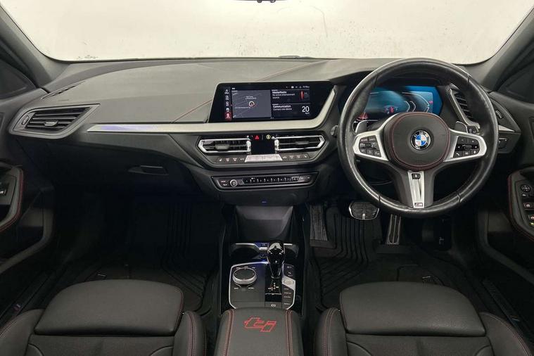 Active guard plus, Attentiveness assist, BMW ConnectedDrive online services, BMW Teleservices, Check Control warning system for monitoring of lights and door/luggage compartment open warning, Cruise control with brake assist, Eco pro mode, Electric power steering with Servotronic steering optimised at all speed ranges, Front axle single joint with specific axle kinematics to minimise drive influences on steering + provide increased rigidity agile driving behaviour, Integrated owners handbook, Lane departure warning system, Oil sensor for level and grade, On board computer, Optimum shift indicator, Personal Profile, Pull away assistant, Rigidly mounted rear subframe - Multi link construction with separate spring / damper configuration and excellent driving characteristics, Speed limit Info including no-overtaking indicator, Speed limiter, Aluminium lightweight construction, Anti roll bar front and rear, Balancer shaft, Double VANOS twin scroll turbocharging system, Drive Performance Control, Eight speed sport automatic transmission with gearshift paddle switches, Electronic differential lock, High precision injection, Larger fuel tank capacity (50 litres), M sport suspension with M128i xDrive specific settings, Petrol Particulate Filter, Twin tube gas filled shock absorbers with degressive characteristic curve, VALVETRONIC engine management, DAB Digital radio, Auto dimming rear view mirror, Automatic headlight beam throw control, Automatic windscreen wipers and automatic headlight, Black chrome tailpipe finishers, BMW individual high gloss shadow line with extended content, Body colour door handles, Body colour mirror caps, Body colour roof trims, Chrome 'M' logo side designation, Chrome kidney grille frame with Satin Aluminium struts, Direction indicator side lights in exterior mirrors, Fading support, Folding side mirrors with auto dimming/folding wing mirrors with auto dimming, Follow me home headlights, Front and rear bumper system with replaceable deformation elements, Front and rear electric windows with open and close fingertip control, anti trap facility and comfort closing, Front door sill finishers in black plastic with M designation in metallic look, Green tinted heat protection glazing, Heated, electrically adjustable exterior mirror aspheric on driver side, convex on passenger side, High gloss shadowline window frame, Recess cover mirror frames and B/C pillar embelisher trim, High level third brake light, Integrated front windscreen with washer jets, Kidney frame and struts in high gloss black extended, LED daytime running lights, LED eyebrow turn indicators, LED front fog lights, LED Headlights, Lightweight engineering, Matt black air guide grilles, Matt black wheel arch trim, Model designation on electric bootlid, Nearside reverse light in rear light cluster, Preparation for high beam assistant, Rear fog lights, Rear side wing doors, Rear window wiper, Shark fin antenna, Trailer stabilisation logic, Visible VIN plate, Welcome lighting, 12V power socket in front centre console with blanking plug, 3 rear seat head restraints, 3 seat bench in 2nd row, Anthracite headlining, Black boot net with lashing eyes, Cargo function on 2nd seat row, Centre armrest in black/red highlight including embroidered 'ti' designation in red, Child seat ISOFIX attachment for two outer rear seats and front passenger seat with anchorage points, Conditioned based service, Driver and front passenger seat heating, Floor mats with red binding, Folding rear clothes hook, Four grab handles integrated in roof lining, Front and rear door pockets with bottle holders, Front and rear side armrest integrated into door trim, Front armrest, Front sports seats, Glove compartment, Height adjustable front head restraints, Instrument panel top section , door armrests and door panels in black/red highlight, Luggage compartment for bag hooks on left and right, foldable luggage compartment liner and four lashing eyelets, Manual adjust steering wheel, Multi-function controls for steering wheel, Single front passenger seat, Storage compartment in centre console, Sun visors with vanity mirrors and insert tab, Three spoke M sport design multi function leather steering wheel in unique red stitching, Two front centre console cupholders, Two zone automatic air conditioning, Additional interior lighting pack - 1 Series, BMW live cockpit professional pack- 1 Series, Connected pack professional - 1 Series, Interior lights pack - 1 Series, M Sport exterior styling aerodynamics pack - 1 Series, 2 tone horn, 3 point seatbelts on all seats, front pyrotechnic belt tensioners, stopper and belt force limiters, rear coded belt buckles, Airbags - Front driver/passenger, front and rear curtain head protection, front side, manual deactivation of front passenger airbag, Anti lock braking system (ABS) with brake assist, BMW emergency call, Brake drying, Braking readiness, Child proof locking system in rear door, City braking function, Comfort modes, Cornering brake control, Crash sensor activating central locking release, hazard warning lights, fuel cut off, interior lighting + activation of safety battery terminal clamp, Driver and front passenger seat belt security check, Dynamic stability control + (DSC+), Dynamic Traction Control - DTC, Electrically operated hand brake including automatic hold function, Front and rear disc brakes, M Sport brakes with red calipers, M Sport seatbelts, Seatbelt warning, Side impact protection, Tyre pressure monitoring system, Warning triangle and first aid kit, Central locking switch for all doors, fuel filler cap and luggage compartment, Deadlocking function system to all doors, Drive away locking system on all doors and luggage compartment with de-activated in iDrive settings, Locking wheel bolts, Remote control with integrated key with High-gloss Black inlay and M designation and 1 button for open/ close lock, window, open luggage compartment, Start/stop button illuminated in centre console with keyless e