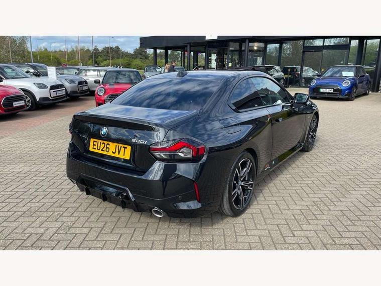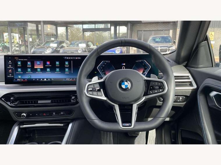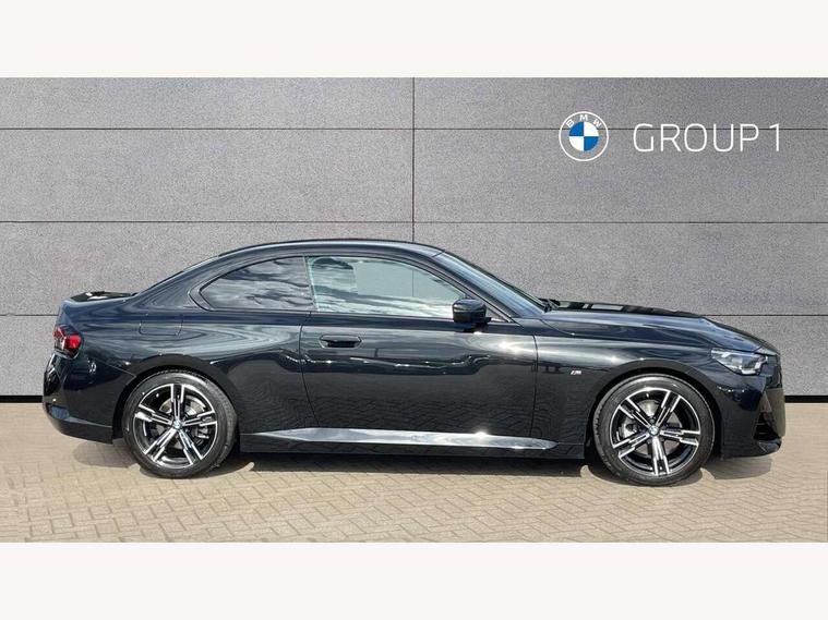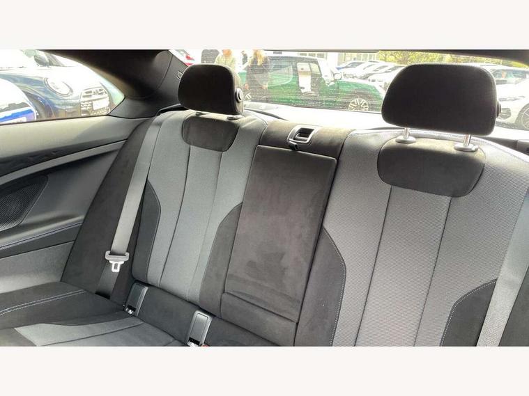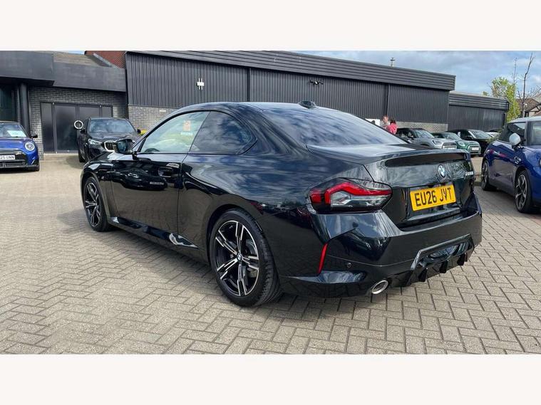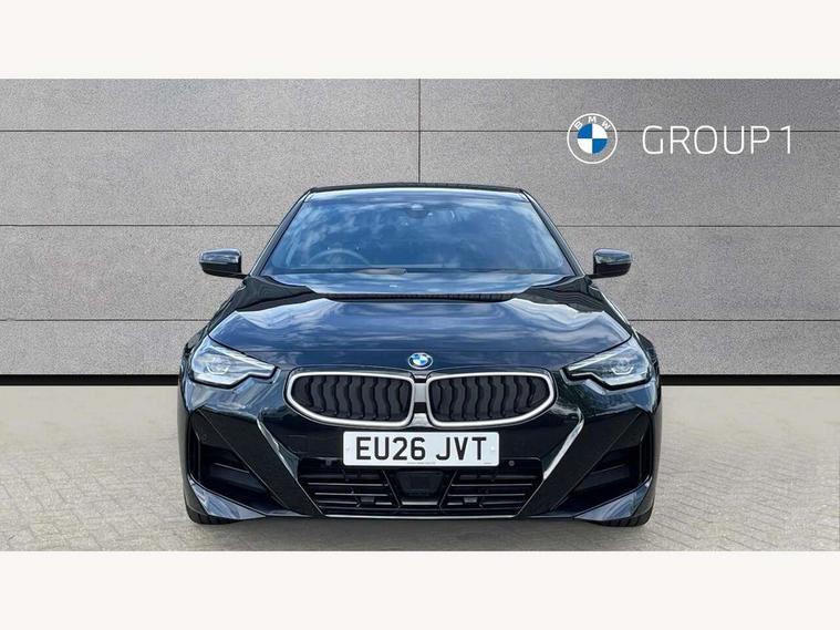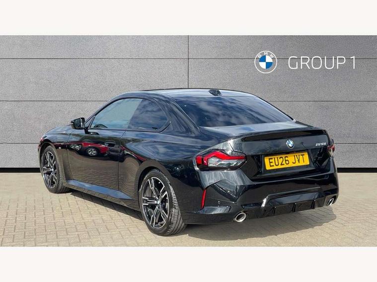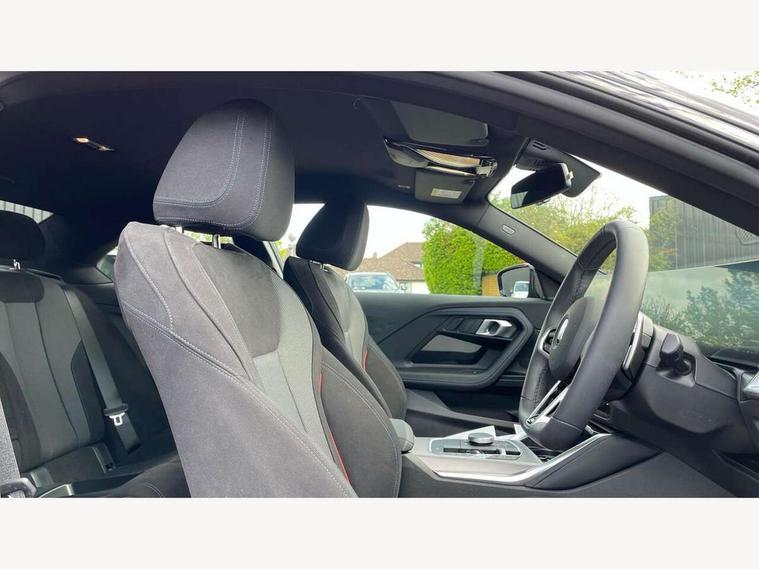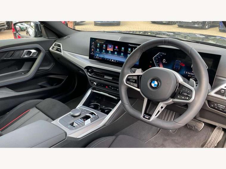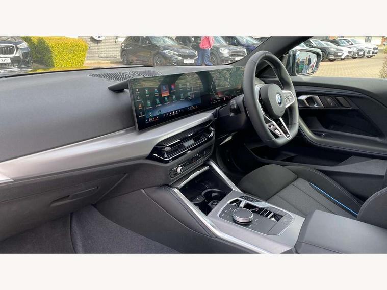 Active guard plus, Attentiveness assist, Bluetooth with USB, BMW ConnectedDrive online services, BMW Intelligent Personal Assistant, BMW Live cockpit plus, BMW Maps, BMW Teleservices, Check Control warning system for monitoring of lights and door/luggage compartment open warning, Control Infotainment, Direct selection buttons, Drive off assistant, eSim with 5G connectivity, Front and rear parking sensors, iDrive controller with turn and press function, Intelligent functions, Oil sensor for level and grade, Optimum shift indicator, Parking assistant with active park distance control, reversing assistant, lateral parking aid and rear view camera, Personal Profile, Smartphone integration, Touch operation on control display, Variable sport steering, Widescreen display with 12.3" fully digital instrument cluster and 14.9" control display, WiFi interface for wireless connection of mobile terminal devices, Aluminium lightweight construction, Balancer shaft, BMW TwinPower Turbo four-cylinder petrol engine, Double VANOS, Drive performance control with ECO PRO comfort + sport mode, Dynamic stability control, Electronic differential lock, High precision injection, M sport suspension, Petrol Particulate Filter, Steptronic transmission with gearshift paddles, Twin scroll turbocharger with Valvetronic, 1 x USB Type A with data transfer and 1.5 Ampere charging function in the centre console, 1 x USB Type C with 3 Ampere charging function in the front centre armrest, DAB tuner, Acoustic windscreen wipers for reduced driving noise, Automatic windscreen wipers and automatic headlight, Body colour door handles flush with door surface, Body colour door mirrors, Body colour front and rear bumpers, Daytime running lights, Electric windows - front and rear, with open/close fingertip control and trap release, Exhaust tailpipes x2 - 90mm in left and right, Fading support, Front and rear bumper system with replaceable deformation elements, Front door sill finishers in black plastic with BMW designation, Front windscreen wipers with integrated washer jets, Green tinted heat protection glazing, High level third brake light, Indicators integrated int mirror housing, Interior rear-view mirror with automatic anti-dazzle function, LED registration plate light, LED technology rear tail lights, brake lights and turn indicators, M Aerodynamics front and rear aprons in vehicle colour and diffuser insert in black high-gloss, M entry sills, front, M high gloss shadowline, M model badge on front side panel, left and right, M pedal mechanism, Radiator grille frame and tailpipe trims in pearl chrome, Rear boot, Rear fog lights, Reversing light in rear light cluster, Roof trim strip in vehicle colour, Shark fin antenna, Side sill trim panels in vehicle colour, Single part LED rear lights with smoked glass components, Trailer stabilisation logic, Visible VIN plate, 12V power socket in front centre console with blanking plug, 2 cupholders in front centre console, 2 zone automatic air conditioning, Ambient door pocket lighting in the cetre console, Ambient inside door handle light, Area lighting in the door trim panel, Conditioned based service, Door entry lights in the front door trim panel, Dynamic ambient lighting for welcome, goodbye, open doors, phone call, English handbook, Folding rear seat head rests, Front ambient footwell lighting, Front ambient lighting, Front and rear side armrests integrated into door trim, Front armrest, Front door pockets, Front head restraints, Heated front seats, Illuminated glove compartment with separate small compartment, M headliner Anthracite, M sport leather steering wheel, Manually adjustment steering wheel column, Rear seat backrest with manual 40:20:40 split folding, Rear seat centre foldable armrest with integrated cup holder, Single front passenger seat, Storage compartment between rear seats, Storage tray and compartment with cover in centre console, Sun visors with vanity mirrors and insert tab, Through loading system with 40/20/40 split folding 2 rear seat in 2nd row, Velour floor mats, Connected pack professional - 2 Series Coupe, Storage compartment pack - 2 Series Coupe, 2 tone horn, Anti lock braking system (ABS) with cornering brake control, BMW emergency call, Brake drying, Child seat ISOFIX attachment for the two outer rear seats, Crash sensor activating of airbags, Unlocking doors, hazard warning lights, interior light, safety battery terminal, Deactivation of fuel pump in the event of a crash, Driver and front passenger airbags, Driver and front passenger side airbags, integrated in the door side seat backrest bolsters for all seat variants, Dynamic brake control, Dynamic Traction Control - DTC, Electrically operated hand brake including automatic hold function and automatic release when driving off, Front and rear disc brakes, Front centre airbag between driver and front passenger seats, Front passenger airbag deactivation, Head airbags for all 4 outer seats, PC iBrake (Post crash approach control warning with light braking function), Seat belt security check for driver and front passenger, Seatbelt warning, Side impact protection, Three point seat belts on 4 seats including front belt stopper, pyrotechnic belt tensioners and belt force limiters, Tyre pressure monitoring system, Warning triangle and first aid kit, Alarm system (Thatcham 1) with remote control and electronic engine immobiliser, Central locking switch for all doors, fuel filler cap and luggage compartment, Deadlocking function system to all doors, Drive away locking system on all doors and luggage compartment, Locking wheel bolts, Start/Stop button (illuminated) in centre console with keyless engine start and Auto Start-Stop deactivation button, Two remote control key with integrated key - one button for open and close doors/fuel flap/tailgate and separate button for unlock luggage compartment, Electrically powered 12V compressor, Reduced rolling resistance tyres, Tyre repair kit,