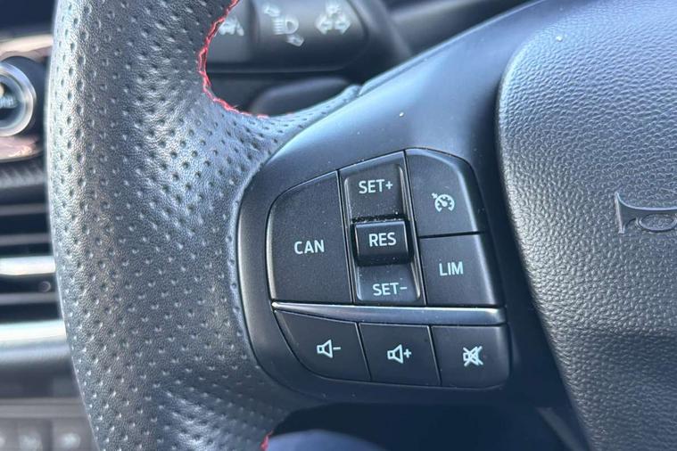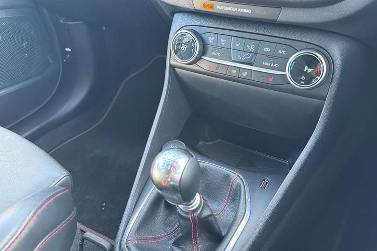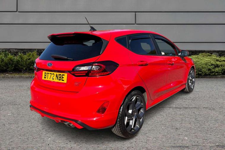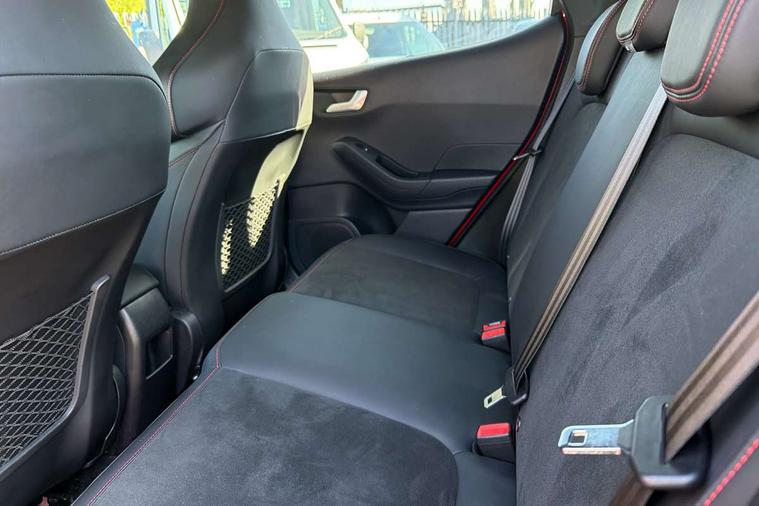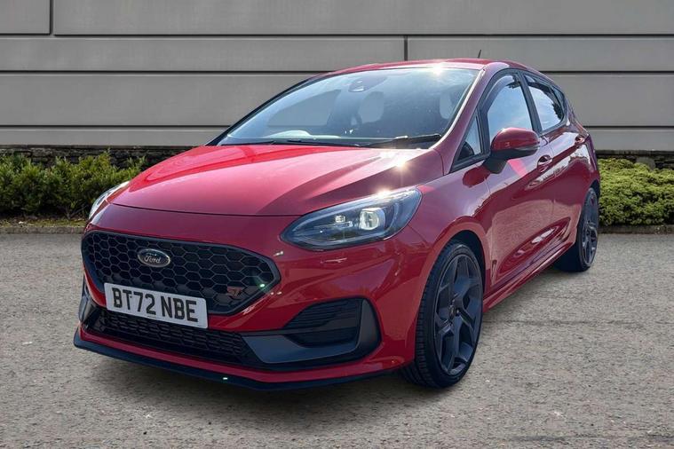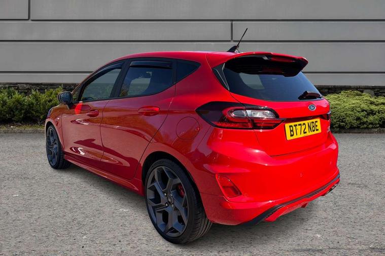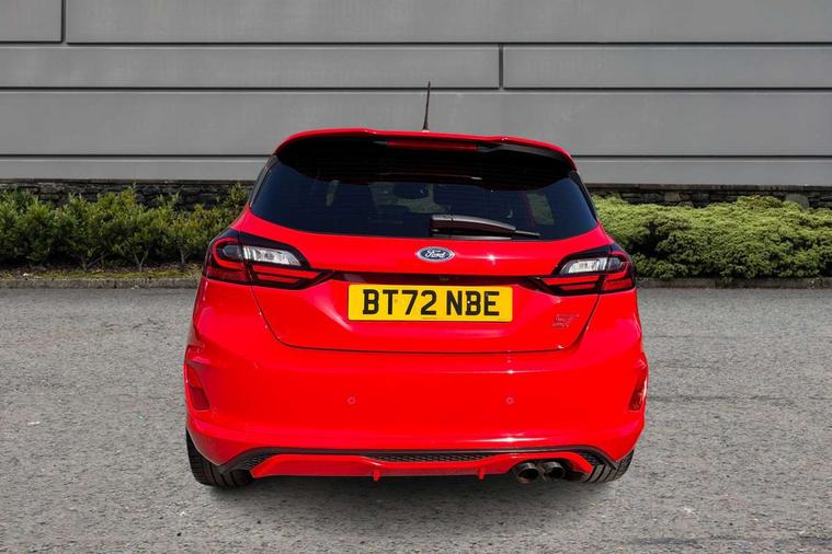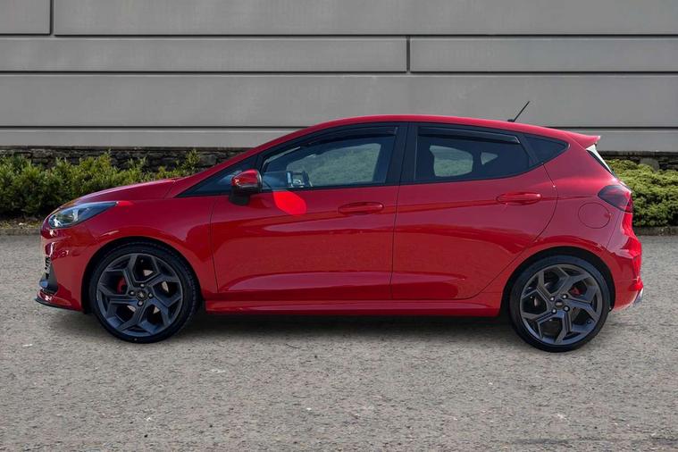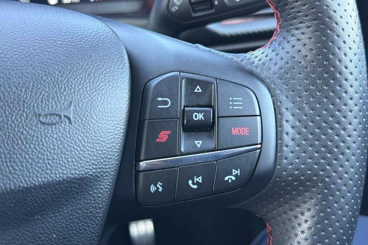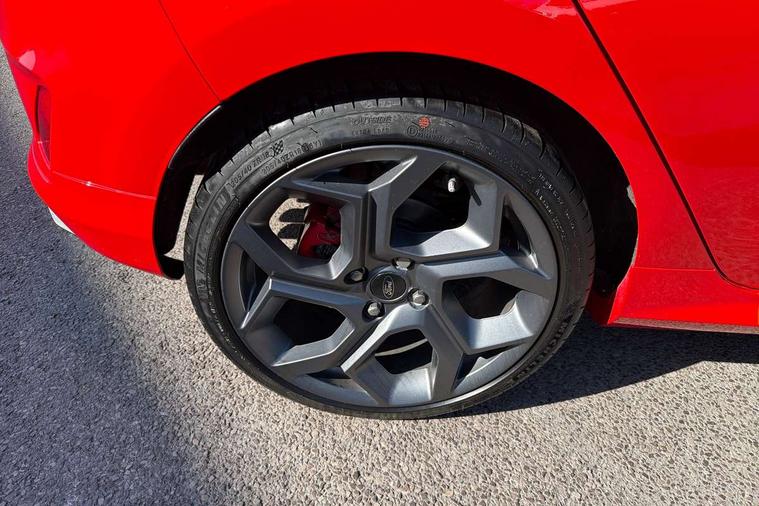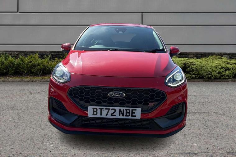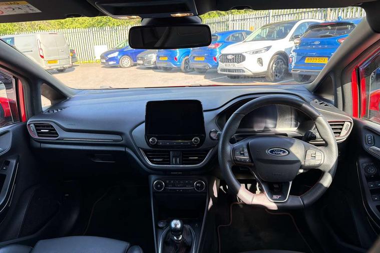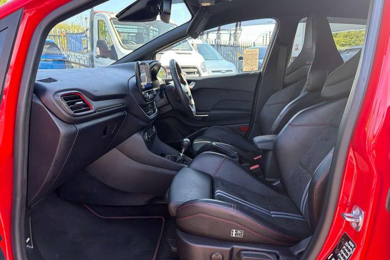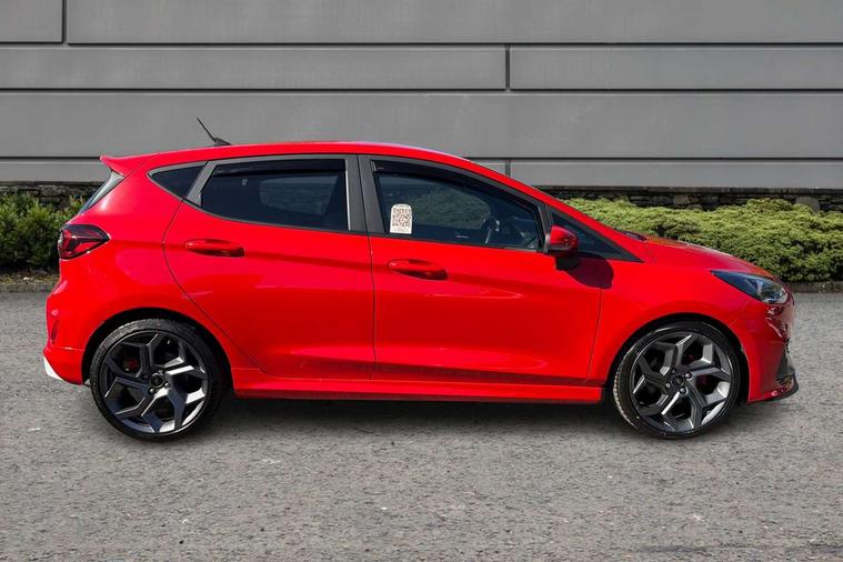 Bluetooth system, Cruise control with active speed limiter, Electric power steering, Ford easy fuel, Selectable drive modes (Normal, Sport, Track), Trip computer, Unique ST suspension, 2 USB ports, Auxiliary input socket, B&O Premium audio system with 8" touchscreen, 10 speakers, 360 degree sound system, Ford SYNC 3 navigation system and Ford pass connect, DAB Digital radio, Steering wheel mounted controls, Body colour bumpers, Body colour door handles, Body colour large rear spoiler, Body coloured electrically operated and heated door mirrors with side indicators, Cornering front fog lights, Dual chrome exhaust tailpipe, Electric front windows/one touch facility, Electric rear windows, LED Night signature to rear lights, Quickclear heated windscreen, Rain sensing wipers and auto dimming rear view mirror, Rear privacy glass, Rear wiper, Unique ST front grille, Unique ST rear bumper with diffuser, Unique ST scuff plates, 3 spoke flat bottomed Leather steering wheel with grey stitching, 60/40 split folding rear seat, Adjustable head restraints, Black headlining, Boot carpet, Centre console with opening armrest, 2x cupholders, 12v and USB, Chrome inner door handles, Drivers and Passenger lumbar support, EATC - Electronic Auto Temperature control, Floor mats with grey stitching, Footwell illumination, Front map reading lights, Front seat and rear pockets, Illuminated glovebox, Leather gaiter, Leather handbrake lever with grey stitching, Load area light, Manual 2 way passenger seat adjust, Manual 4-way driver seat adjust, Overhead console with sunglasses holder, Pollen filter, Rake/reach adjustable steering wheel, Recaro leather sports front seats, Seat belts with blue detailing, Unique ST gearknob with grey stitched gaiter bag, Comfort Pack - Fiesta, NCAP Pack - Fiesta, ST performance pack - Fiesta, 3 point seatbelts on all rear seats, ABS+EBA, Curtain airbags, Driver and passenger airbags, Drivers knee airbag, Electronic stability control with hill start assist, Front passenger airbag deactivation, Front side airbags, Seatbelt warning, Two tone horn, Tyre pressure monitoring system, Ford keyfree system with Keyless entry and keyless start, MyKey system, Remote central locking & engine immobiliser, Thatcham Cat.1 alarm, 18" Magnetic alloy wheels with machined finish and red brake calipers,