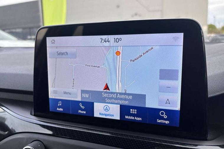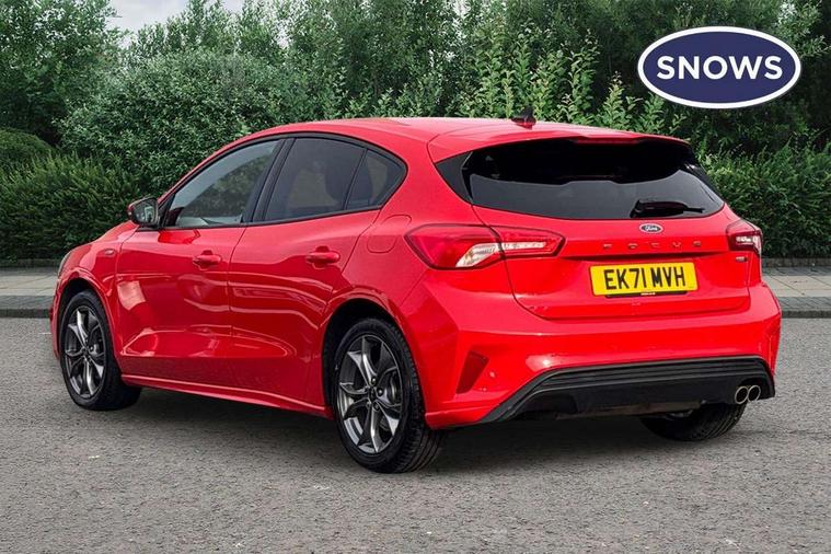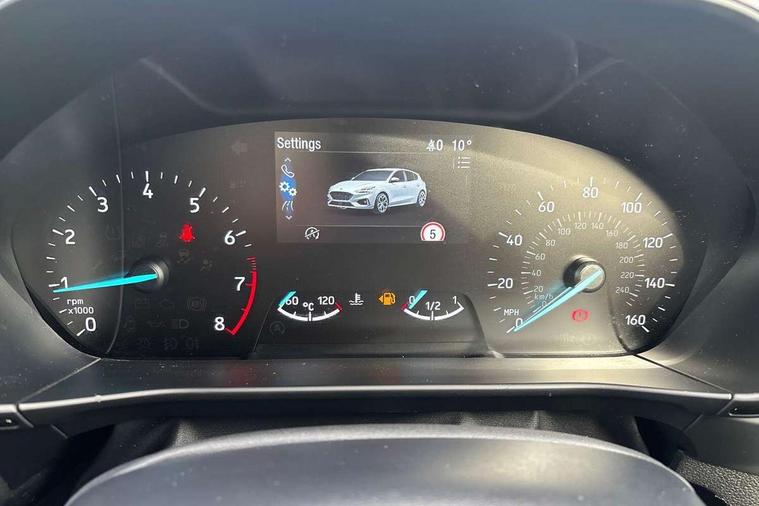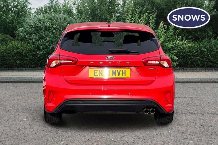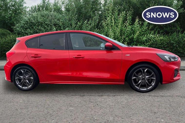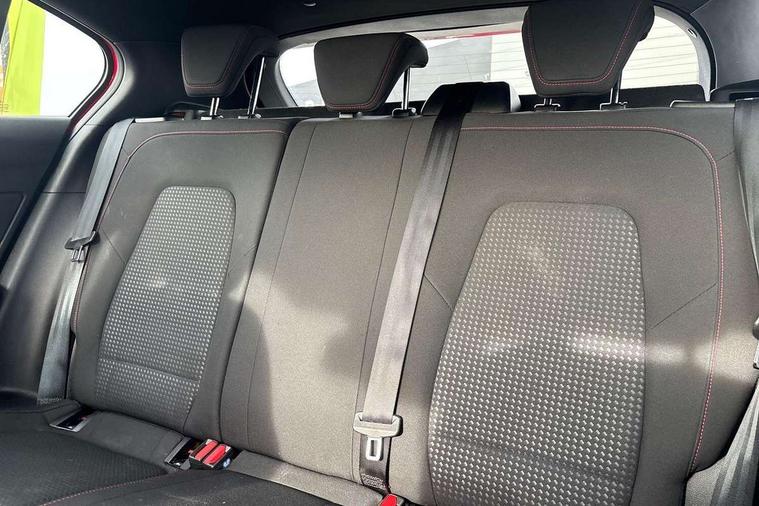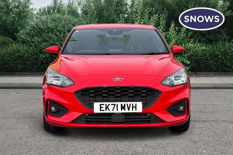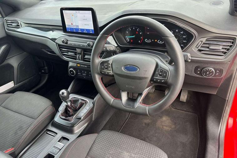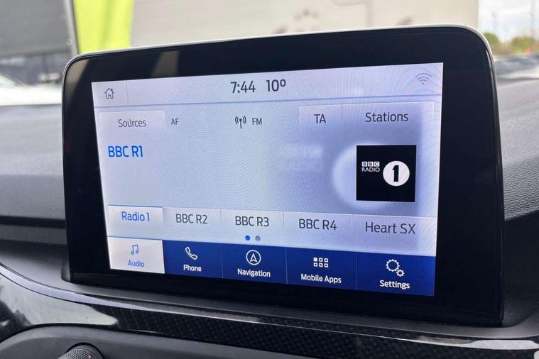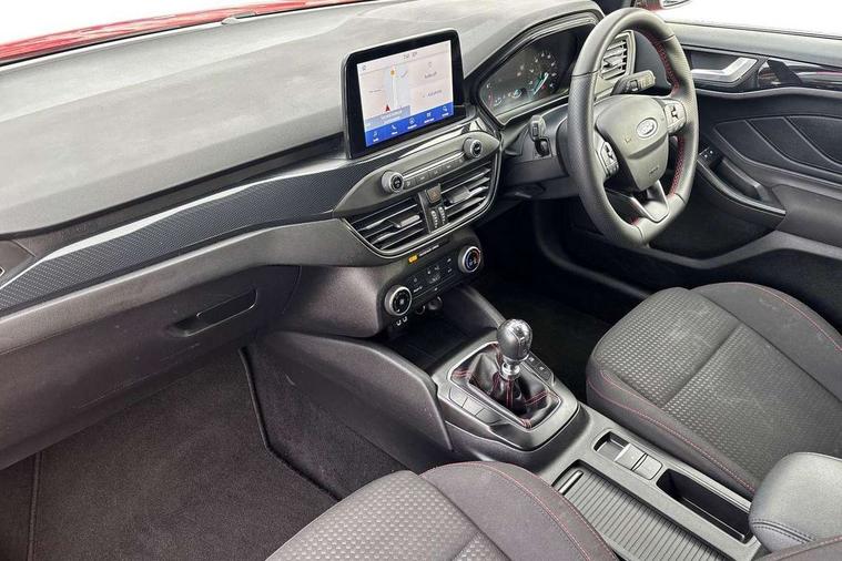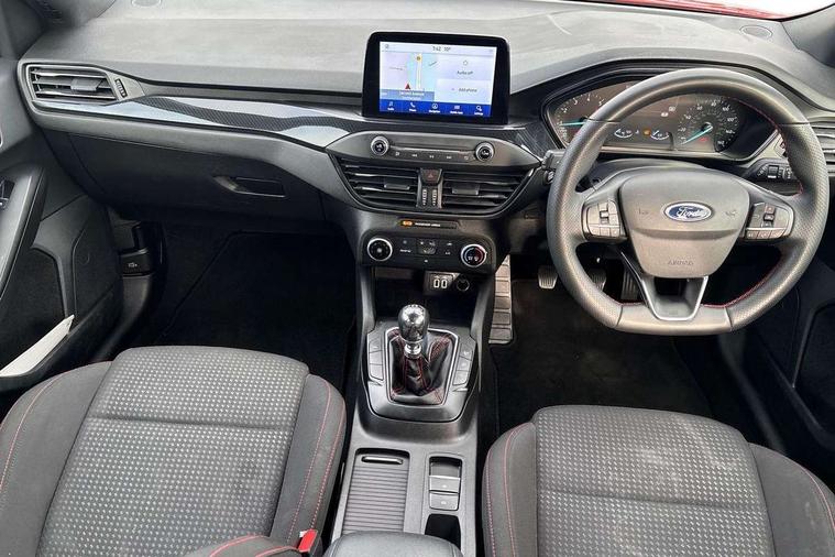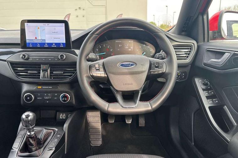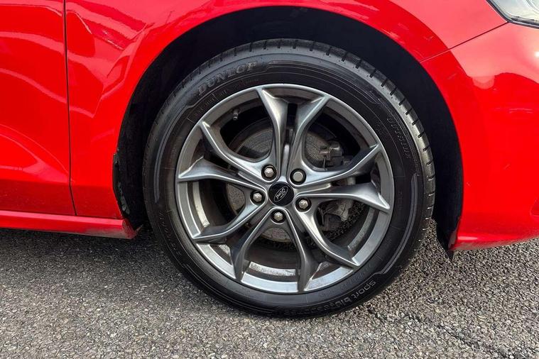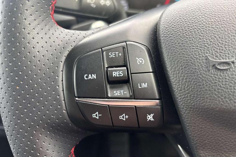 4.2" TFT coloured cluster, Bluetooth system, Digital clock, E-call, Easy fuel capless refuelling system, Eco mode, Ford SYNC 3 navigation with 8" TFT touchscreen, DAB radio and app link Android auto/Apple carplay, Intelligent speed assist, Lane keeping system - lane keeping alert and lane keeping aid, PAS, Selectable drive mode, Trip computer, Sports tuned suspension, 2 USB ports, Aux input, Auto dimming rear view mirror, Auto headlamps (on/off), Automatic rain sensing wipers, Body colour large rear spoiler, Body coloured bumpers, Body coloured door handles, Body coloured electrically operated and heated door mirrors with side indicators, Electrically operated front and rear windows with one touch opening and closing, Front variable intermittent wipers with electric wash, Heated rear window, LED daytime running lamp, LED front fog lamps with cornering function, LED reflector headlamps, Polished twin tailpipe, Power folding door mirrors, Quickclear heated windscreen, Rear privacy glass, Rear side wing doors, ST-Line upper and lower grille with full body styling kit and wing badges, Tailgate wash/wipe, Third brake light, 3 seat bench in 2nd row, 3 spoke flat bottomed Sensico steering wheel with red stitching, Aluminium gear knob, Cloth upholstery, Dark headliner, Driver's lumbar support, Front floor mats, Height adjustable front headrests, Isofix child seat preparation, Manual air conditioning, Reach + rake adjustable steering column, Rear centre headrest, Single front passenger seat, 3x3 point rear seatbelts, ABS+Electronic Brake force Distribution, Auto hold function, Driver airbag, Electronic parking brake, Electronic stability control, Front and rear seatbelt reminder, Front inertia reel height adjustable seatbelts with pre-tensioners, Front passenger airbag, Front side airbags, Hill start assist, Manual rear child locks, Passenger airbag deactivate switch, Post collision braking, Pre collision assist with autonomous emergency braking and pedestrian/cyclist detection, Side curtain airbags, Three rear inertia reel lap/diagonal seatbelts, Tyre pressure monitoring system, Ford keyfree system with Keyless entry and keyless start/sleep mode key fob, MyKey system, Remote central locking & engine immobiliser, Thatcham category 1 alarm, 17" 5x2 spoke alloy wheels with rock metallic finish, Mini steel spare wheel,