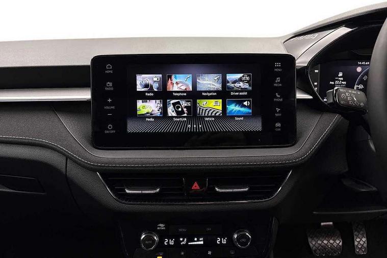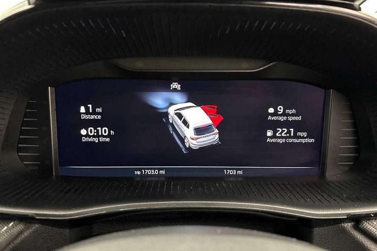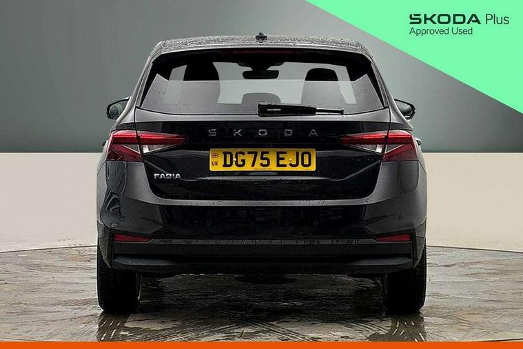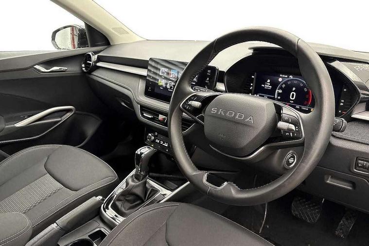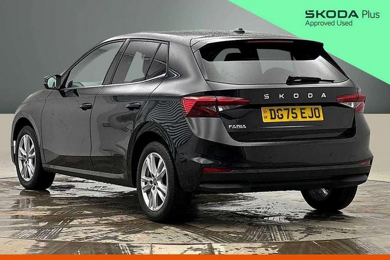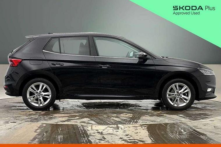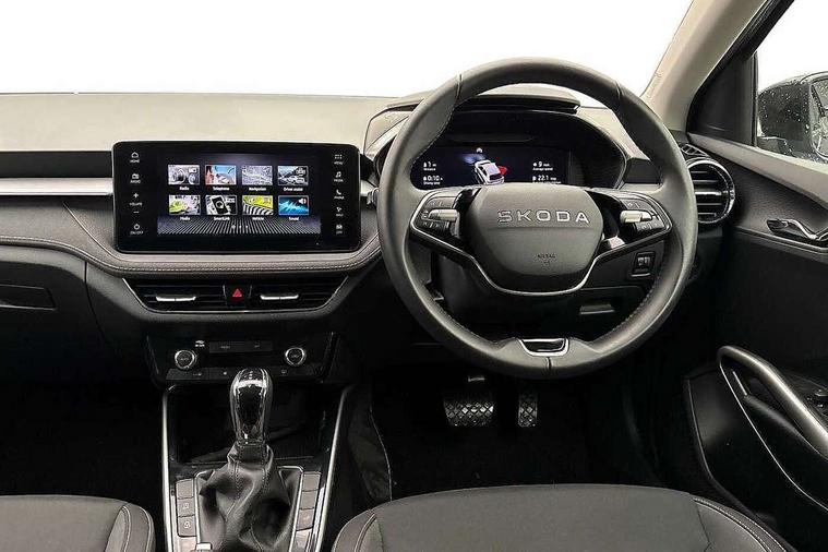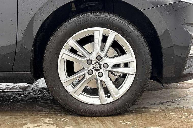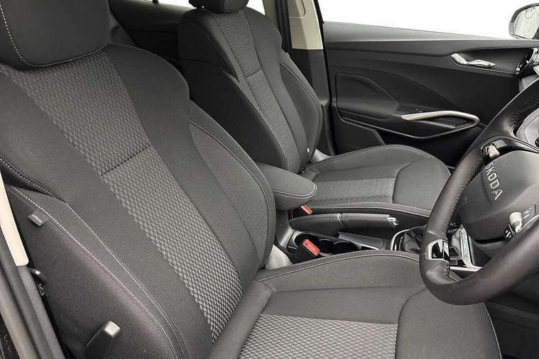 Advanced driver attention and drowsiness monitor, Bluetooth connection, Driver alert system, Electromechanical power steering, Exterior temperature gauge, Service interval indicator, Traffic sign recognition, Virtual cockpit with 10.25" colour display, Wireless SmartLink for Apple CarPlay and Android Auto, 6 Speakers (4 in front and 2 in rear), 9.2" colour display skoda navigation system with voice control and web radio, Auxiliary socket for external MP3 player, DAB digital radio reception, Auto dimming rear view mirror, Body colour door mirrors, Body coloured bumpers, Chrome window surround, Door mirror integrated indicators, Front and rear electric windows, Front window wiper intermittent control, Headlight range control - Automatic, Ice scraper in fuel cap, LED 3rd brake light, LED daytime running lights with coming and leaving home feature, LED rear lights, Privacy glass, Rear LED fog light, Rear side wing doors, Rear window wiper with washing nozzles, Roof mounted spoiler, SKODA tailgate lettering in chrome, Unique dark chrome design logo on alloy wheels, 2 LED reading lights in front and rear, 3 rear headrests, Backrest split and folding, Central console with fixed cup holder and storage box, Chrome handbrake release button, Comfort seats, Door sills with fabia badging, Dual zone air conditioning with climatronic electronic control, Fabric upholstery, Front centre armrest, Gearshift knob/handle in leather, Grain satin black interior door handles, Hand brake lever handle in leather, Height adjustable front headrests, Height adjustable front seats, Height adjustable steering wheel, ISOFIX and TopTether anchorage points to the outer rear seats, ISOFIX and TopTether on the front passenger seat, Luggage compartment lighting, Manually adjustable lumbar support in front seats, Pollen filter, Rear seat bench unsplit, Single front passenger seat, Skoda lettering on steering wheel, Storm grey headlining, Sun visors with mirror and airbag label on passenger side, Textile floor mats, Ticket holder, Umbrella in drivers door, Ambient lighting pack - Fabia Hatchback, 3-point height adjustable front seats belts with pretensioner and force limiter, Automatic warning lights in case of crash, Driver and passengers airbag with switch off function, e-Call+, ESC including ABS, MSR, ASR, EDS, HBA and XDS, Front and rear seat belt warning, FRONT ASSIST (AEB City and AEB Inter Urban), Front side airbags, Head airbags, Hill hold control, One tone horn, Pedestrian protection, Three rear 3-points safety seat belts with pretensioner and force limiter including stop function for outer rear seat belts, Tyre pressure monitoring system, Anti-theft alarm system including immobiliser, interior monitoring, backup horn, and towing protection, Central locking with radio remote control, interior controls, SAFE function and 2 foldable keys, Chrome edged air vents, Grain satin black central console cover, Metallic grey upper decorative trim, Satin black door and side trim panel in front, Textile microsuede grey lower decorative trim with art grey stitching, Anti-theft wheel bolts protection, Super-low rolling resistance tyres,