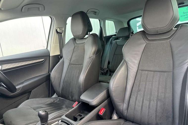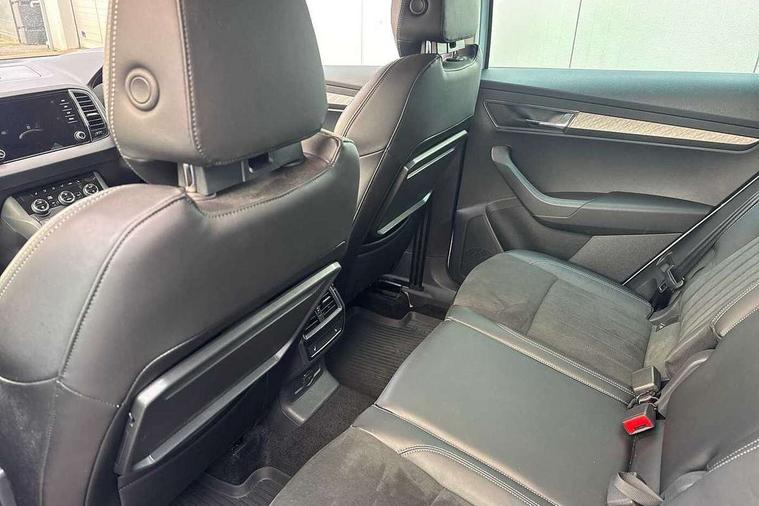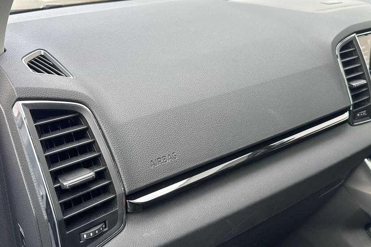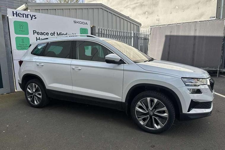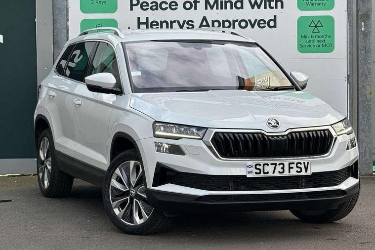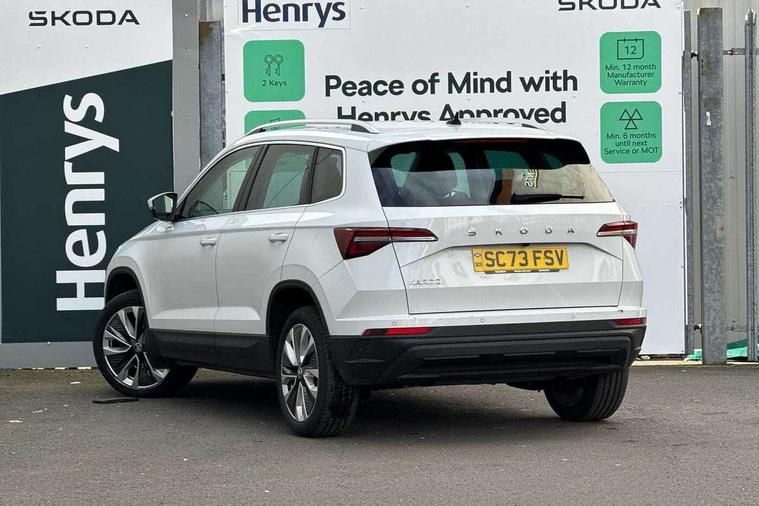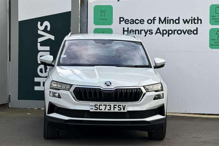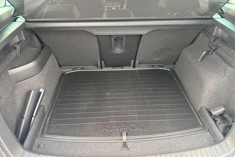 8" Digital display, Care connect, Driver fatigue sensor, Emergency services call system, Outside temperature gauge, Service interval indicator, SmartLink wireless for Apple and wired for Android, Start/stop system with regenerative braking, USB C Port x 2 in front centre console, 8 Speakers, DAB radio with Bluetooth, USB connection, Acoustic glass, Aero front windscreen wipers with intermittent function, Auto dimming rear view mirror with light and rain sensors, Black electric window control buttons, Body colour door mirrors and handles, Dynamic headlight range control with cornering light function, Electric front and rear windows with child proof lock, Heated rear windscreen, LED daytime running lights, LED rear lights with high functionality welcome effect and dynamic indicators, Light assistant (coming/leaving home/tunnel light), Plastic scuff plates, Privacy glass, Rear side wing doors, Rear spoiler, Rear window wiper with washer system and intermittent control, Safety reflectors on front doors, 1.5 litre bottle holders in driver and front passenger door panels, 12V socket in boot, 12v socket in front centre armrest with storage compartment and rear air vents, 2 spoke leather heated multifunction steering wheel, 2 x Tablet holder, 3 rear height adjustable headrests, 3 seat bench in 2nd row, 4 foldable roof handles with rear coat hooks, Black floor carpet, Chrome inner door handles, Double sided boot floor, Foldable hooks in the boot, Front head restraints, Height adjustable front three point seats belts with tensioners, Height/reach adjust steering wheel, Ice scraper, Illuminated glovebox, Illuminated luggage compartment, Isofix child seat preparation for front passenger seat, Isofix child seat preparation outer rear, Manual lumbar support for front seats, Pen holder, Pollen filter, Rear boot cover, Rear reading lights, Rubbish bin door, Safety vest holder, Single front passenger seat, Storage box in upper central dashboard closed, Sunvisors with illuminated vanity mirrors, Textile floor mats, Ticket holder, VarioFlex seats with standard rear seat release, Boot pack - Karoq, Design Pack - Karoq, Parking pack - Karoq, Automatic door unlocking in case of crash, Automatic fuel cut off in case of crash, Child locks on rear doors, Driver airbag, Electronic parking brake with auto hold function, Emergency rear braking signal, ESC including ABS, MSR, ASR, EDS, HBA, DSR, RBS, MKB and traction control, Front side airbags, Hill hold control, Knee airbags, Passenger airbag with switch-off function, Pedestrian monitor, Seatbelt reminder signalisation and pretensioner for all seats, Three point seatbelts rear, Two tone horn, Tyre pressure display, Tyre pressure monitor, Alarm with interior monitoring, back up horn and tilt sensor with safe function, Electronic engine immobiliser, Keyless entry and start/stop, Remote central locking with 2 remote folding keys, Chrome framed air vents, 18" Miran alloy wheels in black, Anti-theft wheel bolts protection, Tool kit,