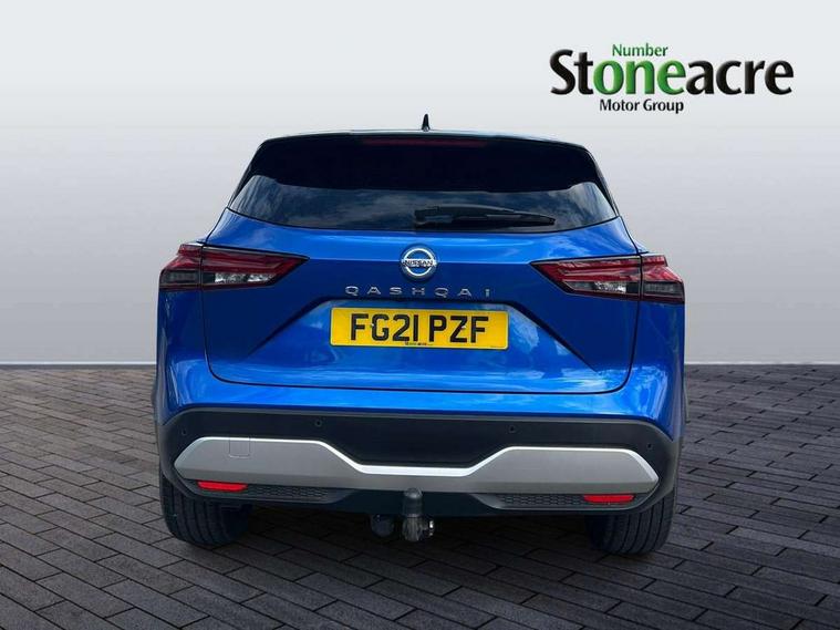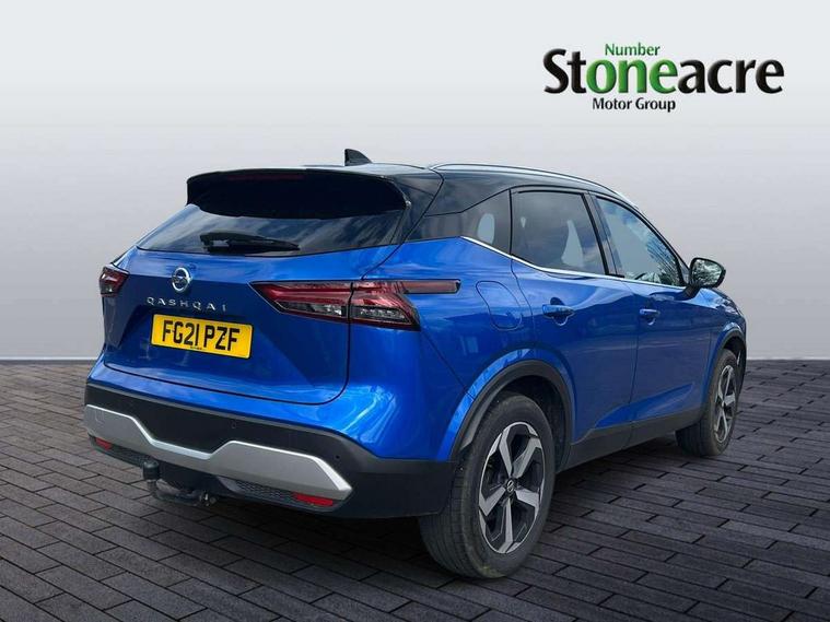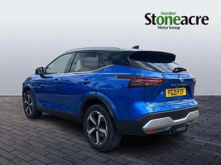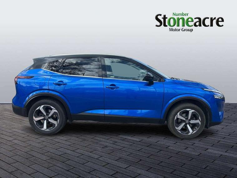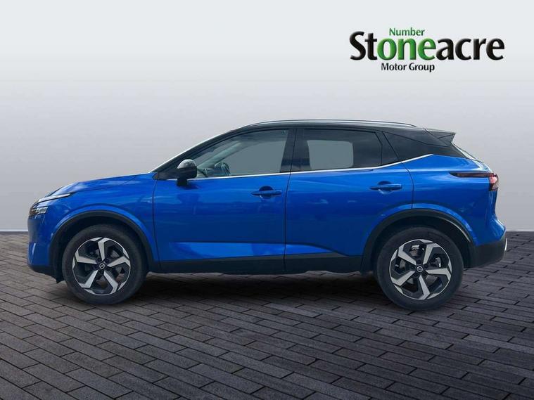 Android auto/Apple CarPlay (Wired), Blind spot warning, Drive modes (sport, normal, eco), Electric speed sensitive power steering, Emergency and breakdown call, Front and rear parking sensors, Full Digital 12.3" TFT Digital Combimeter, Idle stop/start system, Intelligent Cruise control (ICC), Intelligent driver alert system, Intelligent forward collision warning, Intelligent lane intervention, Lane departure prevention, Lane departure warning system, Moving object detection, Push button starter, Rear cross traffic alert, Traffic sign recognition, Trip computer, 6 speakers, AM/FM audio system with DAB, Bluetooth audio streaming, Front USB connections (Type-A and Type-C), Rear USB charging only ports (Type-A and Type-C), Auto dimming rear view mirror, Auto rear wiper when reversing, Body colour mirror caps, Body coloured door handles, Bodyside mouldings, Chrome side window finisher, Electric auto folding door mirrors, Electrically adjustable and heated door mirrors with LED turn indicator, Fixed panoramic glass roof with electric sunshade, Follow me home headlights, High beam assist, Intelligent auto headlights, LED daytime running lights, LED headlights with adaptive driving beam, LED rear lights, One touch front and rear electric windows with remote opening and closing, Partially body coloured bumpers, Privacy glass, Rear roof spoiler, Rear styling plate, Roof rails, Shark fin antenna, Splash free rain sensing wipers, Super UV and infrared cut glass, Three blink turn signal, 12v power socket in dashboard and luggage, 2 way electrical driver lumbar adjustment, 2x Rear coat hooks, 3 rear headrests, 4 grab handles, 6 Luggage hooks - 4 on floor, 2 on side, 60/40 split folding rear seat, Ambient lighting around centre console, Centre console storage tray, Chrome interior door handles, Cloth monoform upholstery, Driver and front passenger sunvisors with illuminated vanity mirrors, Driver seat back pocket, Dual zone automatic climate control with pollen filter, Front centre console and armrest, Front cupholder, Front door with bottle holders, Glovebox with light, Hard trunk cover, Height adjustable front headrests, Leather shift knob, Leather steering wheel, Luggage board system, Luggage space lighting, Manually adjustable passenger (slide recline + lifter), Multifunction steering wheel, Passenger seat back pocket, Rear armrest with 2 cupholders, Rear door bottle holders, Soft PVC kneepad, Steering wheel switches, Tilt/telescopic adjustable steering wheel, Two rear isofix child seat anchorage points with top tether, Welcome light and console tray ambient lighting, Connectivity Pack - Qashqai, Tech Pack (Drive Assist + HUD), 3x3 point rear seatbelt pretensioners + load limiters, ABS, ESP, EBD and brake assist, Active brake limited slip, Auto hold function, Child locks on rear doors, Curtain and front side, far side airbags, Driver and passenger airbags, Driver, passenger and 2nd row rear seat belt reminder, Electronic parking brake, Front seatbelt pretensioners + load limiters, Height adjustable front seatbelts, Hill start assist, Intelligent blind spot intervention, Intelligent front emergency braking with pedestrian, cyclist recognition and junction assist, Intelligent rear automatic braking, Tyre pressure monitoring system, Vehicle dynamic control, Capless fuel filler, Engine immobiliser, Nissan i-key, Remote central door locking with deadlocking, Thatcham Cat.1 alarm, 18" Diamond cut alloy wheels,