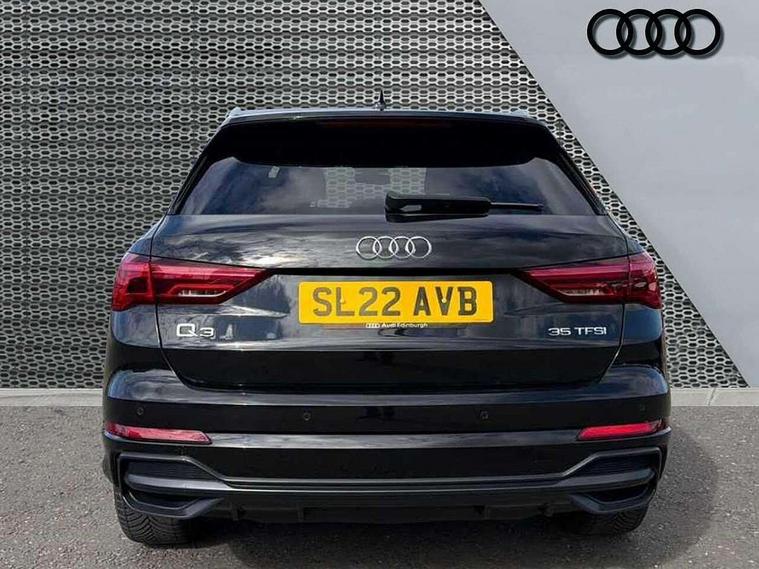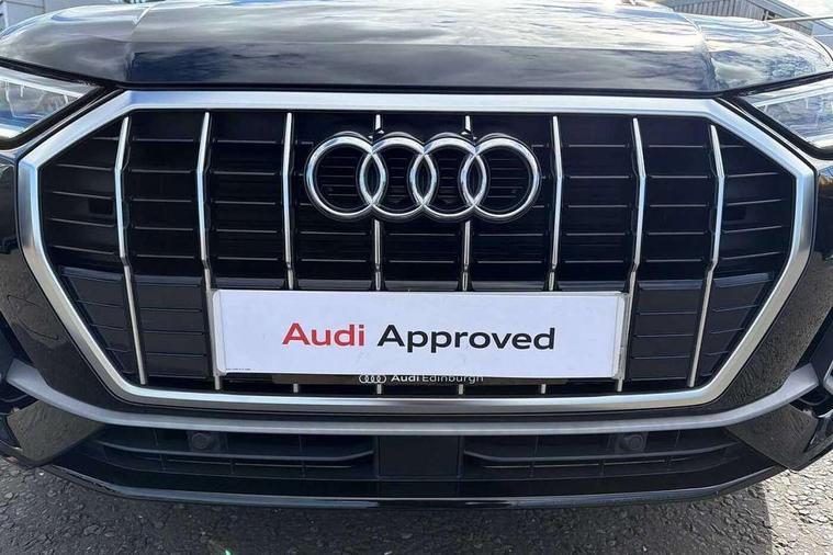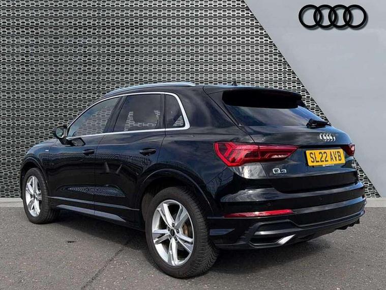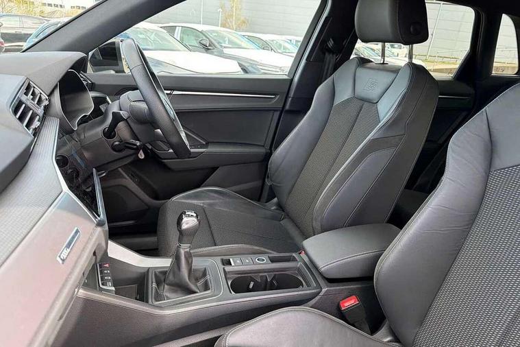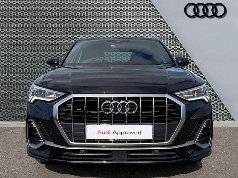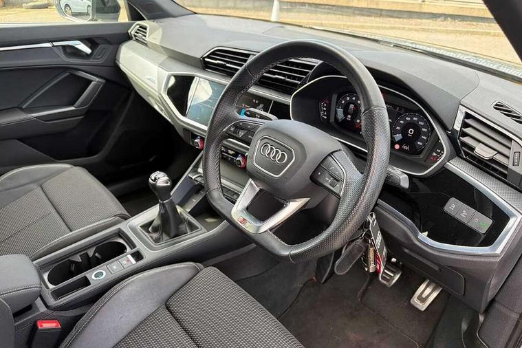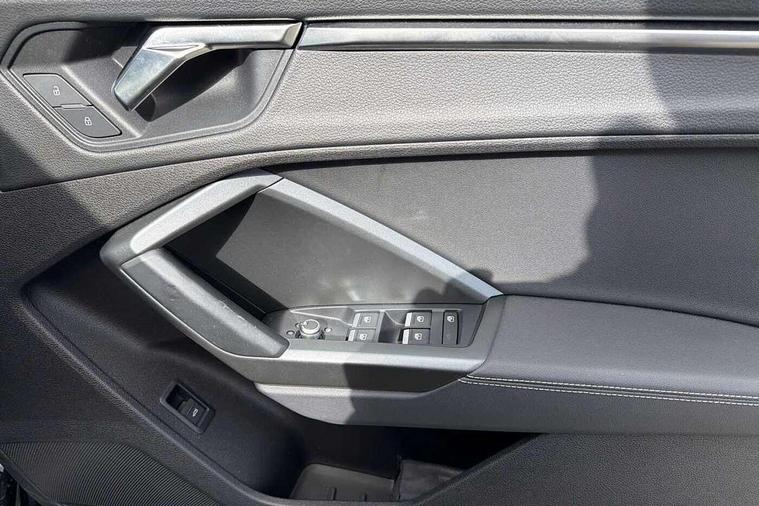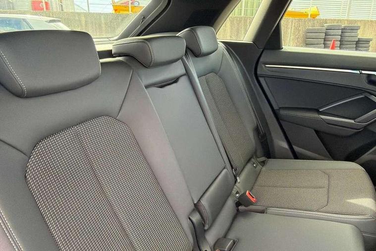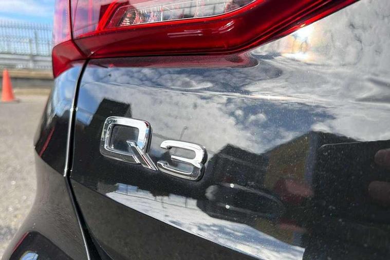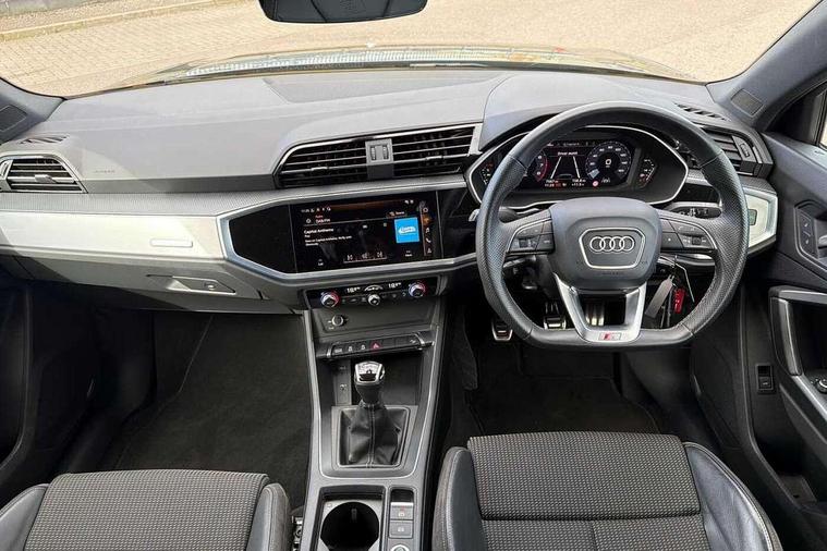 Amazon alexa Integration, Audi drive select, Audi lane departure warning, Audi Virtual Cockpit - 10.25" display, Bluetooth interface, Camera based traffic sign recognition, Cruise control + speed limiter, Legal emergency call, MMI Navigation Plus with high resolution 10.1 inch touchscreen colour display, Power operated tailgate, Progressive steering, Rear parking sensors, Service interval indicator, Smartphone interface includes wireless Apple carplay/Android Auto, Start stop system with recuperation, Voice control system with natural language interaction, Sports suspension, 2 USB-C ports with charge and data functions, 6 passive loudspeakers, DAB digital radio module, Acoustic windscreen, Aluminium roof rails, Aluminium window trim, Auto dimming frameless rear view mirror, Body coloured bumpers, Electrically folding, adjustable and heated door mirrors with integrated LED side indicators and kerb view function for passenger side, Front and rear electric windows, Front fog lights, Front side air inlets in matt platinum grey, Front spoiler blade in matt platinum grey, Grille vertical bars in aluminium silver/Matt, High gloss black finish B and C pillars, LED headlights with LED daytime running lights, LED rear lights, LED third brake light, Privacy glass dark tinted rear and rear-side windows (from B-pillar backwards), Rain and light sensors, Rear diffuser grille in grained matt black, Rear diffuser strip in matt titanium black, Rear side wing doors, Rear wiper, S line badges on front wings, S Line front and rear bumpers, Side skirt insert in matt Platinium grey, Titanium black radiator grille, Variable front intermittent wipers, 12V socket in rear centre console, 3 seat bench in 2nd row, 40:20:40 folding with manual adjustment for 60:40 forwards/backwards position and backrest angle, Adjustable rear seat bench/backrest with centre armrest and cupholder, Black cloth headlining, Dual zone electronic climate control, Front and rear black floor mats with contrast stitching in rock grey, Front and rear headrests, Front and rear roof module including reading lights, Front centre armrest, Glove compartment lighting, Height and reach adjustable steering wheel, Illuminated door sill trims with S logo, ISOFIX child seat mounting for front passenger with airbag deactivation and outer rear seat including top tether attachment point for outer rear seats, Luggage compartment light, Manual front seats with height adjustment, Perforated leather gearknob, Single front passenger seat, Stainless steel luggage compartment sill finisher, Stainless steel pedals, Non smoking pack - Q3, 3x3 point rear seatbelts, 6 airbags - Driver, front passenger, curtain and side windows, Audi pre-sense front with pedestrain and cyclist recognition, Electromechanical parking brake, Electronic stabilisation control including ABS, ASR and EDL, Front seatbelt reminder, Hill descent control, Hill hold assist, Manual child lock in rear doors, Pre sense basic, Seatbelt monitoring, Tyre pressure warning, Warning triangle and first aid kit, Anti theft alarm, Anti theft wheel bolts, Immobiliser, Remote central locking, Dark matt brushed aluminium inlay, Detail dashboard around MMI touch colour display in glass look, black with surround in aluminium look, Leatherette door armrest,