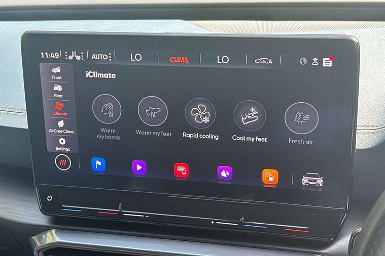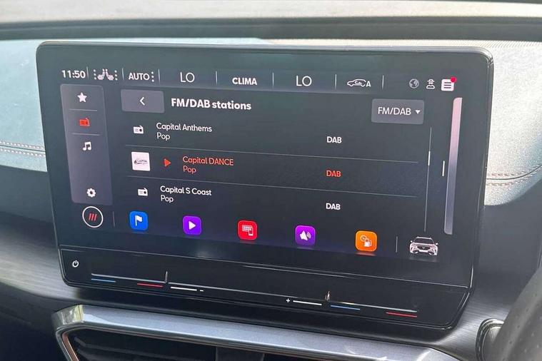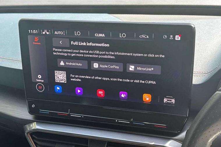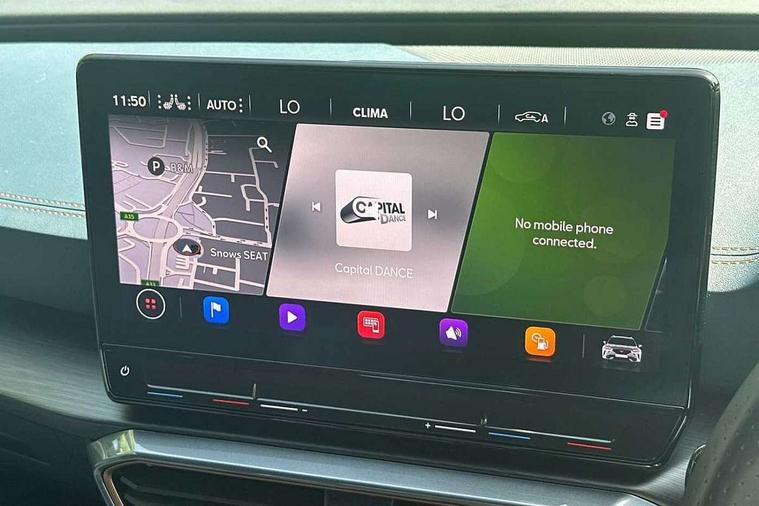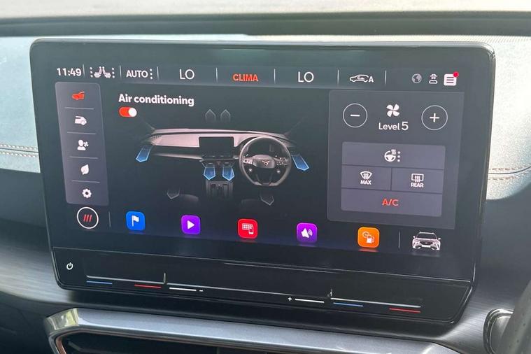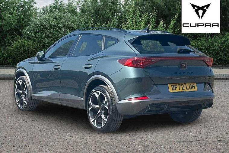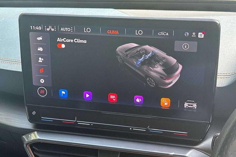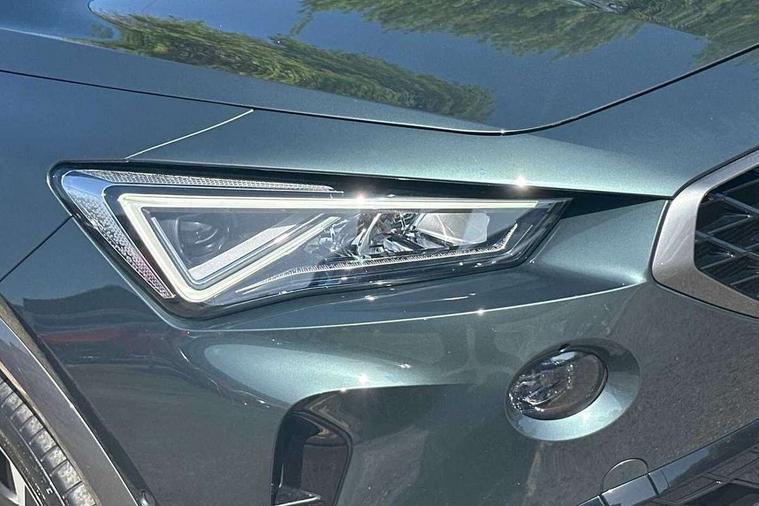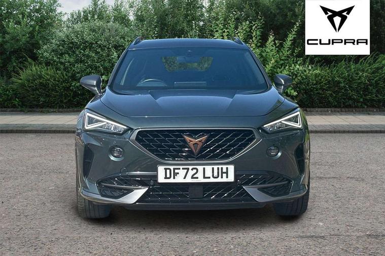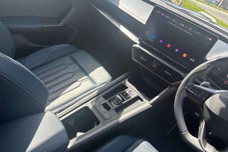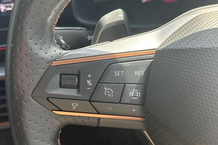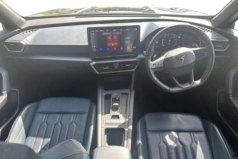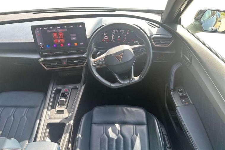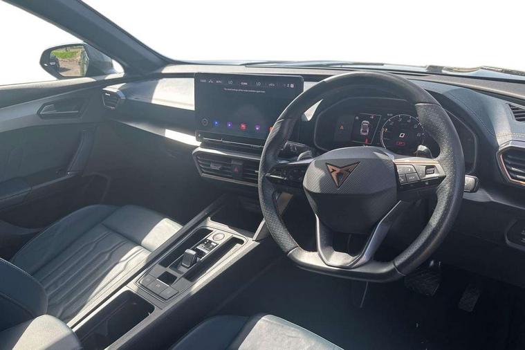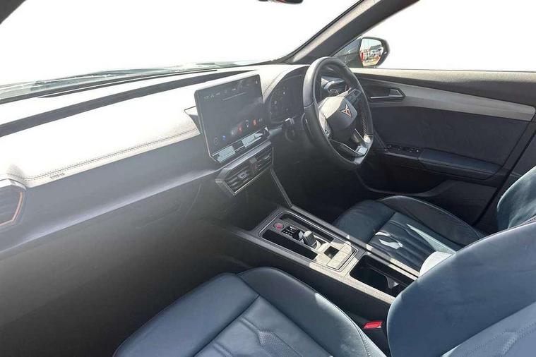 Digital cockpit and configurable dashboard, Driver alert system, Driving profile selection, Forward collision warning with automatic braking, Lane assist, Navigation system with 12'' Touchscreen Display, Park assist (inc front/rear parking sensors), PAS, Predictive adaptive cruise control with speed limiter, Rear view camera, RPM, trip computer, outside temp gauge, instrument light brightness, low fuel warning light, lights on reminder, gearshift indicator, Service interval indicator, Start/stop system with regenerative braking, Voice control system, Wireless apple carplay, Wireless phone charger, Electronic locking differential and dynamic traction support, Standard suspension, 2 front and 2 rear USB type C sockets, Auxiliary input socket, DAB radio, Auto dimming rear view mirror, Body colour door handles, Body coloured bumpers, Dark grey wing mirror, Daytime running light with automatic headlight control and coming home feature, Dynamic headlight range control, Electric front/rear windows, Electrically adjustable heated and folding door mirrors with memory function, Front fog lamps with cornering function, Gloss black roof rails and window surrounds, LED Headlights, LED Taillights with dynamic indicator, Rain sensing wipers, Rear diffuser with black simulated exhaust pipes, Rear side wing doors, Rear wash/wipe, Third brake light, Tinted rear windows, Welcome lights, 12v power supply in centre console, 12V socket, 12v socket in loadspace, 2 front and 2 rear reading lights, 230V socket, 3 seat bench in 2nd row, 60/40 split rear bench seat with armrest and mechanical seat release, Black headlining, Dust/pollen filter, Front and rear head restraints, Front centre armrest, Height/reach adjust steering wheel, Illuminated interior front door sills, Illuminated sunvisor with mirror, Isofix, Leather multi function heated steering wheel with gear shift paddles, Luggage tie-down hooks, Single front passenger seat, Three zone climate control with control panel in rear, Variable luggage/load compartment floor, Wraparound lighting, Genuine Nappa leather Pack - Cupra, 3 point seatbelts on all rear seats, ABS, Brake control system - ESC and brake booster, Child proof door locks, Driver and front passenger airbags with front passenger airbag de-activation, Electronic parking brake, Front and rear disc brakes, Front side curtain airbags, Hill hold control, Public e-call, Seat belt reminder for front and rear seats, Tyre pressure monitoring system, Anti theft alarm system, Keyless entry and start system (KESSY), Locking wheel bolts, Copper and aluminium interior detailing, 19" 'Exclusive' machined sport matte black and silver alloy wheels,