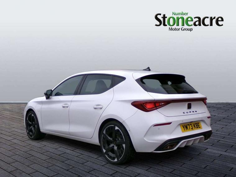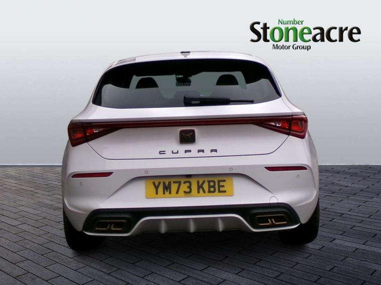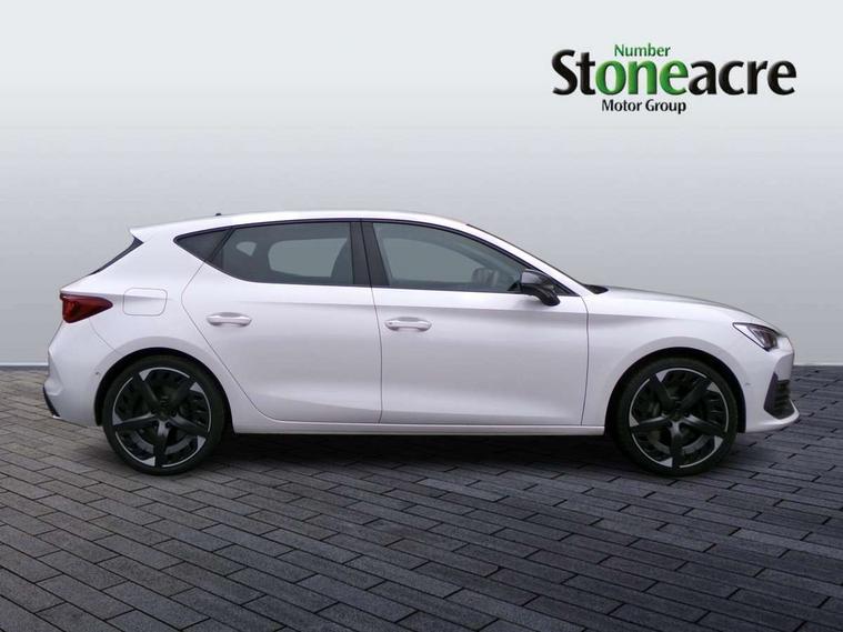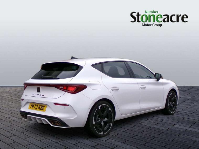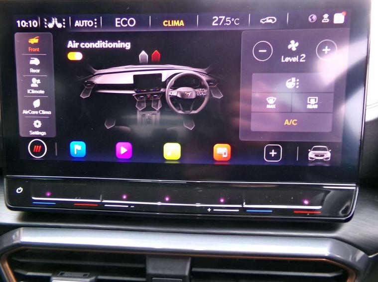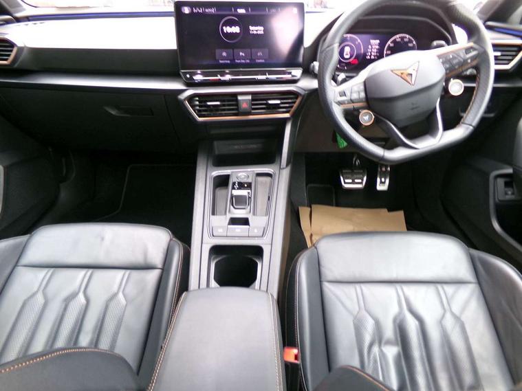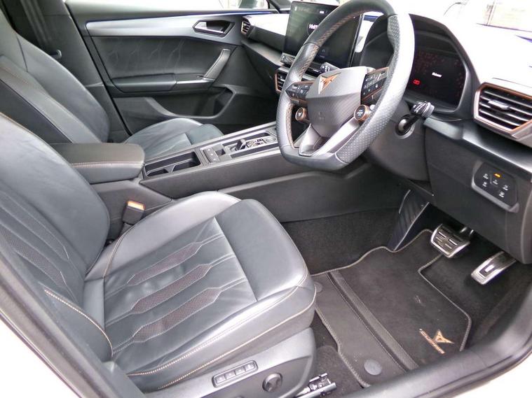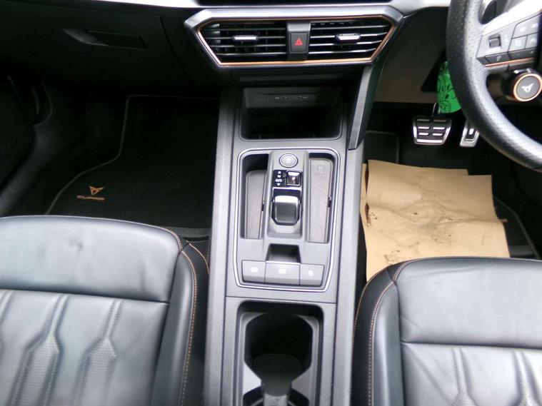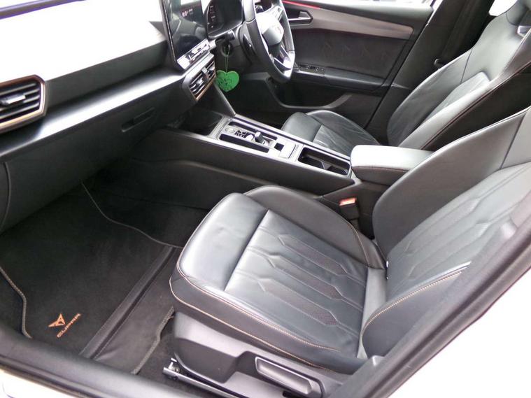 CUPRA drive profile selection with 4 modes (Comfort/Cupra/Sport/Individual), throttle response and gearshift mode, Digital cockpit, E-call, Front assist with forward collision warning braking reaction to vehicles, pedestrians and cyclists, Full link smartphone integration with Mirror Link, wireless Apple CarPlay and wired Google Android Auto, Lane assist, Lockable tailgate, Park assist (inc front/rear parking sensors), Rear view camera, RPM, trip computer, outside temp gauge, instrument light brightness, low fuel warning light, lights on reminder, gearshift indicator, Service interval indicator, Start/stop system with regenerative braking, Wireless phone charger, 10 amp mode 2 charging cable, 16 amp mode 3 charging cable, 3.6 kw On-board charger, Standard suspension, XDS electronic differential lock and dynamic traction support, Auxiliary input socket, Auto dimming rear view mirror, Body colour door handles, Body coloured bumpers, Cupra sports bumpers, Dark tinted rear windows, Electric front/rear windows, Electrically adjustable, heated and folding door mirrors, LED front fog lamps with cornering function, LED rear fog lamp, Matrix LED Headlights with variable light distribution, Matrix Beam and Dynamic headlight range control, Rain sensing wipers, Rear coast to coast lighting, Rear diffuser with twin exhaust pipe on each side with simulated exhausts, Rear side wing doors, Rear wash/wipe, Separate daytime running light with automatic headlight control and coming home feature, Third brake light, 12v power supply in centre console, 3 seat bench in 2nd row, 5 headrests, 60/40 split rear bench seat with armrest, Ambient lighting (glovebox, footwell, ambient lighting multicoloured), Black headlining, Cupra sports pedals, CUPRA Supersports, heated steering wheel with satellite buttons, Dust/pollen filter, Folding boot cover, Four x USB Type C ports, Front and rear reading lights X 4, Front centre armrest, Heated front seats, Height/reach adjust steering wheel, Illuminated interior front door sills, Interior wraparound lighting, ISOFIX points in outer rear seats with top tether anchorage points, Luggage tie-down hooks, Nappa leather upholstery, Powered driver seat with memory and manual height adjustment for passenger, Powered lumbar adjustment on driver side, manual on passenger side, Single front passenger seat, Sports bucket seats, Storage pockets on rear of front seats, Sunvisors with illuminated mirror, Three zone climate control, Dynamic and comfort pack - Leon Cupra, Media system plus with navigation pack - Leon Cupra, Safety and driving pack (XL) - Cupra leon, 3 point seatbelts on all rear seats, ABS, Brake control system - ESC and brake booster, Child proof door locks, Cupra black brake calipers, Driver and front passenger airbags with front passenger airbag de-activation, front side and curtain airbags, Electronic parking brake, Extended safety system - seat belt tensioner, window closure and hazard lights, Hill hold control, Rear disc brakes, Seat belt reminder for front and rear seats, Tiredness recognition system, Tyre pressure monitoring system, Anti theft alarm system with interior monitoring in cab, backup horn and towing protection, KESSY Advanced - Keyless start, keyless entry, Locking wheel bolts, Chrome and copper interior detailing, Copper stitching on dashboard trim, 19" Aerodynamic machined sport black and silver alloy wheels with 91Y tyres, Breakdown kit, Tool kit,