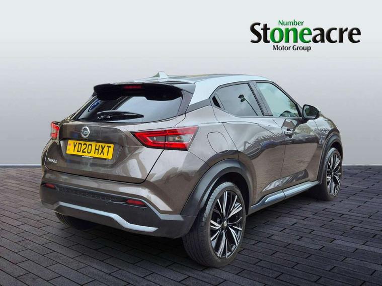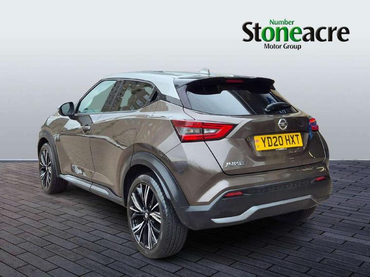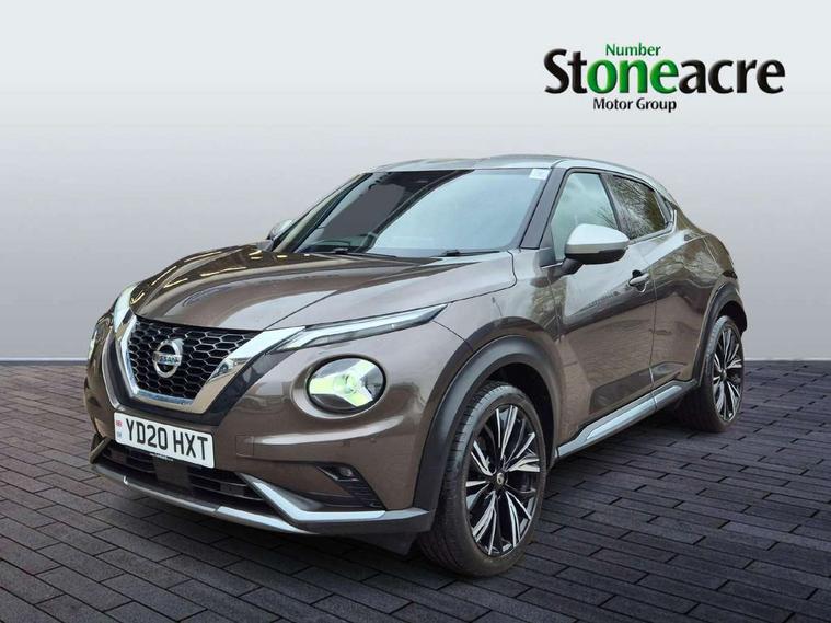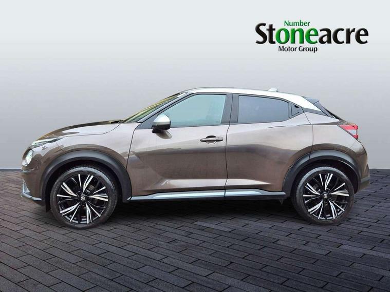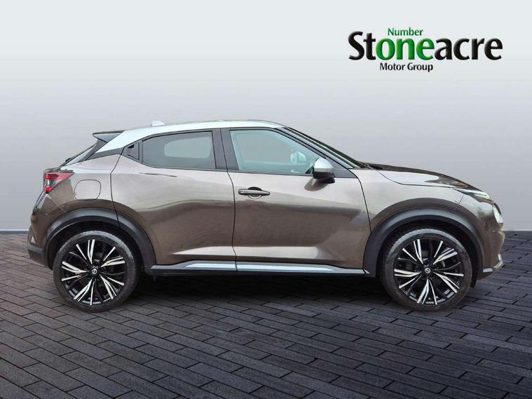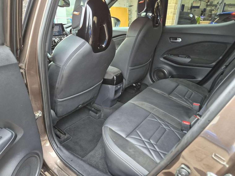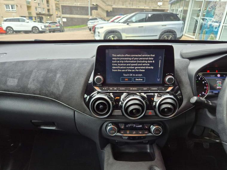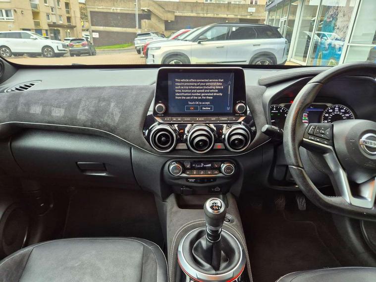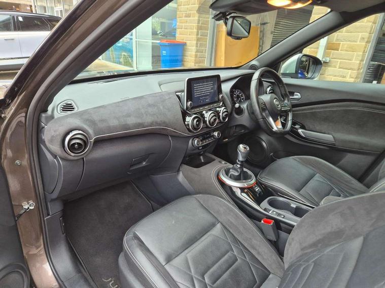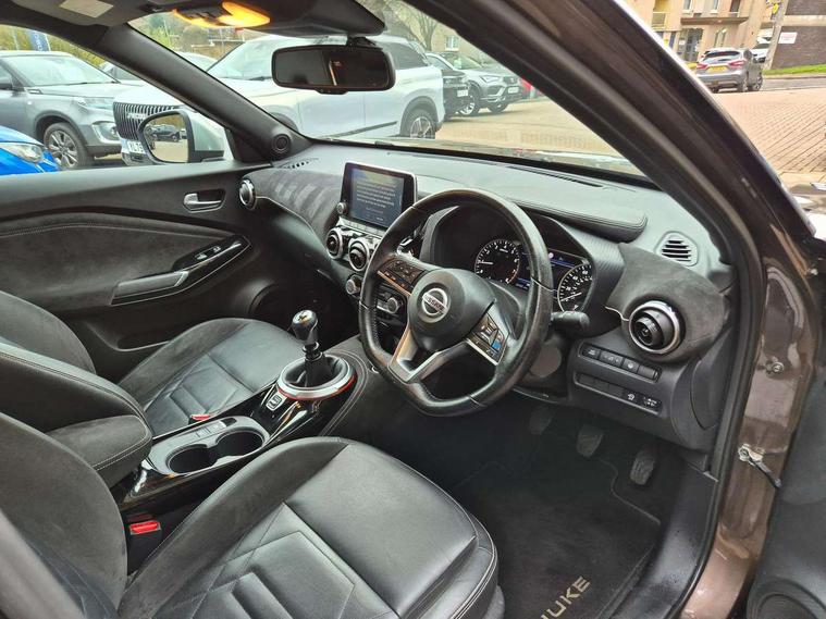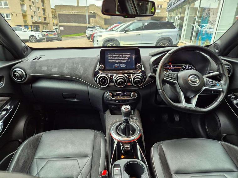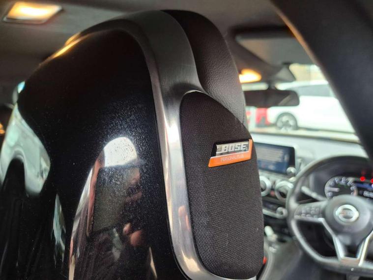 7" full colour TFT screen combimeter, 8" infotainment colour display with touch screen, Apple CarPlay and Google Android auto, Drive modes select (Eco, normal and sport), Emergency and breakdown call, Front parking sensor, Idle start/stop system, Intelligent lane intervention, Lane departure warning system, Nissan connect nav with TomTom traffic, Nissan connect services and Wifi connection, Outside temperature sensor, Power Steering, Rear parking sensor, Traffic sign recognition, Trip computer, Gasoline particulate filter, Bluetooth system, USB, Aux-in and 12V socket, Bose personal plus audio system with 8 speakers(4 speakers and 2 headrest speaker for driver and passenger seats), Bose personal sound stage control, DAB Digital radio, Front lower bumper painted in silver finisher, Rear console USB port, Auto dimming interior rear view mirror, Automatic hazard signal with emergency stop signal, Body colour bumpers, Body colour door handles, Electrically adjustable door mirrors with integrated indicators, Follow me home headlights, Front and rear electric window with one touch driver and passenger window, Heated and auto folding door mirrors, High beam assist, LED daytime running lights, LED front fog lights, LED headlamps, LED rear fog lamp, LED rear lamps, Rain sensor windscreen wipers, Rear privacy glass, Rear spoiler, Rear wiper, Thermaclear heated windscreen, Three blink turn signal, 3 height adjustable rear headrests, 60/40 split folding rear seat, Automatic climate control, Card holder on driver sunvisor, Door ambient lighting, Driver and passenger sliding and reclining seats, Driver seat back pocket, Driver side rear coat hanger, Driver/passenger sunvisors and illuminated vanity mirrors, Front and rear cabin lighting, Front armrest, Front door pockets with bottle holders, Front head restraints, Front passenger isofix child seat anchorage point, Front/rear passenger grab handles, Gear console ambient circle lighting, Grey synthetic leather kneepad, Heated front seats, Height adjustable driver's seat, Height adjustable passenger seat, Internal chrome door handles, Leather gearshift knob, Leather steering wheel, Luggage board, Luggage space lighting, Monoform sporty seats, Multifunction steering wheel, Passenger seat back pocket, Rear door bottle holders, Telescopic steering wheel adjustment, Two cupholders in front centre console, Two rear isofix child seat anchorage points with top tether, Voice recognition switch on steering wheel, Welcome light and console tray ambient lighting, Advanced safety shield pack - Juke, ABS with EBD and brake assist, Active ride control, Active Trace Control, Driver and passenger airbags, Driver and passenger side airbags, Electric handbrake with auto hold function, Electronic Stability Programme (ESP), Front and rear curtain airbags, Height adjustable seatbelts, Hill start assist, Intelligent emergency braking with pedestrian and cyclist recognition, Seatbelt reminder for driver/front passenger and rear seats, Single tone horn, Three 3 point rear seatbelts, Traction control, Tyre pressure monitoring system, VDC Dynamic Vehicle Control, Ventilated rear brake discs, Alarm, Immobiliser, Intelligent Key with push button starter, Remote central locking, 19" Akari alloy wheels,