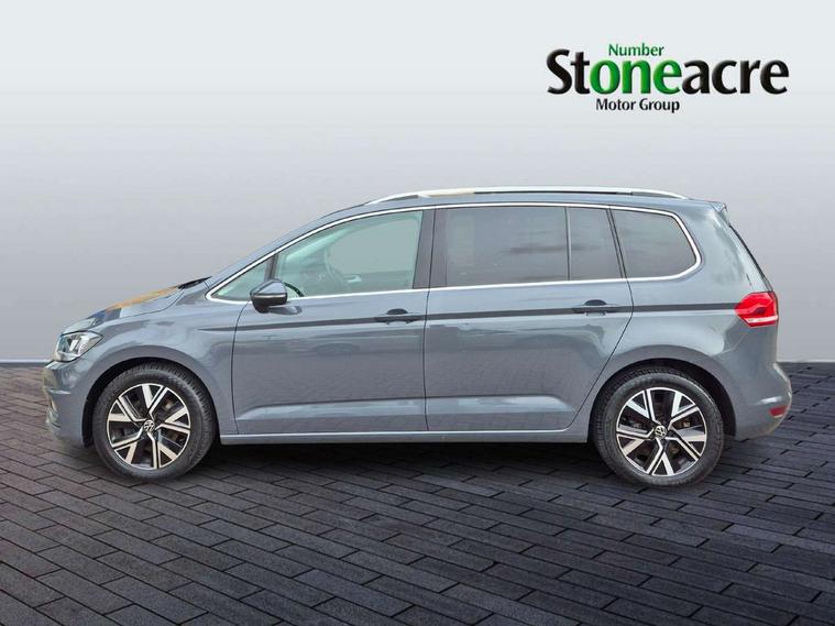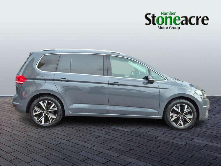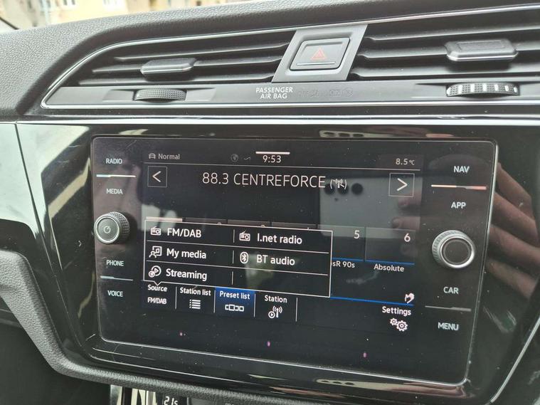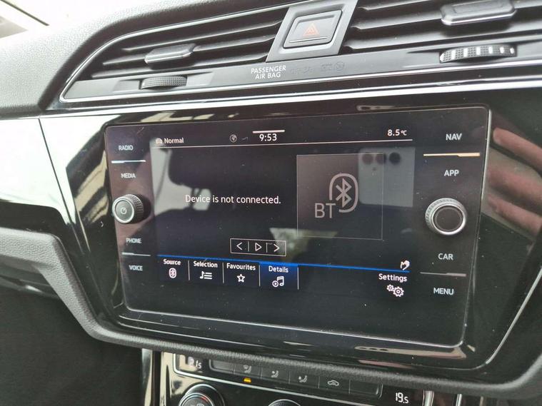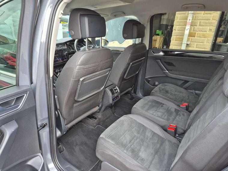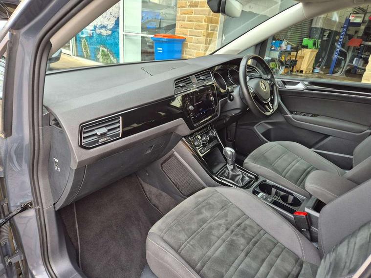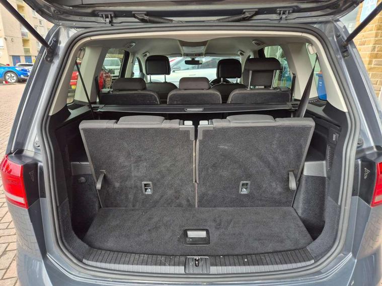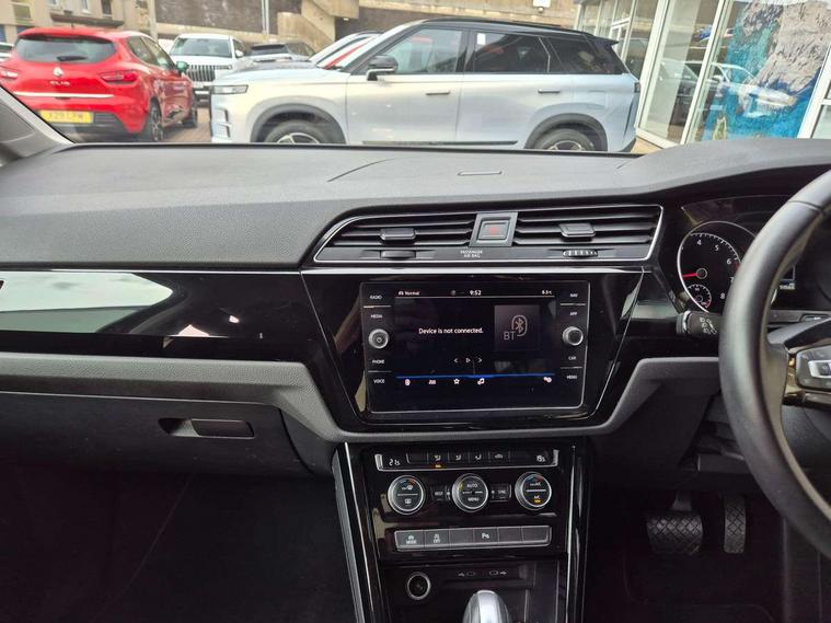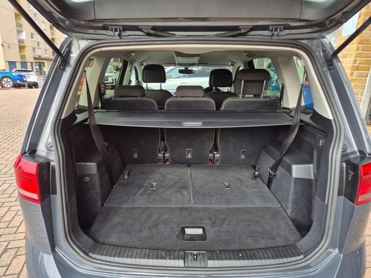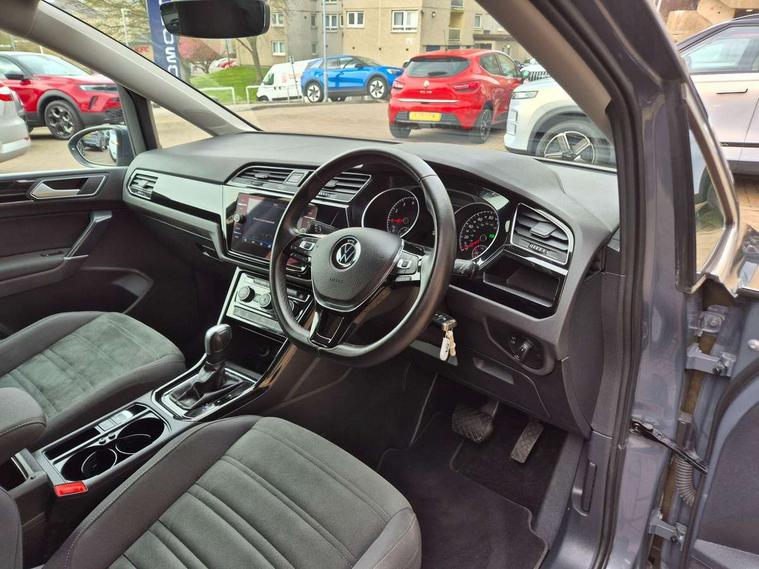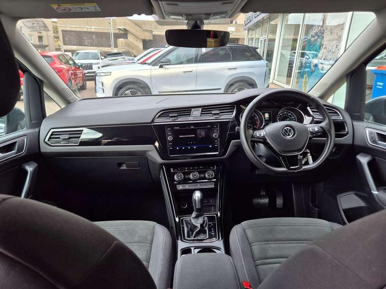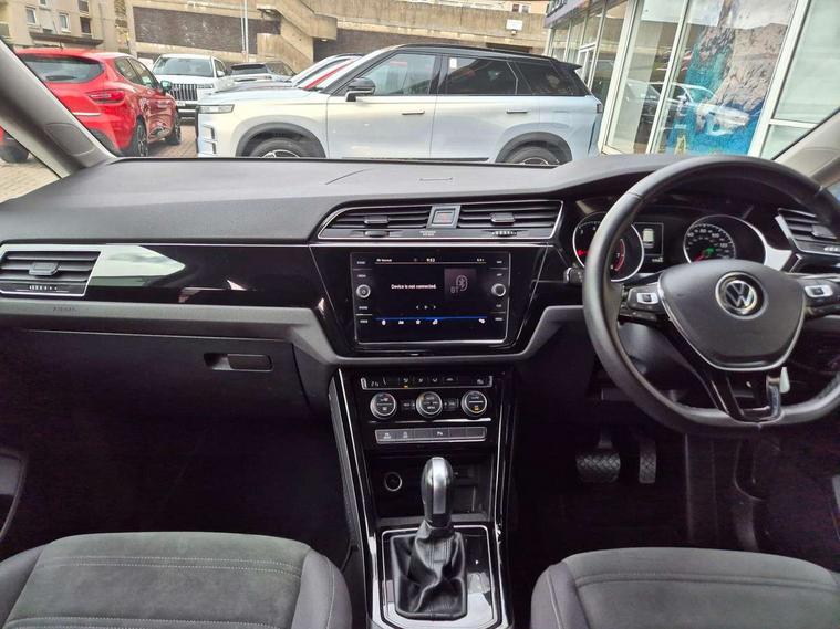 Adaptive cruise control, Audible lights on warning, Bluetooth telephone connectivity, Car information display, Driver alert system, Driver electronic voice amplification function, Electronic odometer, External temperature gauge, Flat tyre indicator, Mobile pairing with SMS function, Multifunction colour display, Rev counter with fuel gauge, Speed limiter, Speed sensitive power steering, Stop/start system, Think blue trainer driver tips and journey analysis, Trip and service interval display, Petrol Particulate Filter, XDS electronic differential lock, 4x20 watt output, Audio Connectivity System, DAB Digital radio, MP3/WMA compatability, SD card slot, Title and cover art display, USB connection, Aerial integrated into side window, Body colour bumpers, Body colour door handles, Body colour door mirrors with integral indicators, Chrome fog light surround, Chrome lower front bumper insert, Chrome trimmed front air intake surrounds, Chrome trimmed radiator grille louvre inserts, Chrome trimmed side windows, Dusk sensor + auto driving lights, Electric folding door mirrors with reverse activated kerb-view adjustment on passenger's door mirror, Front and rear electric windows, Front fog lights with static cornering function, Fully galvanised body, Gloss black finish B pillar, Green tinted heat insulating glass, High level third brake light, Rear tinted glass from B-pillar backwards approx 65% tinted, Rear wash/wipe with intermittent wipe setting, Silver roof rails, Tailgate wiper- reverse gear activation, Twin chrome exhaust tailpipes, Volkswagen roundel, Windscreen wipers intermittent wipe, 12V power point for Row 2, 12V socket in luggage compartment, 2 individual fold flat 3rd row seats, 2 three point seatbelts in 3rd row, 2nd row centre armrest, 2nd row centre seat converts into table, 3 single slide/fold/removable 2nd row seats, 3 spoke steering wheel, 3 Zone electronic climate control with automatic air recirculation, 3x3 point seatbelts on 2nd row with height adjust on outer seats, 4 boot load lashing points, 4 way adjustable front head restraints, 5 headrests, Ambient lighting in door trim and foot well, Driver and front passenger under seat drawer, Dust/pollen filters, Foldable front passenger seat backrest, Front + rear carpet mats, Front and rear reading lights, Front centre armrest with storage compartment, Front cupholders x 2, Front seat storage pockets, Front seatback folding tables, Height adjustable driver's seat, Height/reach adjust steering wheel, Illuminated glovebox, Illuminated vanity mirrors, Instrument lighting white adjustable panel illumination with red night time illumination, Interior light with delay, Isofix on 2nd row outer seats, Isofix on 3rd row seats, Large storage compartment in roof console, Leatherette on rear of front seats, Low tunnel 2nd row seat, Media box in dashboard on passenger side, Multi storage in passenger/luggage areas, Multi-function centre console with storage facilities, Retractable luggage cover, Split folding rear seat backrests, Storage bins on all doors, Convenience Pack - Touran, Mirror pack - Touran, 3 point height adjustable front seatbelts, Auto hold function, Automatic post collision braking system, Door open warning reflectors, Driver/Front Passenger airbags, Drivers knee airbag, EDL + ASR, Electronic parking brake, Energy recovery system, ESC with ABS, First aid kit, Front and rear (row 2) curtain airbags, Front assist including city emergency braking, Front seat side impact airbags, Front/rear disc brakes, Hill hold control, Hydraulic Brake Assist (HBA), Loose wheel warning function, Manual passenger airbag deactivation function, Pre crash preventive occupant protection, Seatbelt warning lamp and buzzer, Traction control, Two tone horn, Warning triangle, Alarm with remote central locking and interior protection, Electronic engine immobiliser, Chrome plated instrument surrounds, Piano black decorative inserts, Tyre mobility system,
