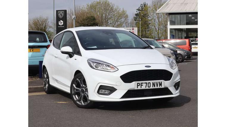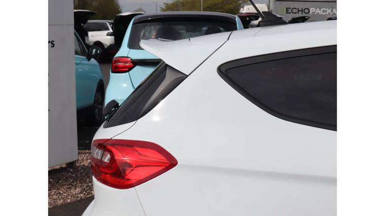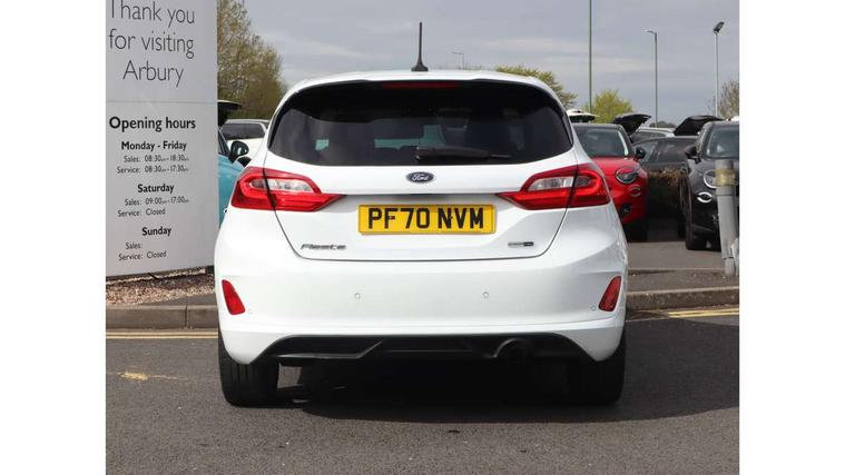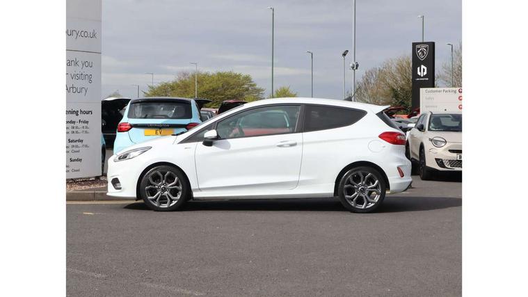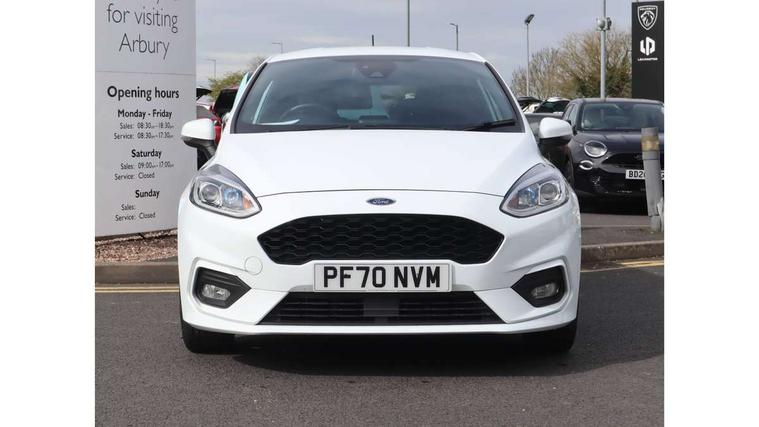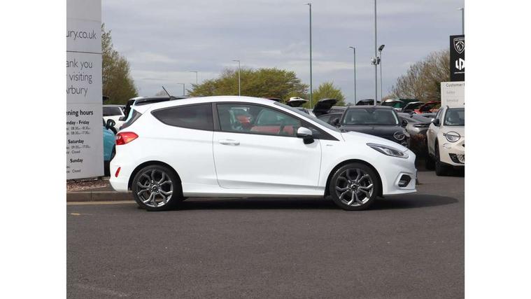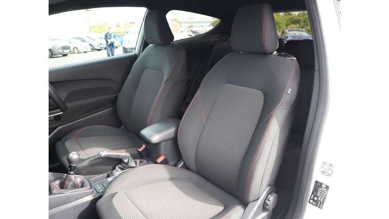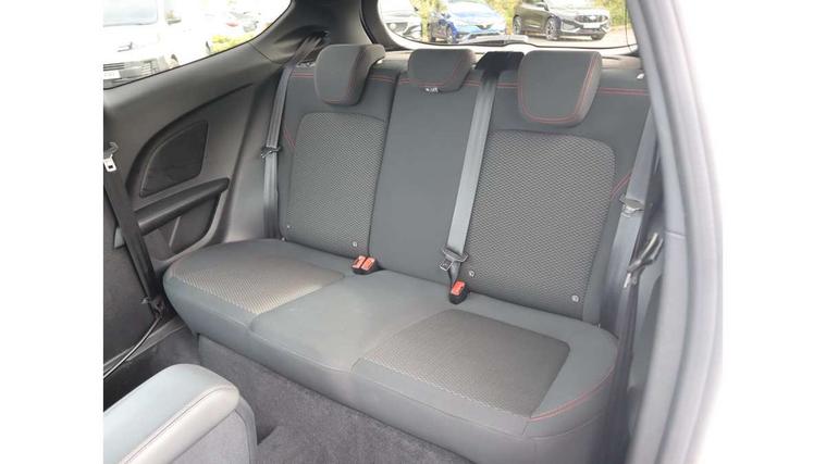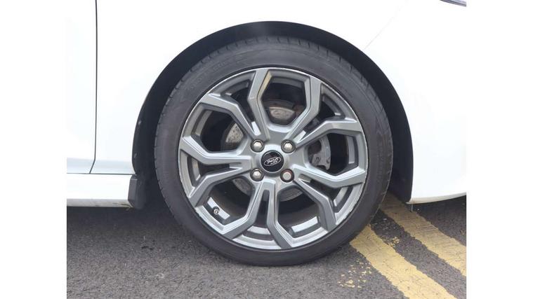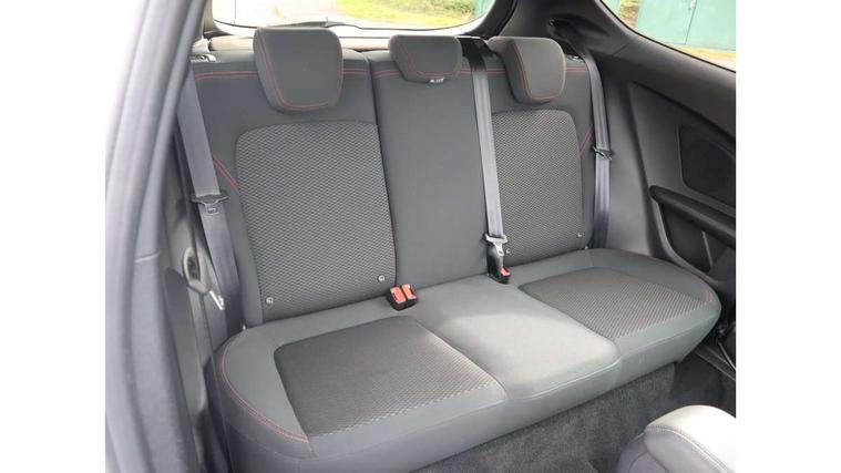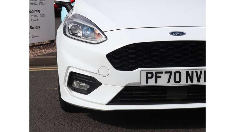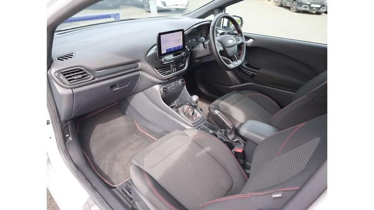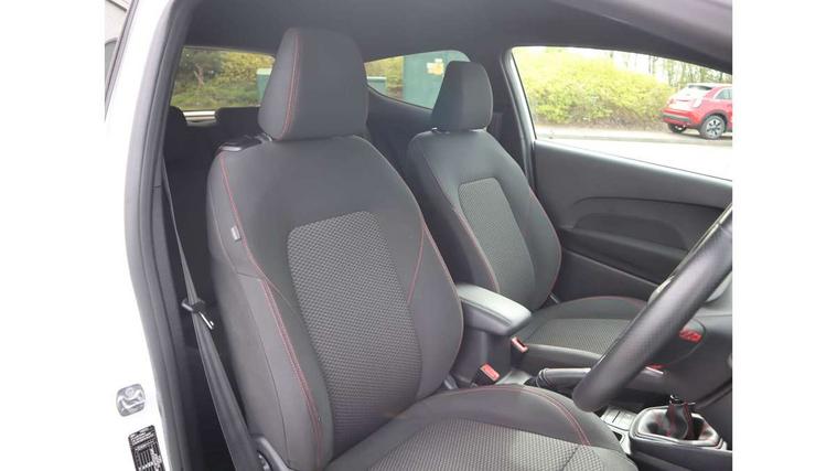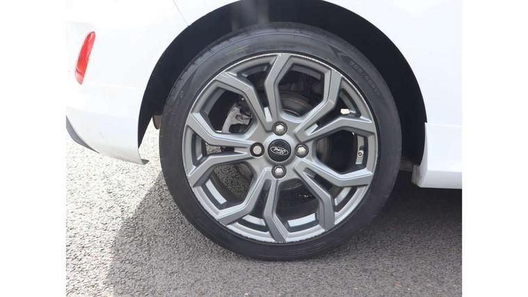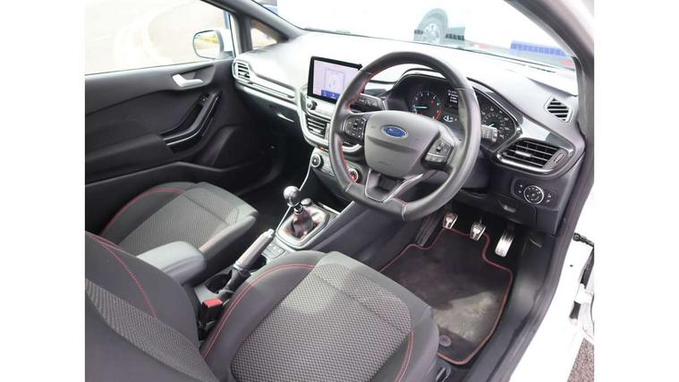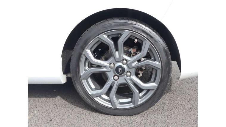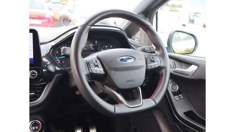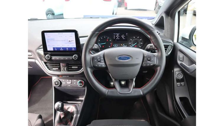 Bluetooth system, Electric power steering, Ford easy fuel, Ford SYNC 3 Navigation system incl 8" touchscreen, 7 speakers, FordPass connect, Apple carplay, android auto, voice control and emergency assistance, Rear parking distance sensors, Trip computer, Sports suspension, 2 USB ports, Auxiliary input socket, DAB Digital radio, Steering wheel mounted controls, Body colour bumpers, Body colour door handles, Body colour large rear spoiler, Body coloured electrically operated and heated door mirrors with side indicators, Cornering front fog lights, Electric front windows/one touch facility, LED Night signature to rear lights, Power foldable door mirrors with puddle lights, Quickclear heated windscreen, Rain sensing wipers and auto dimming rear view mirror, Rear privacy glass, Rear wiper, Unique ST-Line upper grille & full bodystyling kit with ST-Line wing badges, 12V Accessory socket in centre console, 3 spoke flat bottomed leather steering wheel, 60/40 split folding rear seat, Adjustable head restraints, Black headlining, Boot carpet, Centre console with armrest and illuminated cupholders, Chrome inner door handles, Cloth upholstery, Footwell illumination, Front floor mats, Front map reading lights, Front seat and rear pockets, Height adjustable driver's seat, Illuminated glovebox, LED ambient lighting, Load area light, Manual air conditioning, Overhead console with sunglasses holder, Pollen filter, Rake/reach adjustable steering wheel, Sensico leather steering wheel/gear knob/handbrake, Sports front seats, Sports pedals, NCAP Pack - Fiesta, 3 point seatbelts on all rear seats, ABS+EBA, Curtain airbags, Driver and passenger airbags, Drivers knee airbag, Electronic stability control with hill start assist, Front passenger airbag deactivation, Front side airbags, Seatbelt warning, Two tone horn, Tyre pressure monitoring system, Keyless start with 'Ford Power' starter button, MyKey system, Remote central locking & engine immobiliser, Thatcham Cat.1 alarm, 17" 5 spoke alloy wheels with rock metallic finish,