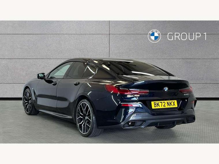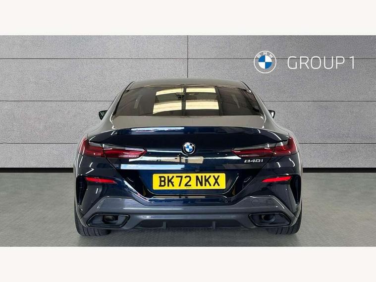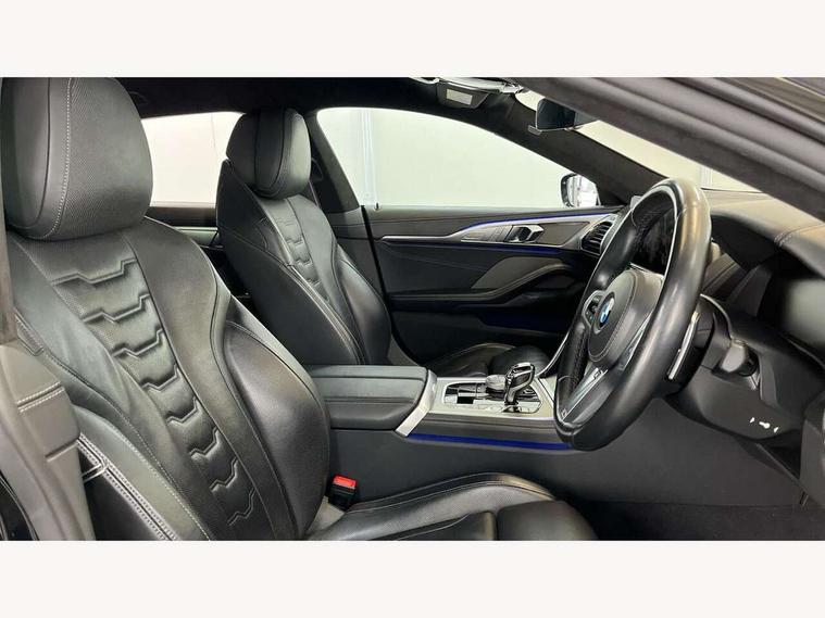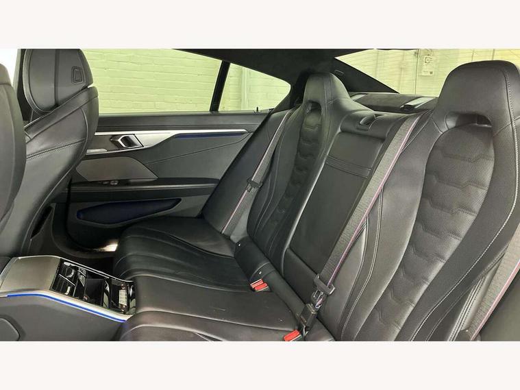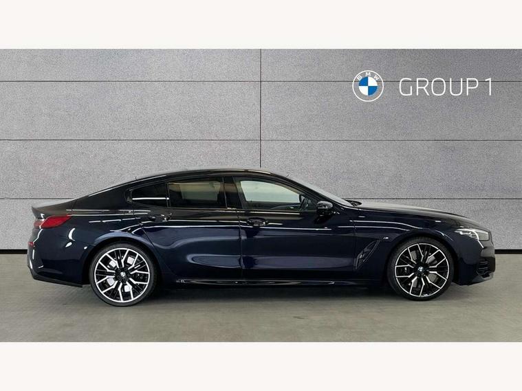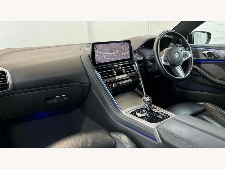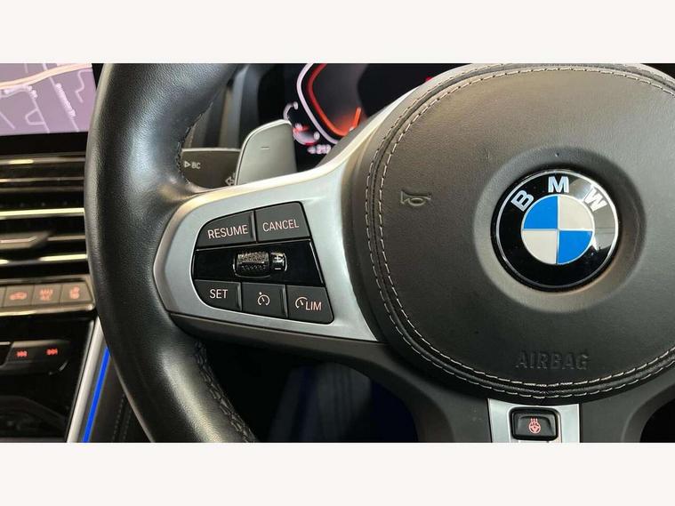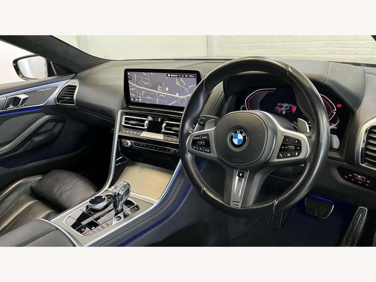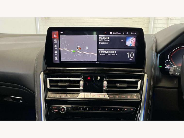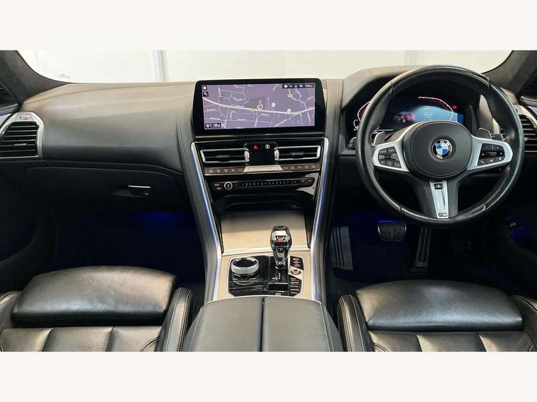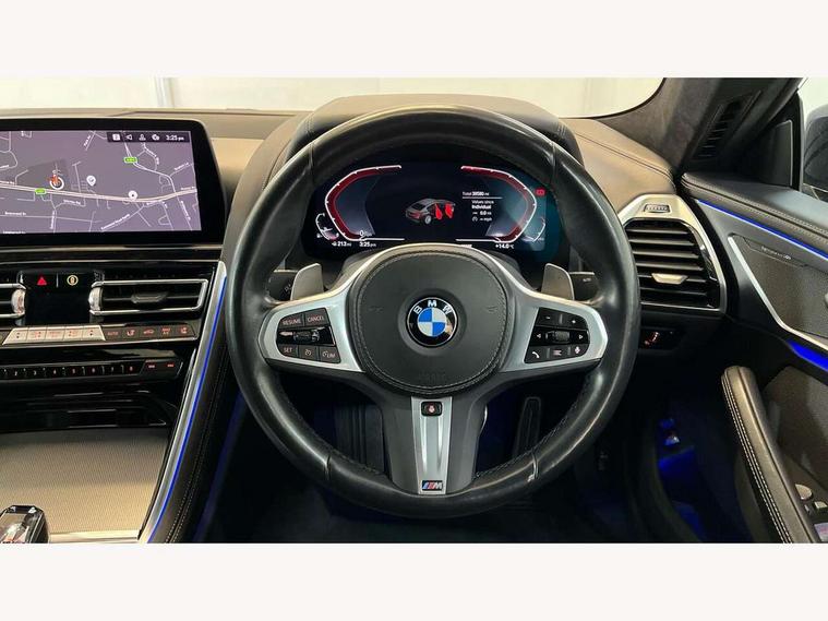 Automatic tailgate operation, remote opening with key, closing by tailgate button or remote control including tailgate in LED technology, Bluetooth hands free facility with USB audio interface, voice control and enhanced bluetooth + Wireless charging, BMW ConnectedDrive online services, BMW legal emergency call, BMW Teleservices, Brake pad wear indicator, Check control system, Condition based service, Drive experience control with Sport, Comfort, Eco Pro and Adaptive modes, Electric bootlid, Head up Display, iDrive controller with shortcut buttons, Instrument and upper door panel in walknappa leather, Integrated owners handbook, Light on warning, Oil sensor for level and grade, On board computer, Outside temperature display, Run flat indicator, Service interval indicator, Servotronic system, Speed limiter, Wi-Fi hotspot, Adaptive M suspension, Double wishbone front axle, Dynamic Damper Control, Eight speed sport automatic transmission, M Sport differential, Petrol Particulate Filter, Sport exhaust system, DAB Digital radio, Favourite buttons, Air breather inlay in pearl chrome, frame in black high gloss, Automatic windscreen wipers and automatic headlight, Carbon core, Climate comfort windscreen, Daytime driving lights front and rear active, Dynamic brake lights, Exterior mirrors - Floating design mirror, electric adjust/heated/folding, aspherical, Follow me home headlight function, Frameless interior mirror, Front and rear bumper system with replaceable deformation elements, Front electric windows, Front ornamental grille with kidney grille bars, Heated rear window, glass, Heated windscreen washer jets, High beam assistant, Illuminated door handles, LED rear lights, M emblem on front side panel in light chrome, Model logo on right tailgate, Radiator grille frame in pearl chrome, Radiator grille struts in aluminium matt, Rain sensor and automatic driving lights control, Rear boot, Rear side wing doors, sDrive designation on left tailgate, Sun protection glass, Thermally insulated windscreen, Third LED technology brake light in rear window, Welcome lights in interior and door handle area, Window frame and mirror base in black high gloss, 2 cup holders in front, 2 rear head restraints, 2 X front 12v power sockets, 3 spoke M sport leather multifunction steering wheel with shift paddle, 4 zone control automatic air conditioning, 5 seats, 50/50 split folding rear seat, Ambient light with dynamic interior light, BMW ID, Front and rear seat heating, Front centre armrest with light, 12V socket and USB and storage compartment, Front door pockets, Front entry lights doors, Front reading lights, Front sun visors with ticket holder and illuminated mirror, Interior lighting - Interior light front centre above interior mirror, luggage compartment light, automatic interior light system soft on/soft off, Lashing eyelets, Lockable glove compartment with light, Microfilter and active carbon filter, Steering column with adjustable height and length and activation via control on the steering column, Through loading function, BMW Live cockpit professional pack - 8 Series, Connected professional pack - 8 Series, Exterior items pack - 8 Series, M sport exterior styling aerodynamics pack - 8 Series, 18" M Sport braking system with blue painted brake calipers, 3x3 point rear seatbelts, ABS/EBD, Active protection, Airbags - Driver and front passenger airbag with seat occupancy detection, knee, side and front passenger seat airbag deactivation, Brake discs, compound structure, Child locks on rear doors, Cornering brake control (CBC), Crash sensor activating central locking release, hazard warning lights, fuel cut off, interior lighting, safety battery terminal clamp and airbags, DSC - Dynamic Stability Control, Dynamic brake control, Dynamic Traction Control - DTC, Electromechanical parking brake with automatic drive away release and auto hold function, Front three point with pyrotechnical belt latch tensioner seat belts, belt force limiter and belt stopper, Head airbags for 1st and 2nd seat row, Hill start assist, Integrated brake system, ISOFIX child seat mounting for the two outer rear seats, Rear three point with pyrotechnical belt latch tensioner seat belts and belt force limiter, Side impact protection, Tyre pressure monitoring system (TPMS), Warning triangle and first aid kit, Alarm system (Thatcham 1) with electronic engine immobiliser, Centre lock switch, Closing system with central locking, Comfort access system, Keyless entry with start/stop button, Locking wheel bolts, Vehicle key with exclusive M designation,