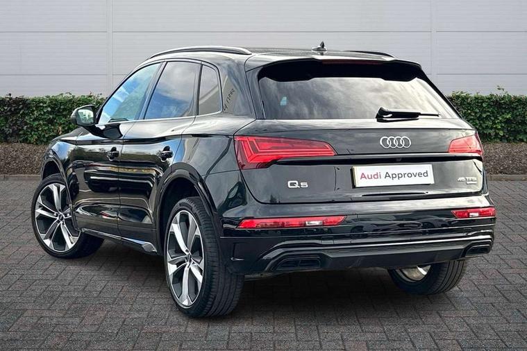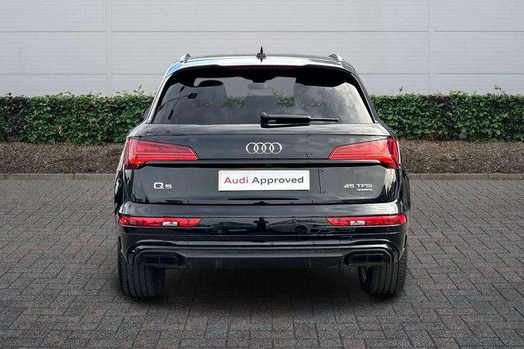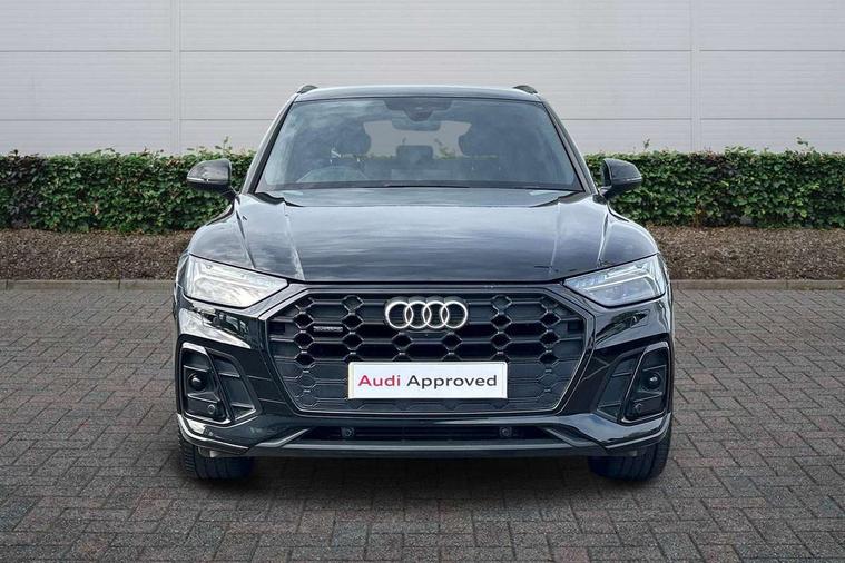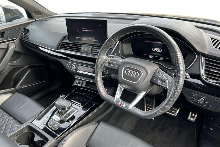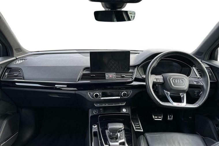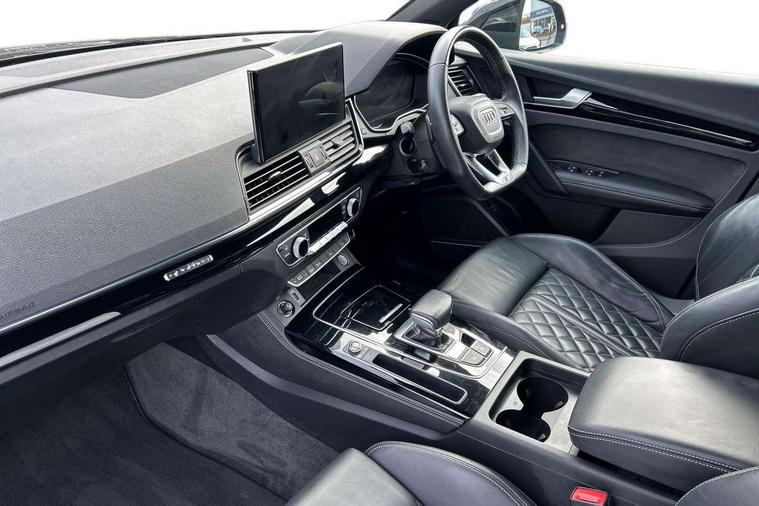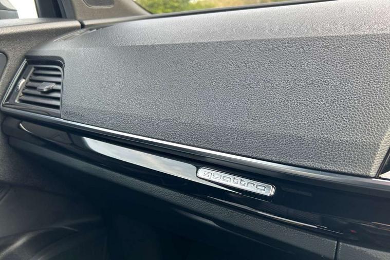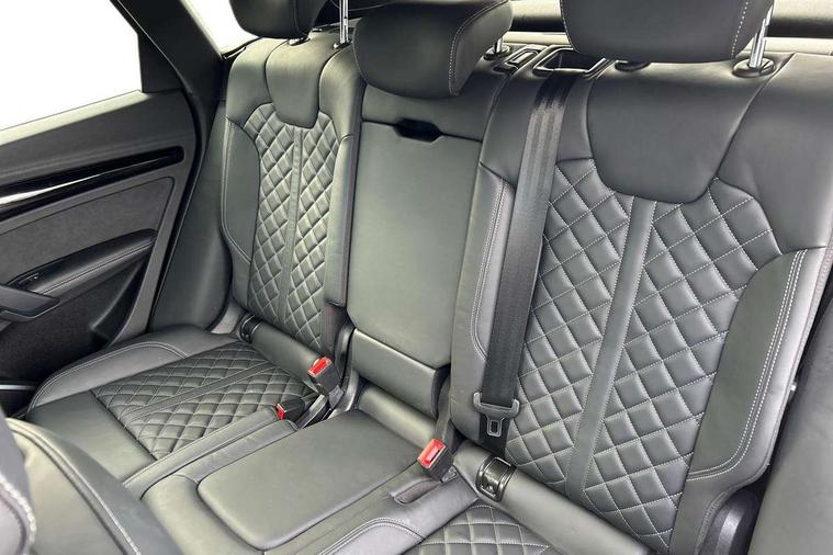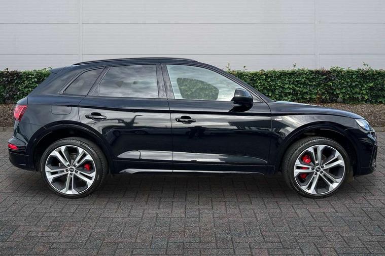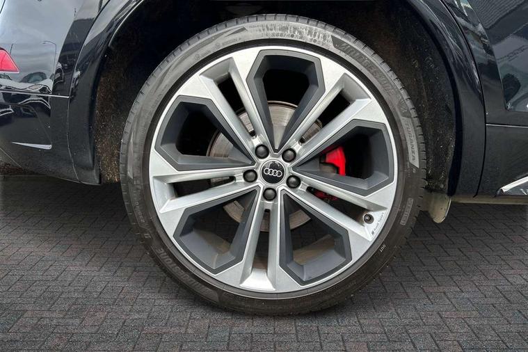 Audi connect safety and service (e-call), Audi connect with Amazon Alexa Integration, Audi drive select, Audi virtual cockpit plus with 12.3" screen and three different layout designs, Audi wireless smartphone interface, Automatic start-stop system with coasting functionality and efficiency programme, Bluetooth interface, Electro - mechanical power assisted steering, MMI navigation plus with 10.1" touch screen, Power tailgate, Reversing camera, Service interval indicator, Voice control system with Audi hotword activation "Hey Audi", Quattro on demand, S line sports suspension, DAB Digital radio, Acoustic windscreen, Audi matrix LED headlights with dynamic front and rear indicators, Audi rings at front and rear in black, Audi rings decal on rear doors, Auto dimming door mirrors, Auto dimming rear view mirror, Automatic headlights and windscreen wipers, Black door mirrors, Black roof rails, Body colour bumpers, Body colour underbody protection, Chrome plated exhaust trims, Daytime running lights, Door sills in Selenite silver, Electric adjustable/heated/folding door mirrors, Front air inlet surrounds in titanium black, Front and rear electric windows, Headlight washers, High gloss black B pillar trims and triangular rear door trim, High level LED brake light, Rear chrome trim strip below lights, Rear privacy glass and rear side windows, Rear side wing doors, Rear wiper, Roof bars, S Line rear spoiler, 2 x USB charging port with aux input socket, 3 rear headrests, 4 way electric lumbar support for driver and front passenger, 40:20:40 split folding 3 rear bench seat in 2nd row with rear centre armrest, Black cloth headlining, Comfort front centre armrest, Contrast stitching on seats, steering wheel and gear lever gaiter, Deluxe 3 zone electronic climate control, Electrically adjustable front seats, Fine Nappa leather upholstery with diamond pattern contrast stitching + front sport seats with S embossed logo, Front/rear floor mats, Gear lever in black leather, Heated front seats, Height adjustable front head restraints, Height/reach adjustable steering column, Illuminated door sill trims with S logo, ISOFIX child seat mounting and top tether, Rear seat bench plus, Removable luggage compartment floor, Single front passenger seat, Stainless steel pedals, Sunvisors with vanity mirrors, Black styling package - Q5 Edition 1, Extended interior upholstery pack - Q5, Extended LED Interior multi coloured Lighting Pack - Q5, 3 point seatbelts on all seats, 6 airbags - Driver, front passenger, curtain and side airbags, Electrically operated child locks on rear doors, Electromechanical parking brake, Electronic stabilisation control including ABS, ASR and EDL, Front and rear brake calipers painted in red, Front passenger airbag deactivation, Hill descent control, Hill hold assist, Multi collision brake assist, Pop-up bonnet for pedestrian protection, Pre sense city, Seat belt force limiter, Seatbelt monitoring, Tyre pressure warning, Warning triangle and first aid kit, Anti theft alarm, Anti-theft wheel bolts, Keyless Go access/ignition system, Remote central locking, Piano black finish inlay,