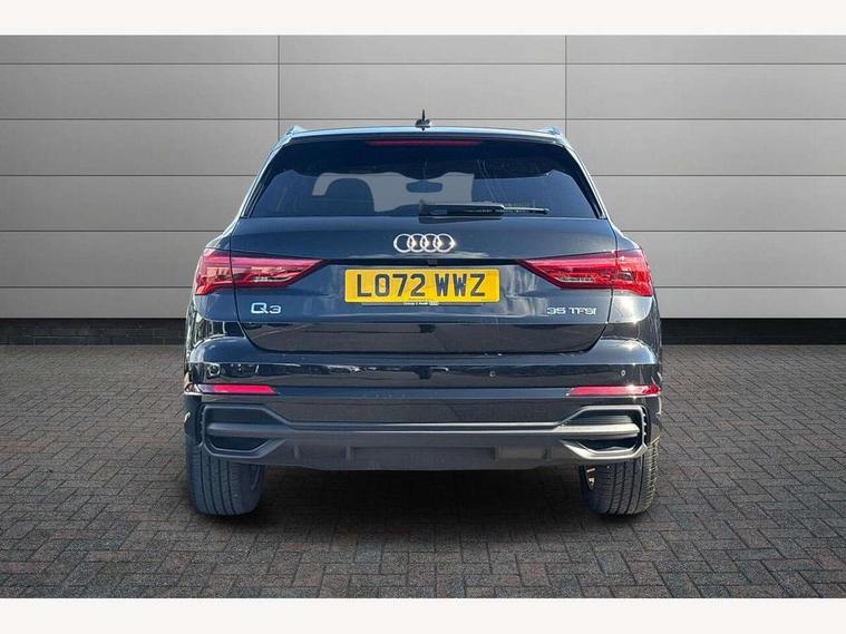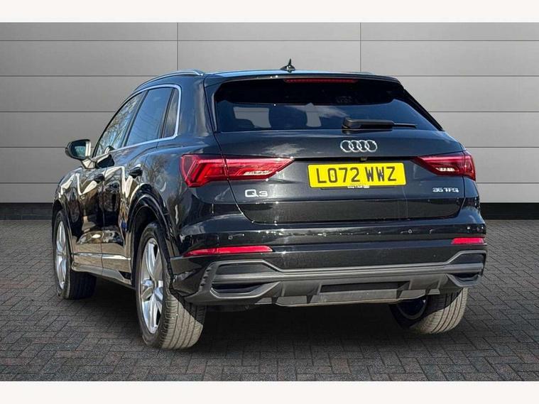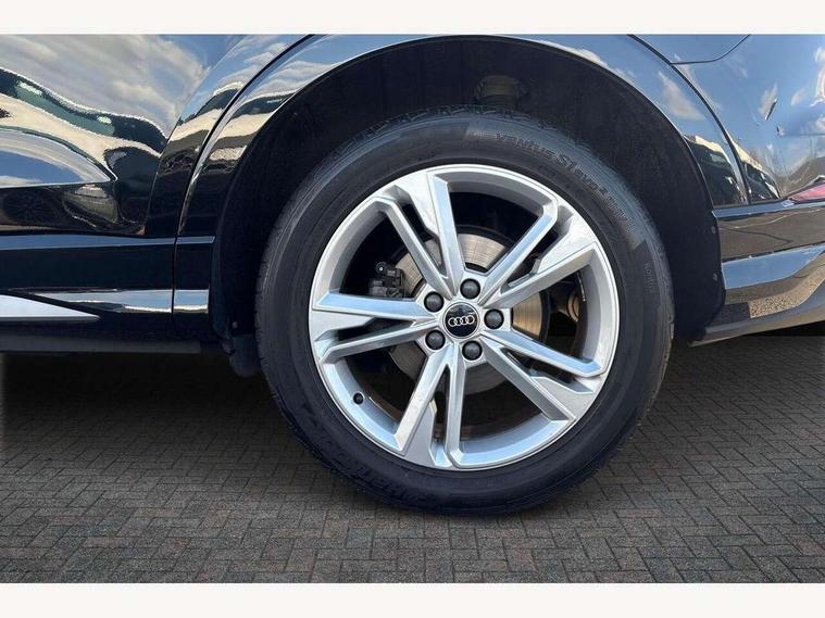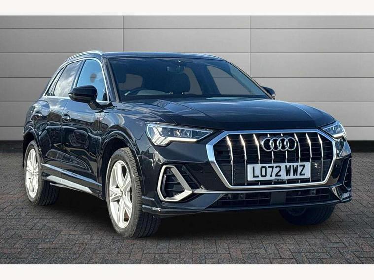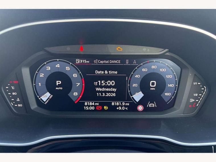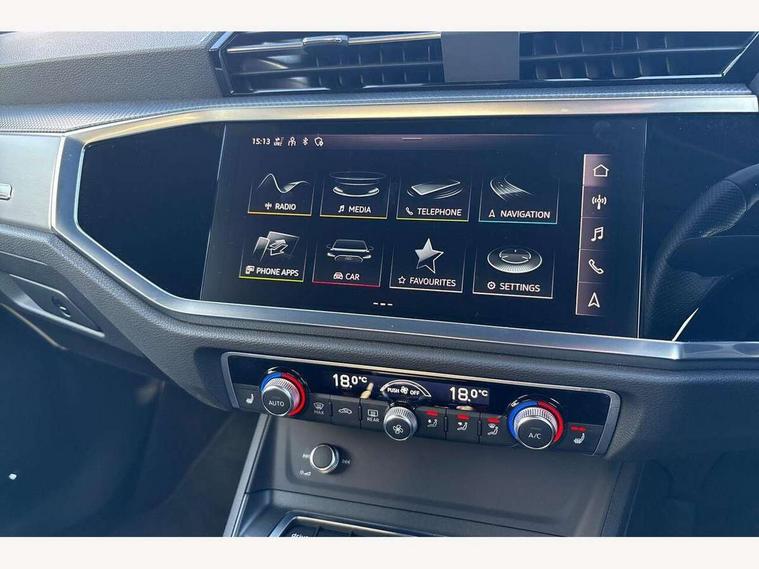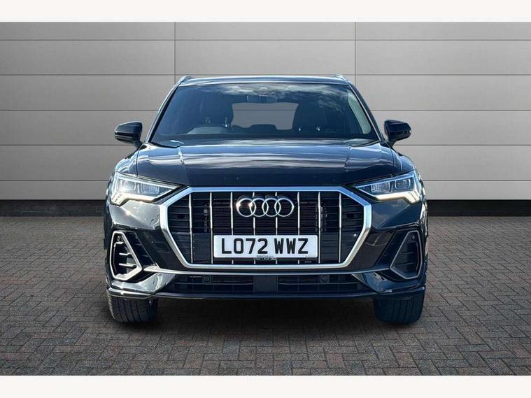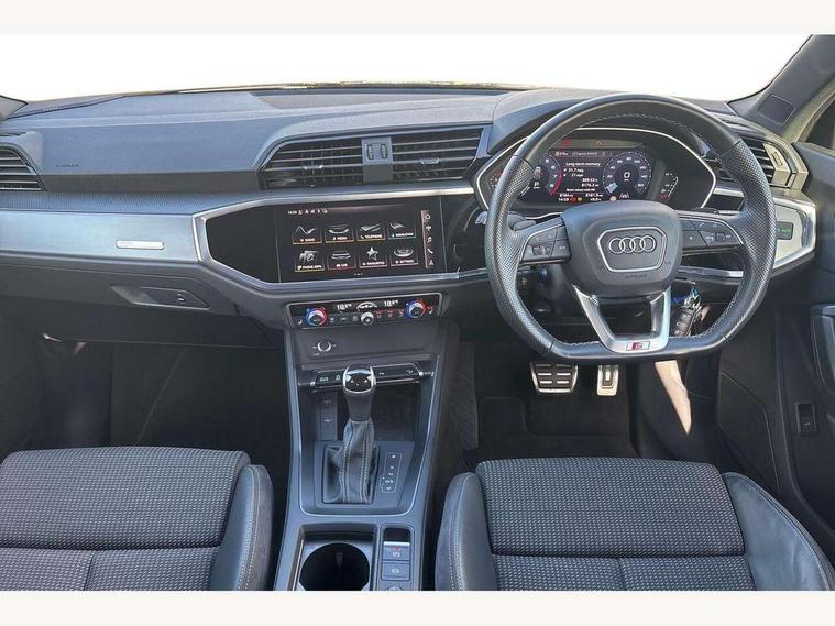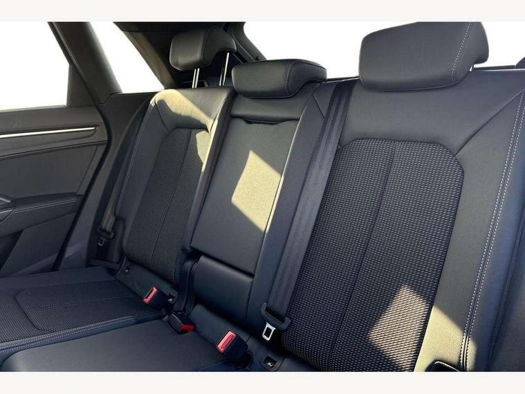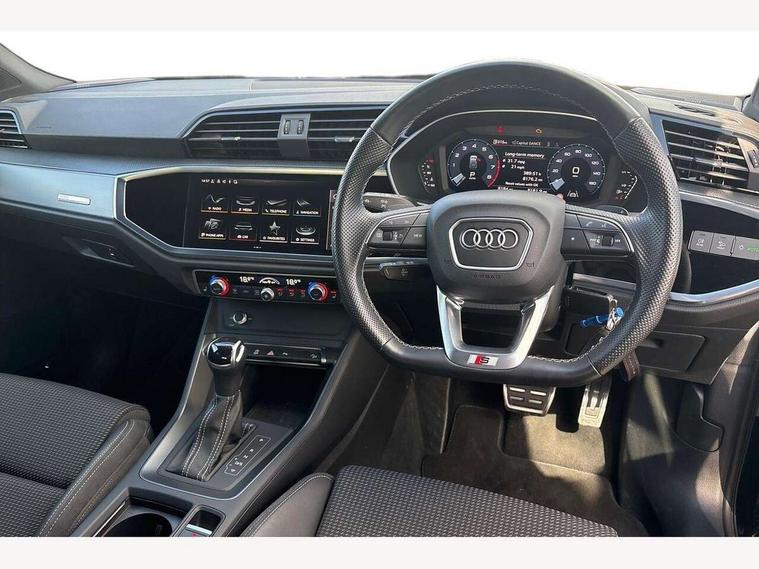 Amazon alexa Integration, Audi drive select, Audi lane departure warning, Audi Virtual Cockpit - 10.25" display, Bluetooth interface, Camera based traffic sign recognition, Legal emergency call, MMI Navigation Plus with high resolution 10.1 inch touchscreen colour display, Power operated tailgate, Progressive steering, Service interval indicator, Smartphone interface includes wireless Apple carplay/Android Auto, Start stop system with recuperation, Voice control system with natural language interaction, Sports suspension, 2 USB-C ports with charge and data functions, 6 passive loudspeakers, DAB digital radio module, Acoustic windscreen, Aluminium roof rails, Aluminium window trim, Auto dimming frameless rear view mirror, Body colour front spoiler blade, Body coloured bumpers, Electrically folding, adjustable and heated door mirrors with integrated LED side indicators and kerb view function for passenger side, Front and rear electric windows, Front fog lights, Front side air inlets in matt platinum grey, Grille vertical bars in aluminium silver/Matt, High gloss black finish B and C pillars, LED Dynamic rear indicators, LED headlights with LED daytime running lights, LED rear lights, LED third brake light, Privacy glass dark tinted rear and rear-side windows (from B-pillar backwards), Rain and light sensors, Rear diffuser grille in grained matt black, Rear diffuser strip in matt titanium black, Rear side wing doors, Rear wiper, S line badges on front wings, S Line front and rear bumpers, Side skirt insert in matt Platinium grey, Titanium black radiator grille, Variable front intermittent wipers, 12V socket in rear centre console, 3 seat bench in 2nd row, 40:20:40 folding with manual adjustment for 60:40 forwards/backwards position and backrest angle, Adjustable rear seat bench/backrest with centre armrest and cupholder, Black cloth headlining, Dual zone electronic climate control, Front and rear black floor mats with contrast stitching in rock grey, Front and rear headrests, Front and rear roof module including reading lights, Front centre armrest, Glove compartment lighting, Height and reach adjustable steering wheel, Illuminated door sill trims with S logo, ISOFIX child seat mounting for front passenger with airbag deactivation and outer rear seat including top tether attachment point for outer rear seats, Luggage compartment light, Manual front seats with height adjustment, Perforated leather gearknob, Single front passenger seat, Stainless steel luggage compartment sill finisher, Stainless steel pedals, Ambient lighting pack - Q3, Non smoking pack - Q3, 3x3 point rear seatbelts, 6 airbags - Driver, front passenger, curtain and side windows, Audi pre-sense front with pedestrain and cyclist recognition, Electrically operated child locks on rear doors, Electromechanical parking brake, Electronic stabilisation control including ABS, ASR and EDL, Front seatbelt reminder, Hill descent control, Hill hold assist, Pre sense basic, Seatbelt monitoring, Tyre pressure warning, Warning triangle and first aid kit, Anti theft alarm, Anti theft wheel bolts, Immobiliser, Remote central locking, Dark matt brushed aluminium inlay, Detail dashboard around MMI touch colour display in glass look, black with surround in aluminium look, Leatherette door armrest,