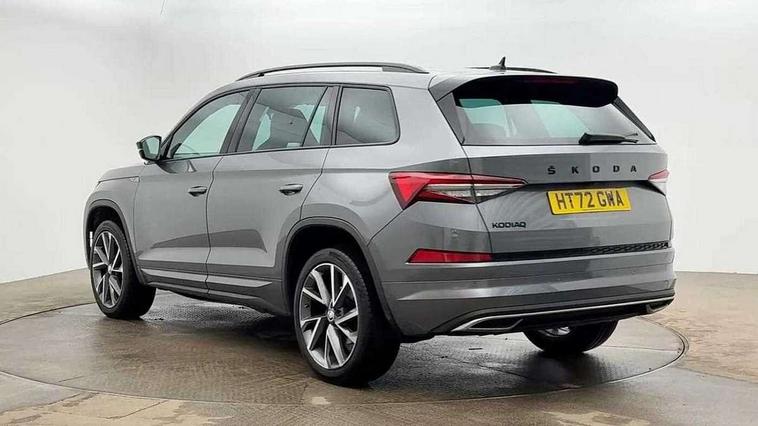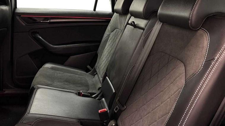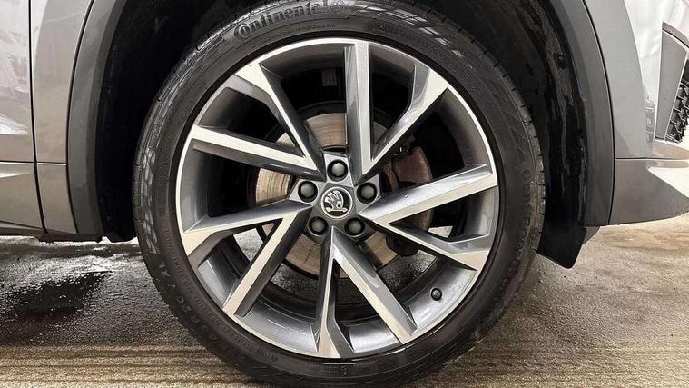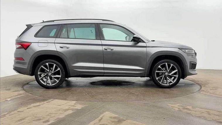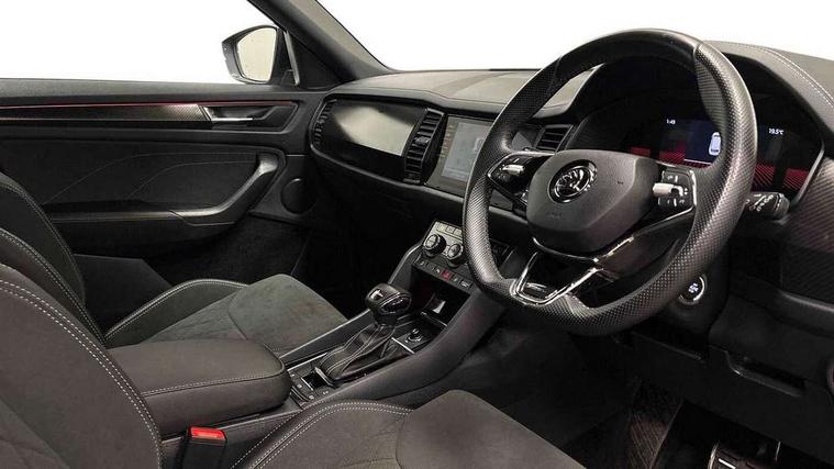 Bluetooth system, Columbus satellite navigation with 9.2" touchscreen, integrated Wi-Fi, web radio, Digital voice enhancement, e call+, ECO Stop/start function, Exterior temperature indicator, Progressive steering, Rear view camera, Smartlink wireless for apple carplay and wired for android auto, Speed limiter, Tailgate unlocking from outside, USB C Port x 2 in front centre console, Wireless charging, 8 Speakers, DAB Digital radio, Aero front windscreen wipers with intermittent function, Aero rear window wiper, Auto dimming rear view mirror, Black roof rails, Black sports styling including front grille and window surrounds, Black wheel arch surrounds, Body colour bumpers, Body colour door handles, Electric adjustable/heated/folding door mirrors, driver side auto dimming with boarding sports and memory function, Electric front and rear windows, Extended rear spoiler with finlets in gloss black, Front fog lights, Full LED matrix headlights with AFS (adaptive front light system), cornering function and AWL (all weather lighting system), Gloss black door mirrors, Headlight washers, Heated rear window, Invisible tailpipe, LED daytime running lights, LED rear fog light, LED third brake light in rear spoiler, Light assistant (coming/leaving home/tunnel light), Off-road style lower front bumper element, Privacy glass, Rain and light sensors, Rear diffuser, Rear LED lights (high functionality) with welcome effect and dynamic indicators, Rear side wing doors, Safety reflectors on front and rear doors, Sportline badge on front fender, Sports front and rear bumpers including lower rear chrome strip, Tailgate lettering in Black, Window control switches with black trim, 12V socket in boot, 2 rails with 2 hooks, 2 seat bench in 3rd row, 3 seat bench in 2nd row, 4 foldable roof handles with rear coat hooks, 60:40 foldable rear seat with sliding adjustment and backrest angle adjustment, Aluminium pedals, Black roof headlining, Bottle holders in door panel in the 1.5 litre front and 1 litre rear, Cargo storage compartments, Chrome headlight control button, Chrome interior door handles, Coat hooks on B pillar, Covered storage compartment on driver side, Decorative door sill covers, Front centre armrest with storage compartment, cup holder and 12V socket, Front courtesy lights, Gear shift lever with chrome frame and black gloss insert, Grey stitching in front and rear armrests and door armrests + door inserts, Height adjustable front headrests, Illuminated and cooled glovebox, Illuminated luggage compartment, Isofix child seat fittings in outer rear seats with top tether, Manually adjustable steering column, Microsuede door panels, Net programme in boot (1x horizontal Net, 2x vertical Nets), Overhead glasses storage compartment, Pollen filter, Rear centre armrest with cupholders, Single front passenger seat, Sliding trunk cover, Small Bags on the inner sides of the front backrests, Sports seats, Sunvisors with illuminated vanity mirrors, Three rear height adjustable headrests, Ticket holder on A Pillar, Umbrella in door panel, Variable boot floor, LED Interior light pack - Kodiaq, Auto door release and activation of warning lights in the event of an accident, Child locks on rear doors, Driver and front passenger airbag with knee airbag and front passenger airbag deactivation, Electronic parking brake with hill start assist, Emergency rear braking signal, ESC (incl. ABS+MSR+ASR+EDS+HBA+DSR+RBS+MKB), Front assist with autonomous emergency braking, Front side airbags with curtain airbags, Fuel cut off safety device, Height adjustable front 3 point seatbelts + pretensioners, Hill hold control, Rear disc brakes, Safety vest holder in door, Seat belt reminder for all seats, Three point rear seat belts, Two tone horn, Tyre pressure monitor, Alarm with interior monitoring and tilt sensor with safe function, Anti-theft wheel bolts, Immobiliser, Keyless entry and start system (KESSY), Remote central locking with 2 keys, Black air vent surround, Carbon finish dashboard and door inserts, Grey stitching in dashboard, 20" Vega Anthracite alloy wheels, Temporary spare wheel (space saver),
