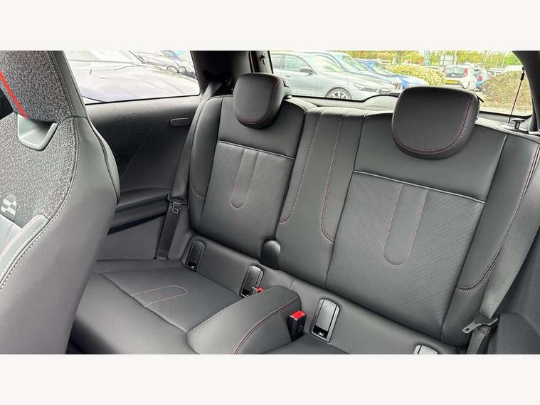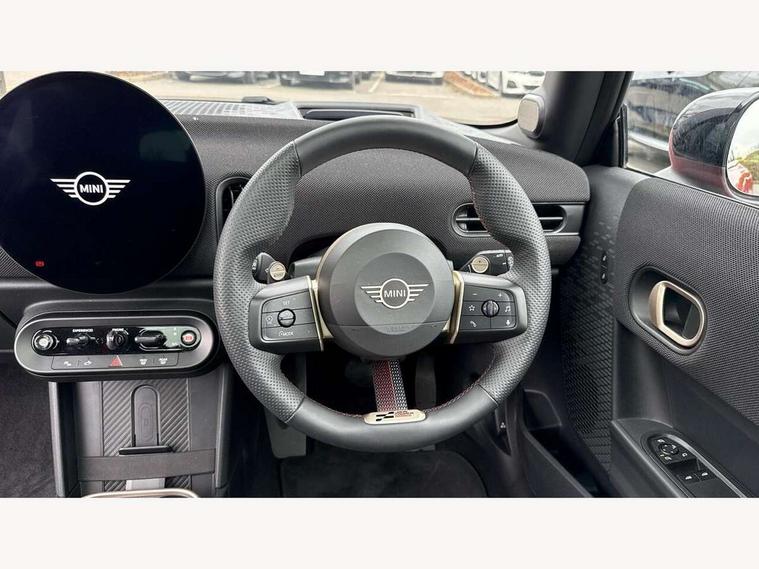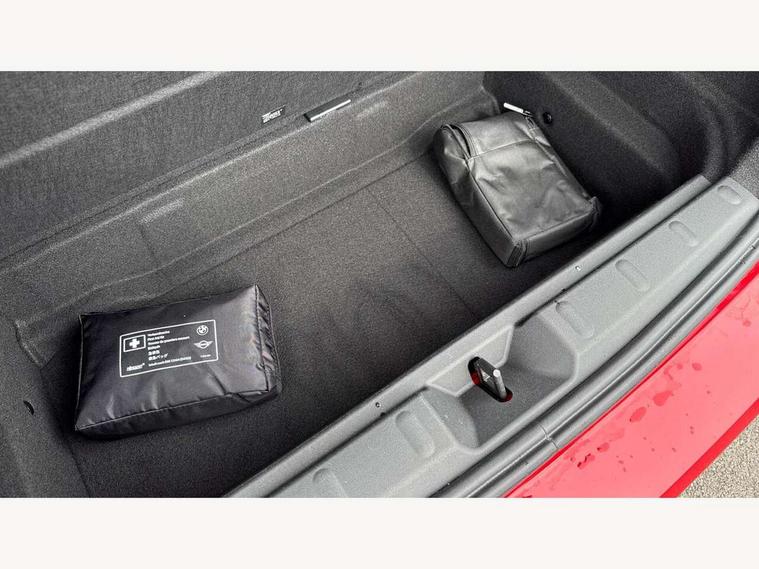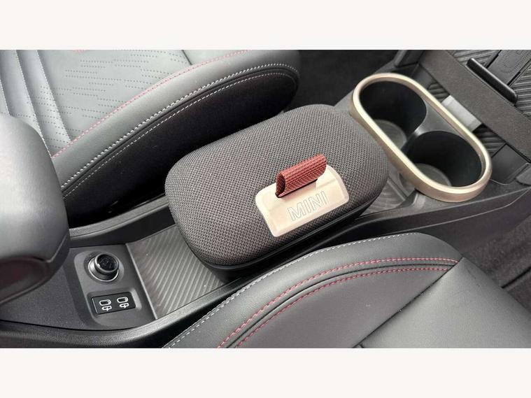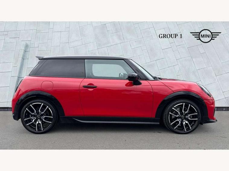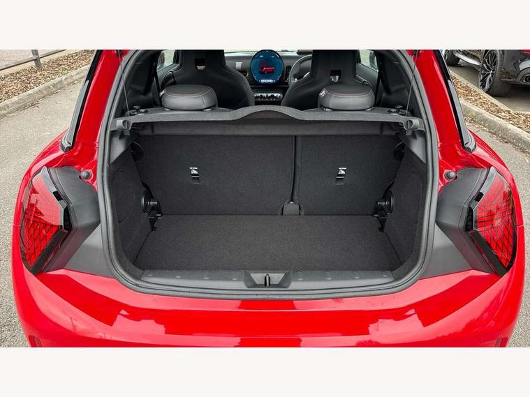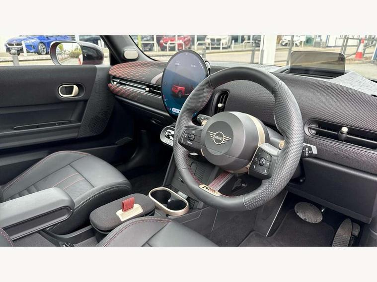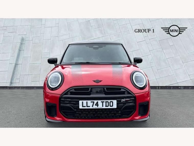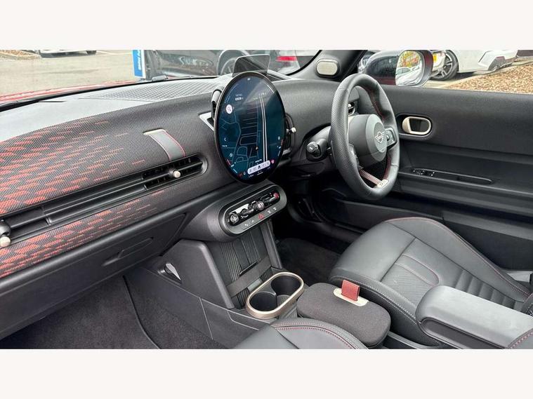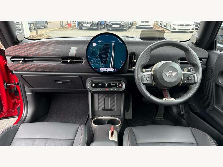 Central toggle bar, Circular OLED Screen, Compatible mobile phone bluetooth with audio streaming, Cruise control, Digital instrument cluster, Electro-mechanical speed dependant steering assistance, Emergency call service, MINI Experience Modes, Mini navigation system, On board computer, Service interval indicator, 7 speed steptronic sport transmission with double clutch, Adaptive suspension, DAB Digital radio, Personal eSim, Adaptable light signatures, Auto headlights, Electric adjustable heated door mirrors, Electric front windows, Front and rear apron, Heated rear window, Heated windscreen washer jets, High gloss black wheel arches, High gloss hexagonal patterned grille surround, JCW body kit, LED daytime running lights, LED indicator lights, LED rear lights, Rain sensor window wipers, Rear fog lights, Rear roof spoiler with airblades, Rear window wiper, 2 seat bench in second row, 2 zone automatic air conditioning, 60/40 rear seat bench, Ambient lighting, Black lower band in high gloss, Cupholders, Dark headliner, Floor mats, Front and rear head restraints, Front compact armrest, Heated steering wheel, Height adjustable passenger seat, Lidded storage box in Black/Red knit, Luggage compartment lighting, Partially perforated vescin steering wheel with red accent, black/red decorative strap, Single front passenger seat, Steering wheel paddle shift, Sunvisors with vanity mirrors, Vescin/Cord upholstery, Driving assistant pack - Cooper Hatchback, Level 1 pack - Mini Hatchback, Park assistant pack - Cooper Hatchback, 3 point seatbelts on all four seats, 6 Airbags - front, side, head and seat belt tensioners, Acoustic pedestrian protection, Anti-lock braking system (ABS), Brake caliper in Black with JCW badge, DSC - Dynamic Stability Control, Electronic parking brake, Front and rear disc brakes, Front ISOFIX (iSize), Front passenger airbag deactivation, JCW Sport Brakes, Traction control, Tyre pressure monitoring system, Alarm, Immobiliser, Remote central locking, Black/Red decorative dash strap, JCW Black/Red dashboard knit, Tyre repair kit,