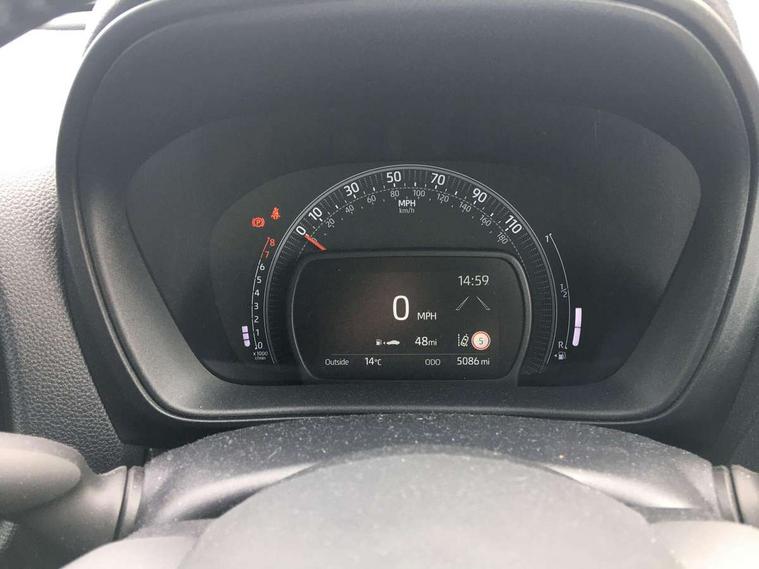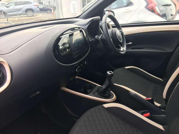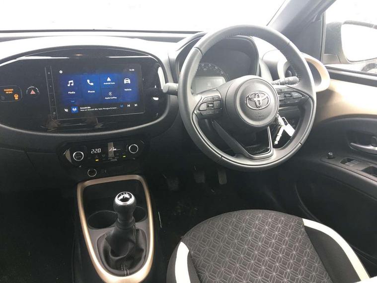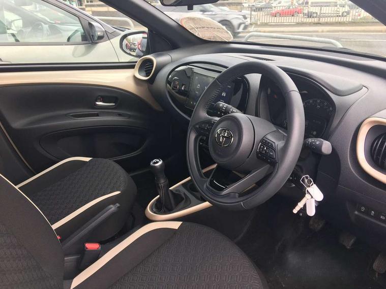 4.2" TFT colour screen, Adjustable speed limiter, Analogue speedometer, Bluetooth connectivity, Digital tachograph, Driver attention alert system, eCall emergency call system, Electric power steering, Intersection turn assist, Key reminder warning, Noise reduction kit, Pre collision system with emergency steering assist, Reversing camera with static guide lines, Smart phone integration with Apple car play/Android Auto, Speed limit display, Start and stop, Vehicle Stability Control (VSC), 4 speakers, 9" HD multimedia display touch screen with Toyota smart connect, DAB digital audio broadcast, USB connector, Auto headlights, Auto wipers, Automatic headlights cut-off, Bicycle towing hook, Black contrast roof, Black side protection mouldings, Black wheel arch mouldings, Body colour door handles, Body coloured front bumper, Boot door scuff plate, Eclipse black rear bumper, Electric heated door mirrors, Follow me home headlights, Front fog lights, Front power windows, Gloss black door mirrors, Gloss black upper front grille, Headlight cut-off reminder, LED daytime running lights, LED front light guide, LED High mounted stop lamp, Manual day/night rear view mirror, Manual headlight levelling, Pagoda roof, Power adjustable door mirrors, Power back door, Privacy glass, Projector halogen headlights, Rain sensor, Rear combination lights LED bulb type, Rear side wing doors, Rear windscreen defogger, Rear windscreen wiper, Short antenna, Variable intermittent windscreen wipers, 12v power outlet - front, 2 seat bench in 2nd row, 3 spoke leather steering wheel, 50/50 split folding rear seat, Adhesive roof headlining, Adjustable speed limiter switch on steering wheel, Audio and telephone switches on steering wheel, Auto air conditioning, Black insert on steering wheel, Black roof lining, Boot light, Centre room light, Chrome interior door handles, Chrome surround on air conditioning buttons, Clean air filter, Console box storage in body color, Fabric upholstery, Floor mats, Front and rear cup holders, Front head rest deco art, Front head restraints, Height adjustable driver seat, Intelligent adaptive cruise control switch on steering wheel, ISOFIX child restraint system on rear seats, Lane departure alert switch on steering wheel, Leather gearshift knob, Manual tilt steering wheel, Manually reclining and sliding driver seat, Manually reclining and sliding front passenger seat, Multimedia switches on steering wheel, Pollen filter, Rear door pockets, Rear head restraints, Satin silver insert on gear shift knob, Single compartment glovebox with lights, Single front passenger seat, Soft tonneau cover, Sun visors with mirror on driver and passenger side, Voice recognition switch on steering wheel, Toyota safety sense pack - Aygo X, Anti lock braking system + Electronic brake force distribution, Child safety door lock, Emergency brake light signal (EBS), Hill start assist control (HAC), Passenger airbag on/off switch, Seat belt reminder for front and rear seats, Supplement restraints system (SRS) - 6 airbags, Traction control, Tyre pressure warning system, Immobiliser, Remote power door locks, Black wheel centre caps, Tyre repair kit,