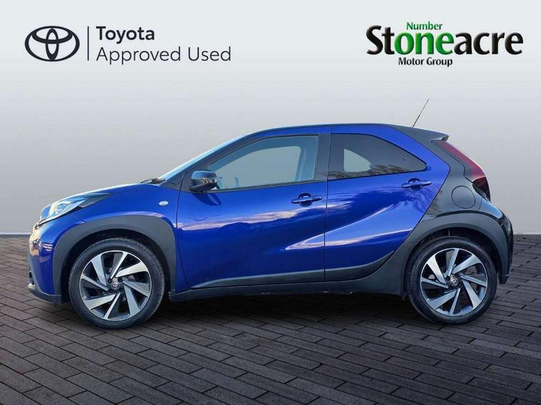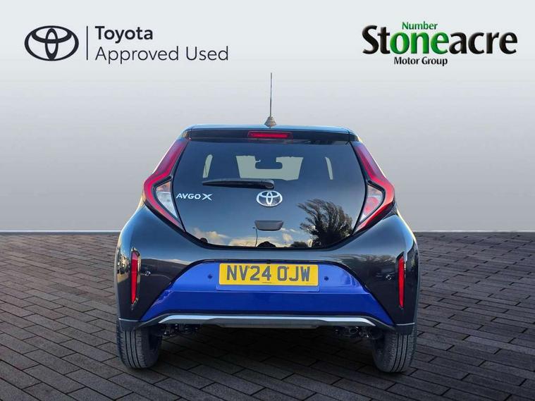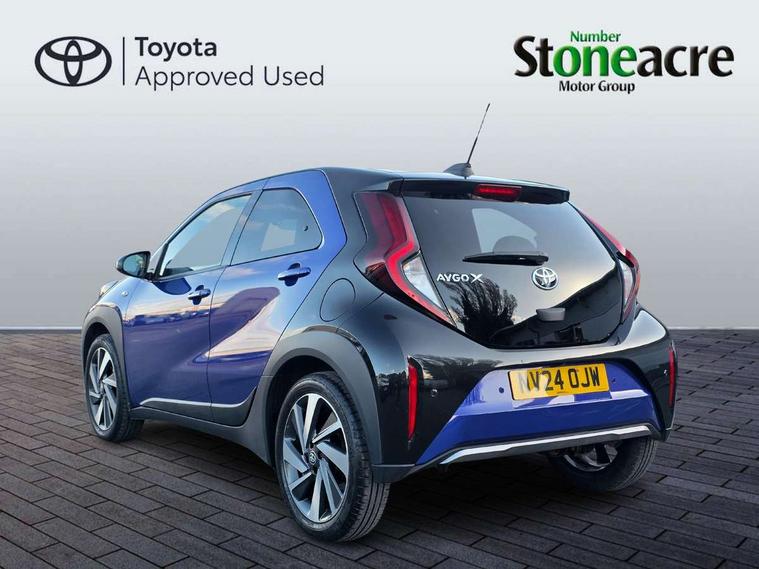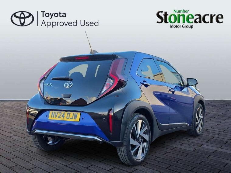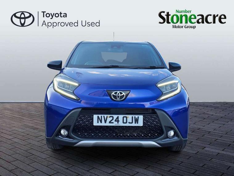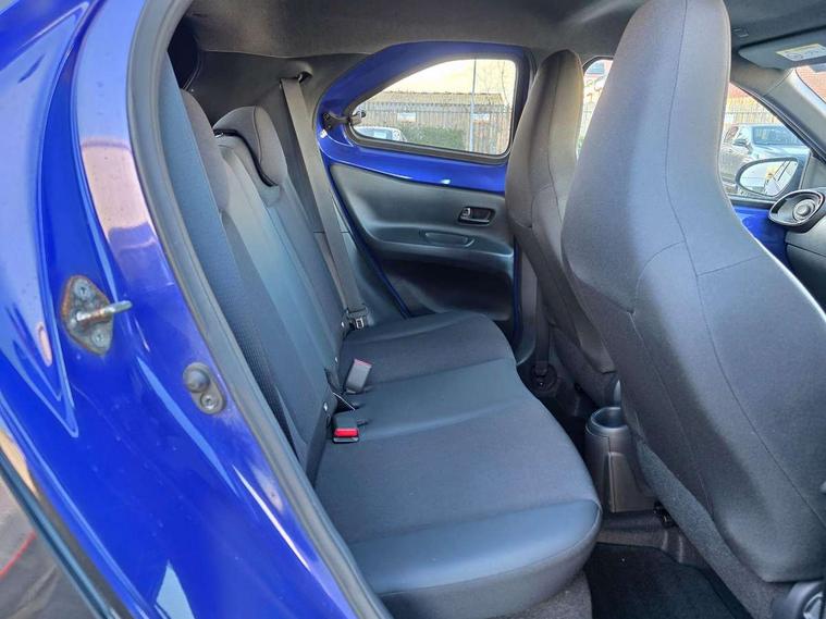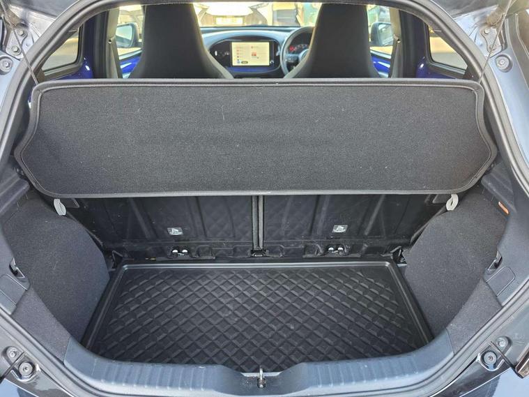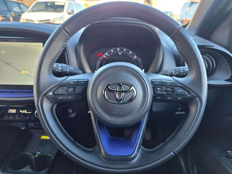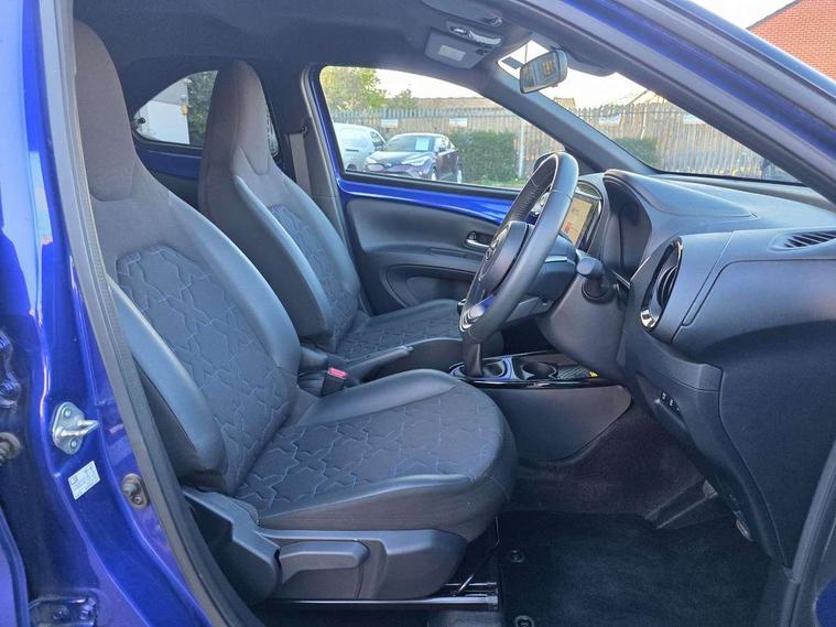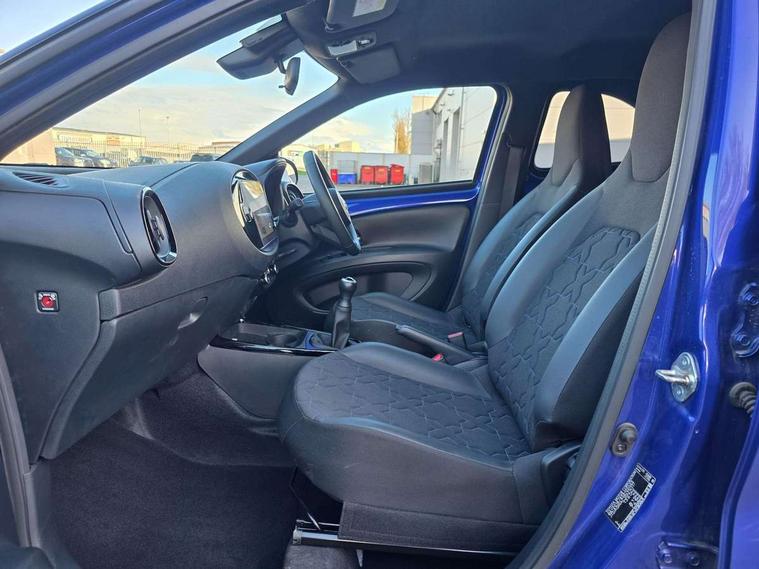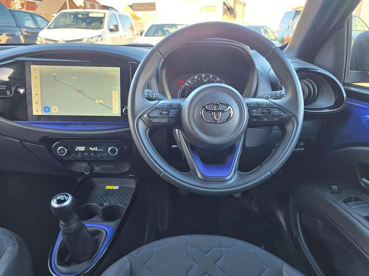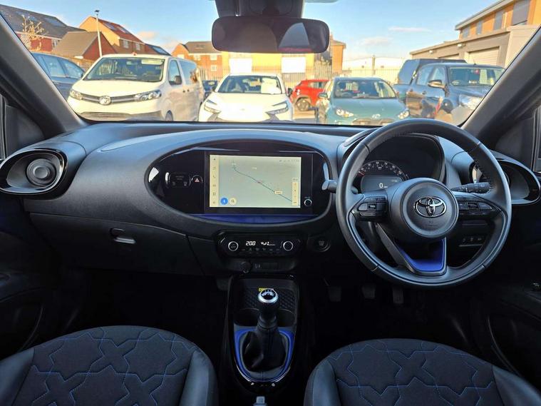 4.2" TFT colour screen, Adjustable speed limiter, Analogue speedometer, Bluetooth connectivity, Digital tachograph, Driver attention alert system, eCall emergency call system, Electric power steering, Front and rear parking sensors with auto brake, Intersection turn assist, Key reminder warning, Noise reduction kit, Pre collision system with emergency steering assist, Remote boot door release on key, Reversing camera with static guide lines, Smart entry and push button start, Smart phone integration with Apple car play/Android Auto, Speed limit display, Start and stop, Wireless charger, Vehicle Stability Control (VSC), 10.5" HD multimedia display touch screen with Toyota smart connect, 4 speakers, DAB digital audio broadcast, USB connector, Auto headlights, Auto wipers, Automatic headlights cut-off, Automatic high beam On/Off switch, Bicycle towing hook, Black contrast roof, Black fog light surrounds, Black side protection mouldings, Black wheel arch mouldings, Body colour door handles, Body coloured front bumper, Boot door scuff plate, Eclipse black rear bumper, Electric heated door mirrors, Follow me home headlights, Front and rear underruns in silver, Front fog lights, Front power windows, Gloss black door mirrors, Gloss black upper front grille, Headlight cut-off reminder, LED daytime running lights guide, LED front light guide, LED High mounted stop lamp, LED projector headlights, Manual day/night rear view mirror, Manual headlight levelling, Pagoda roof, Power adjustable door mirrors, Power back door, Privacy glass, Rain sensor, Rear combination lights LED bulb type, Rear side wing doors, Rear windscreen defogger, Rear windscreen wiper, Remote hazard lights system, Short antenna, Variable intermittent windscreen wipers, 12v power outlet - front, 2 seat bench in 2nd row, 3 spoke leather steering wheel, 50/50 split folding rear seat, Adhesive roof headlining, Adjustable speed limiter switch on steering wheel, Audio and telephone switches on steering wheel, Auto air conditioning, Black roof lining, Body colour satin anodised insert on steering wheel, Boot light, Centre room light, Chrome interior door handles, Chrome surround on air conditioning buttons, Clean air filter, Console box storage, Floor mats, Front and rear cup holders, Front head rest deco art, Front head restraints, Height adjustable driver seat, Intelligent adaptive cruise control switch on steering wheel, ISOFIX child restraint system on rear seats, Lane departure alert switch on steering wheel, Leather gearshift knob, Light blue ambient lighting in centre console, Manual tilt steering wheel, Manually reclining and sliding driver seat, Manually reclining and sliding front passenger seat, Multimedia switches on steering wheel, Partial synthetic leather upholstery, Pollen filter, Rear door pockets, Rear head restraints, Satin silver insert on gear shift knob, Single compartment glovebox with lights, Single front passenger seat, Soft tonneau cover, Sun visors with mirror on driver and passenger side, Voice recognition switch on steering wheel, Toyota safety sense pack - Aygo X, Anti lock braking system + Electronic brake force distribution, Child safety door lock, Emergency brake light signal (EBS), Hill start assist control (HAC), Passenger airbag on/off switch, Seat belt reminder for front and rear seats, Supplement restraints system (SRS) - 6 airbags, Traction control, Tyre pressure warning system, Immobiliser, Remote power door locks, Black wheel centre caps, Tyre repair kit,
