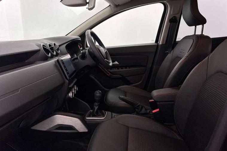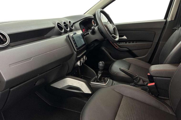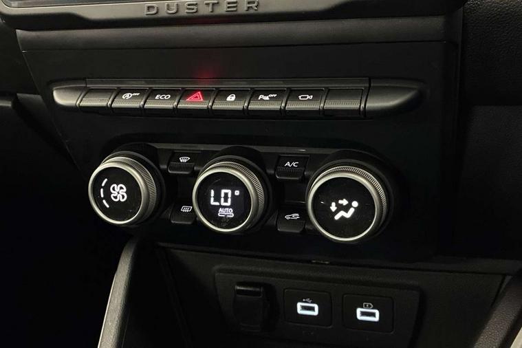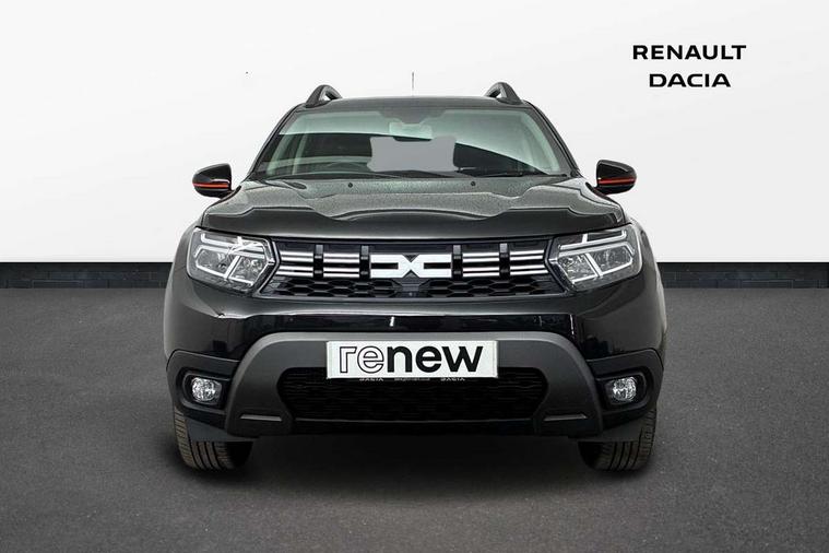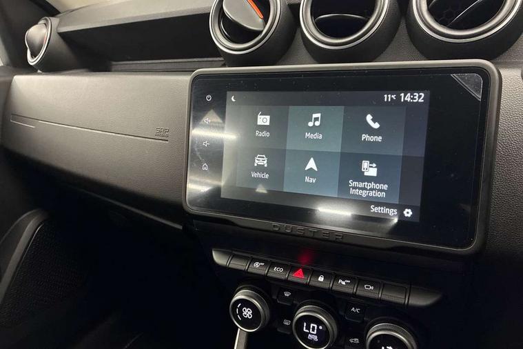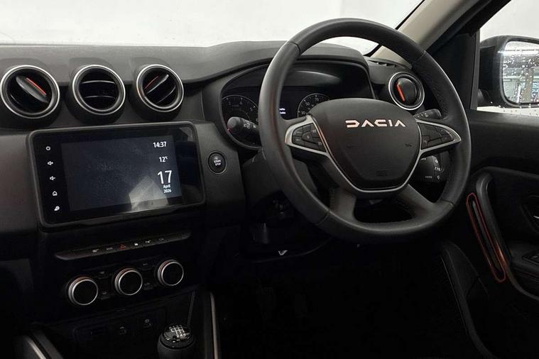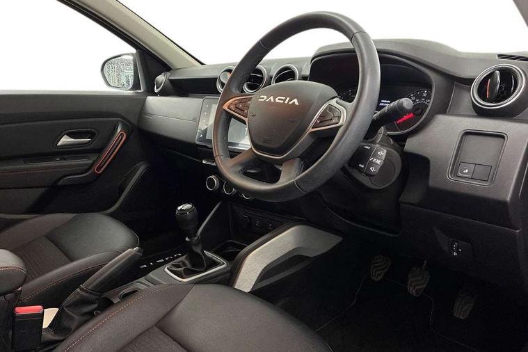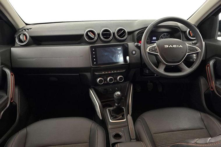 Blind spot warning, Cruise control and speed limiter, eCall emergency system, Eco mode, Electric power assisted steering, Multi view camera, On board computer, odometer, trip computer, average fuel consumption, average speed, service indicator, outside temperature gauge, Rear parking sensors and reverse camera, Rev counter, Stop/start system, 8" Media Navigation with wireless smartphone replication, Dacia plug and radio/MP3/USB/bluetooth/DAB/steering wheel control, 3 speed windscreen wipers, Acoustic windshield, Arizona orange longitudinal roof bars with Duster inscription, Arizona orange tailgate trim with Duster inscription in black background and lettering, Automatic front wipers, Black side sills, Body coloured door handles, Chrome front grille with hot stamping, Chrome logo surround on steering wheel, Dark glass on lateral rear windows, Daytime running lights, Drivers window one touch up/down, Dusk sensor, Electric adjustable/heated door mirrors, Electric folding door mirrors, Electric front windows, Electric rear windows, Front and rear body coloured bumpers, Front door sill protection strip, Front fog lights, Heated rear window, High level third rear brake light, Rain sensor, Rear side wing doors, Rear spoiler, Rear wash/wipe, Satin chrome door mirrors with arizona orange decal, Underbody protection skid plates, Y shaped LED headlights with rear LED lights, 3 rear height adjustable headrests, 3 seat bench in 2nd row, 60/40 split folding rear seat, Automatic air conditioning, Backlighted steering wheel buttons, Boot light, Driver seat lumbar adjustment, Fabric decorative insert on door panels, Fabric upholstery, Front head restraints, Front passenger reading light, Gear shift indicator, Glovebox light, Heated seats, Height adjustable driver seat, Height adjustable front and rear headrests, Height and depth adjustable steering wheel, High centre console with driver armrest, Isofix points for child seats in both outer rear seats, Map pocket on front seat backs, Orange aesthetic finish interior, Passenger sunvisor with vanity mirror, Rear passenger reading light, Satin chrome gear lever cap insert, Satin chrome interior door handles, Satin chrome lower steering wheel insert, Single front passenger seat, Soft feel leather steering wheel, 3x3 point rear seatbelts, ABS and Emergency brake assist, ASR traction control with Electronic stability control, Child locks on rear doors, Door open visual and audible warning, Driver airbag, Driver and passenger seatbelt not fastened - visual and audible warning, EBD - Electronic brakeforce distribution, Front passenger airbag, Front passenger airbag deactivation, Front seatbelt pretensioners, Front side airbags, Height adjustable front seatbelts, Hill start assist, Tyre pressure monitor, Keyless entry, Remote central locking, Thatcham approved engine immobiliser, Arizona orange air vent surround, Arizona orange decorative insert on front door panels, Charcoal grey central console surround, Matt black central console fascia, Piano black decorative insert on rear door panels, 17" Black alloy wheels,