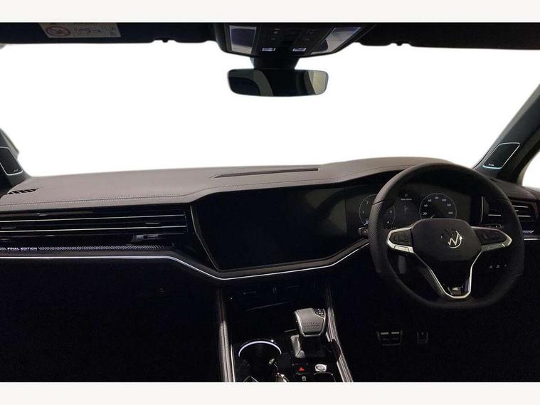 2 x Front USB-C ports, 2 x USB-C charging sockets on the centre console in the rear, charging capacity up to 45W, Adaptive cruise control, Advanced driver attention and drowsiness monitor, Digital cockpit with 12" high resolution dash display screen with customisable menus and information, Driver profile selection, Dynamic road sign display, E-Sim card for online connectivity, eCall emergency system, Innovision cockpit, Intelligent park assist, Mobile phone interface with inductive charging, Multi-colour Active Info display, Park Assist - Sensor controlled steering aid to assist parallel or bay parking, PAS, Power latching doors, Warning signal and warning light for front and rear seatbelts not fastened, Wireless app connect, 90 litre fuel tank, Adaptive chassis control, Air suspension with auto self leveling suspension, height adjustment and electronic shock absorption control, DAB Digital radio, Diversity antenna for AM/ FM reception, We Connect and We Connect Plus functionality, Automatic coming/leaving home lighting function, Automatic headlights, Black door mirrors, Black roof rails, Black style comfort bumpers, Dynamic headlight range control with dynamic cornering light, Electric front tilt/slide panoramic sunroof and fixed rear sunroof, Electrically power adjustable, heated, folding, auto dimming, front passenger exterior door mirror lowering function, Final edition lettering, HD LED Matrix beam plus digital headlight projection with variable light distribution, Headlight washers, Heat insulating darkened glass in side and rear windows, Highway light, Illuminated door sill protectors in stainless steel, LED 3rd brake light, LED daytime running lights, LED rear combination lamp with variable lighting functions and special styling, Poor weather light, Privacy glass for rear side windows and rear window, tinted glass from B pillar backwards - 80%, Rain sensor, Rear exhaust tailpipe, Rear fog light with back up light on both sides, Rear light bar and illuminated logo, Rear side wing doors, Rear wiper, Tow bar power folding with trailer assist, Transport protection, 12V socket in centre console, 3 rear headrests, 3 seat bench in 2nd row, 30 colours options interior ambient lighting, 4 zone climate control, Airbag label on sun visor and B-pillar, Black roof lining, Brushed stainless steel pedals, Door and side trim panel, Double sun visors with illuminated vanity mirrors, Front + rear carpet mats, Front centre armrest, Inserts and bolsters of front seats and outer rear seats in leather Varenna, Isofix child seat preparation easy-fit (for two outer rear seats) compatible with I-size, Leather wrapped multifunction sports steering wheel, heated, with touch control and shift paddles, Mechanical rear seat release, Power adjustable lumbar support in front, Power seats in front, right side with memory features and seat cushion depth adjustment, Rear seat backrest and split folding with center armrest, Single front passenger seat, Varenna leather upholstery, Extra acoustics pack - Touareg, Memory pack plus - Touareg, 3 point seatbelts, outer rear with ECE lable, ABS, Automatic slip control electronic differential lock, Child locks on rear doors, Curtain airbags, Driver and front passenger safety-optimised head restraints, Driver/Front Passenger airbags, Electronic parking brake with auto hold function, Extended pedestrian protection measures, Front assist, Front seat side impact airbags, Generative braking with start and stop system, Height adjustable 3 point front seatbelts with pre tensioners, Passenger airbag deactivate switch, Three 3 point rear seatbelts, Two tone horn, Warning triangle and first aid kit, Alarm system with interior protection, Easy open and close sensor controlled luggage compartment opening and closing with remote unlocking, Keyless Access Keyless locking and starting system with SAFELOCK, Aluminium decorative inserts, Black decorative trims, Gloss black decorative inserts in centre console,