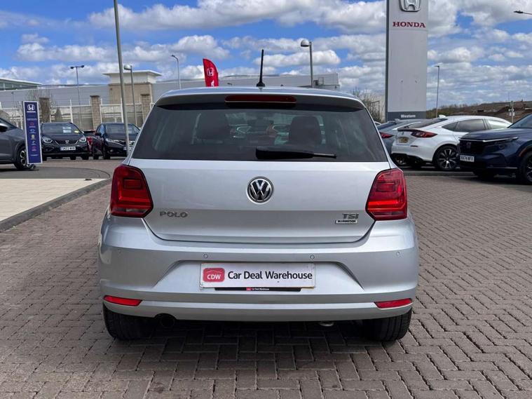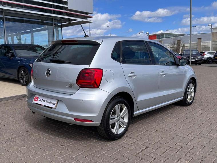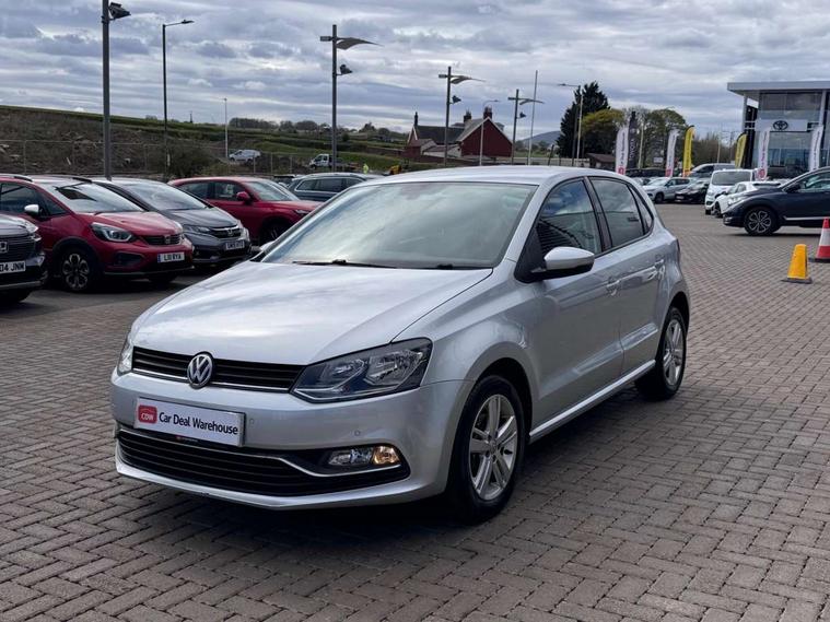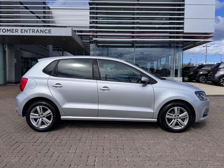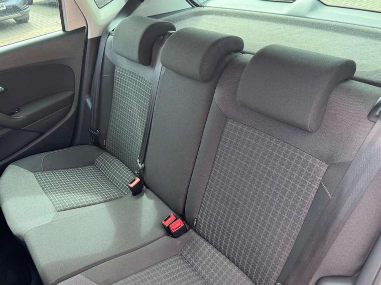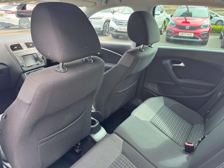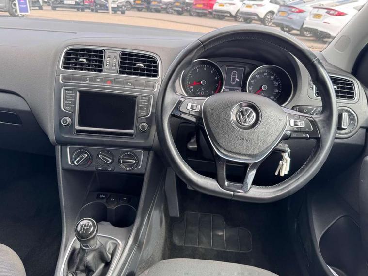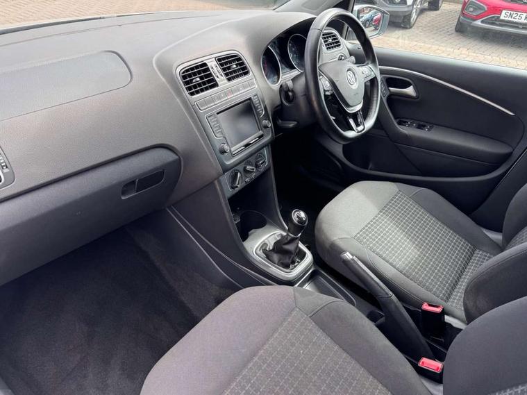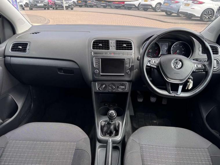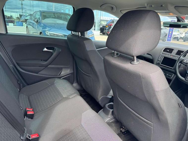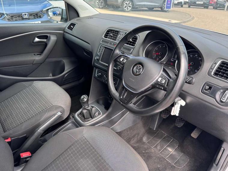 App-Connect, Bluetooth Telephone preparation, Driver alert system, Multi function display, Multifunction computer, PAS - speed related, Service interval indicator, Ultrasonic front and rear optical and audible parking sensors, Warning buzzer and light for front seatbelts unfastened, 6 speakers, Composition media system with radio, glovebox mounted CD, colour touch screen, SD card, aux-in, USB, multimedia interface, DAB Digital radio, Black grille with chrome surround, Body colour bumpers, Body colour door handles, Body colour door mirrors, Body coloured side sills, Chrome trimmed front air intake surrounds, Electric folding door mirrors, Electric front windows, Electric operated/heated door mirrors, Front fog lights with static cornering function, Front wash/wipe with interval delay, Heat insulated tinted glass 65% light absorbing from B pillar back, Heated rear window with auto timer, Rear electric windows, Rear windscreen washer and wiper with interval delay, 12V power socket in centre console, 2 bag hooks in luggage compartment, 2 cupholders, 3 rear head restraints, 3 spoke steering wheel, 4 grab handles, 60/40 split folding rear seat, Centre console storage, Chrome interior door handles, Driver and passenger sunvisors, Driver seat height adjust, Dust/pollen filter, Front door pockets, Front passenger seat height adjust, Front seat backrest storage nets, Front/rear reading lights, Glovebox, Height/reach adjustable steering column, Illuminated vanity mirror, Interior light with delay, Isofix Preparation 2 Rear child seats, Luggage compartment cover, removable, Luggage compartment lighting, Matt chrome gear lever gaiter surround, Multifunction leather steering wheel with leather gear knob/handbrake grip, Storage compartment in front doors, Storage compartment in rear doors, Sunglasses holder, Variable boot floor, Light and sight pack - Polo, 3 point height adj front seatbelts + pretensioners, 3x3 point rear seatbelts, ABS, Automatic post collision braking, Driver/front passenger airbag, Driver/Passenger whiplash optimised head restraints, ESC - Electronic Stability Control + traction control, ESP with EDL + ASR, Hill hold control, Hydraulic Brake Assist (HBA), Tyre pressure monitoring system, Alarm with remote central locking and interior protection, Electronic engine immobiliser, Air vents in Matt chrome, Matt chrome interior trim, 15" steel spare wheel,