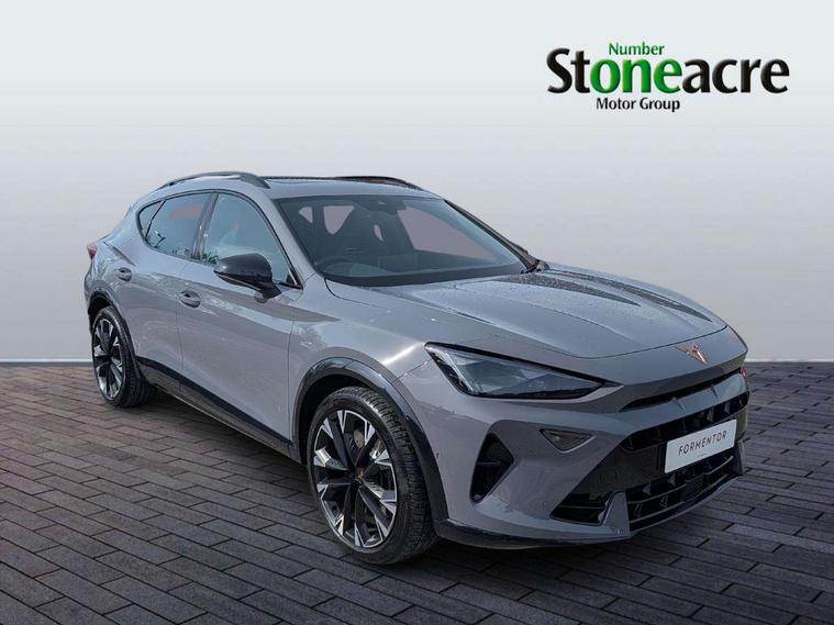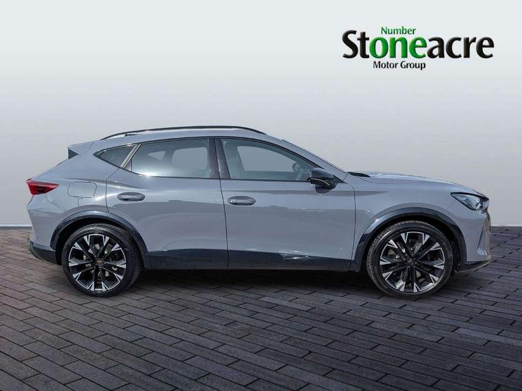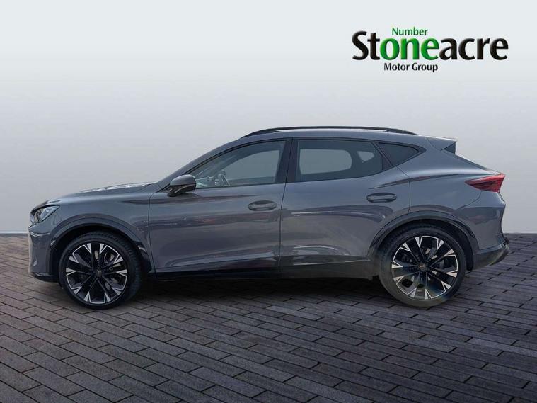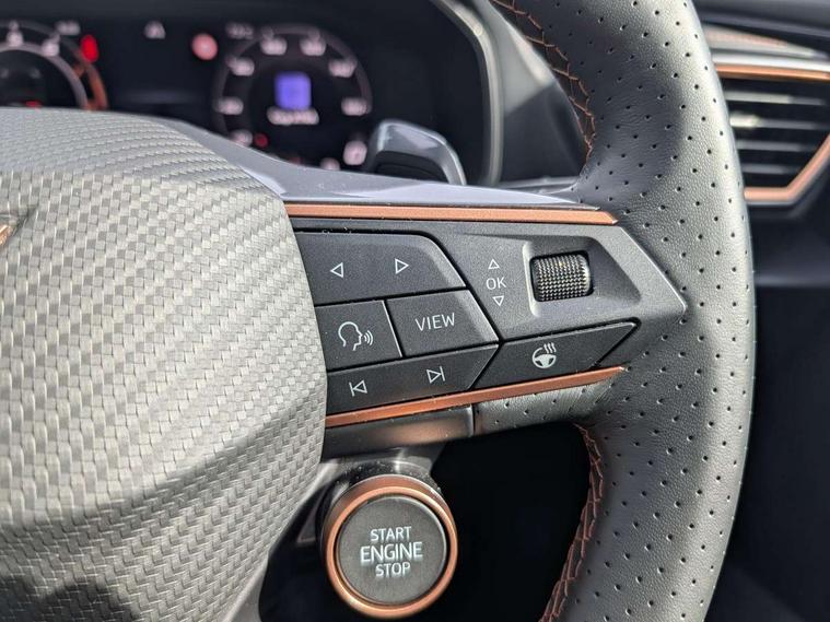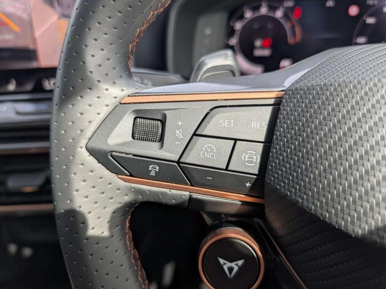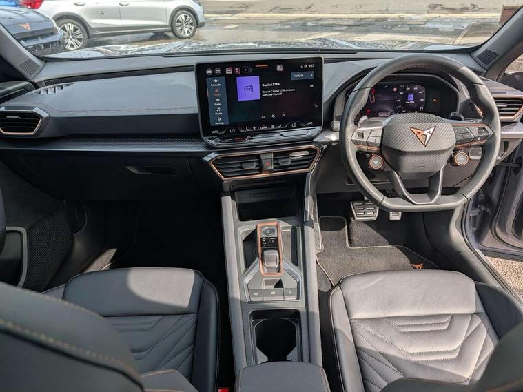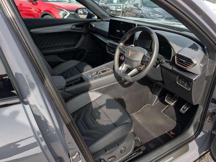 10.25" digital cockpit and configurable dashboard, Adaptive cruise control with follow-to-stop and speed limiter, Advanced driver alert system, Advanced lane assist with semi-automatic vehicle control in a medical emergency and traffic jam assist, Dynamic chassis control with driving profile selection (Comfort, Sport, CUPRA, Individual), Dynamic road sign display, Emergency steering support with turn assist, Forward collision warning with automatic braking, Full link phone integration, Intelligent park assist, RPM, trip computer, outside temp gauge, instrument light brightness, low fuel warning light, lights on reminder, gearshift indicator, Service interval indicator, Side and exit assist, Speed sensitive power steering, Start/stop system with regenerative braking, Top view camera, Virtual pedal and electric tailgate, Voice control system, Wired Android Auto, Wireless apple carplay, Wireless phone charger, Adaptive chassis control with continuous operation, CUPRA sport suspension, Electronic locking differential and dynamic traction support, 2 front and 2 rear USB type C sockets, Media system with navigation, 12.9" touchscreen display, voice control, DAB, steering wheel mounted controls, Auto dimming rear view mirror, Body colour door handles, Body coloured bumpers, Dark grey wing mirror, Daytime running light with automatic headlight control and coming home feature, Door panel ambient lighting, Dynamic headlight range control, Electric front/rear windows, Electrically adjustable heated and folding door mirrors with memory function, Gloss black roof rails and window surrounds, High beam assist, LED 3rd brake light, LED front fog lamps with cornering function, LED Taillights with dynamic indicator, Matrix LED headlights with multifunction camera, Rain sensing wipers, Rear diffuser with twin exhaust pipe on each side, Rear fog lights, Rear side wing doors, Rear wash/wipe, Tinted rear windows, Welcome lights (within exterior mirror housing), 12V socket, 2 front and 2 rear reading lights, 3 seat bench in 2nd row, 60/40 split rear bench seat with armrest and mechanical seat release, Black headlining, Black interior roof lining, Cupra sports pedals, Dust/pollen filter, Electrically adjustable front seats with lumbar support and memory function, Front and rear head restraints, Front centre armrest, Heated front seats, Heated supersports multifunction leather steering wheel with satellite buttons and gear shift paddles, Height/reach adjust steering wheel, Illuminated aluminium doorsteps, Illuminated interior front door sills, Illuminated sunvisor with mirror, Isofix, Leather dashboard, door insert and side trim panel, LED smart wraparound lighting, PVC/Leather upholstery, Satellite steering wheel, Single front passenger seat, Storage pockets on rear of front seats, Three zone climate control with control panel in rear, Variable luggage/load compartment floor, 3 point seatbelts on all rear seats, ABS, Brake control system - ESC and brake booster, Child proof door locks, Driver and front passenger airbags with front passenger airbag de-activation, Electronic parking brake, Front and rear disc brakes, Front side curtain airbags, Hill hold control, Pre-crash front and rear seat belt tensioner, window closure and hazard lights, Public e-call, Seat belt reminder for front and rear seats, Tyre pressure monitoring system, Anti theft alarm system, KESSY Advanced - Keyless start, keyless entry with SAFELOCK, Locking wheel bolts, Copper and aluminium interior detailing, 19" Artic machined sport black and silver alloy wheels, Breakdown and tool kit,