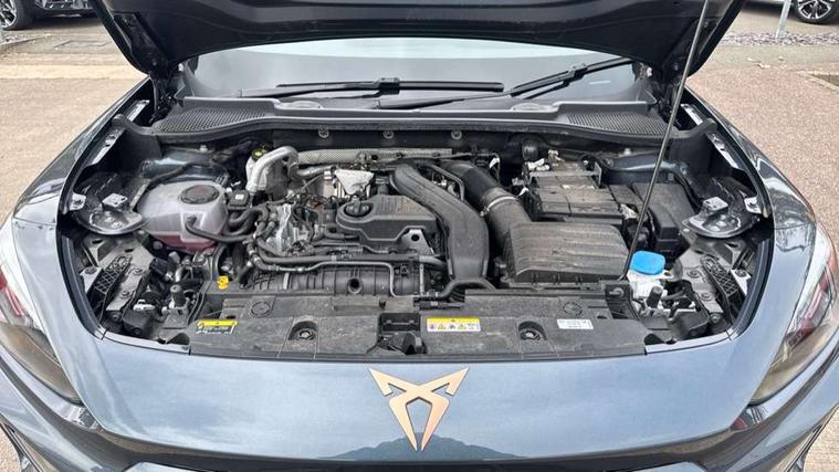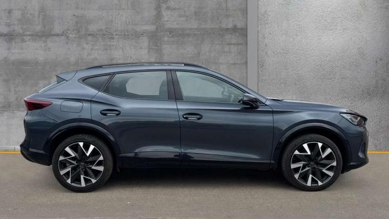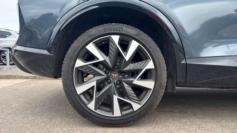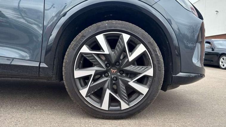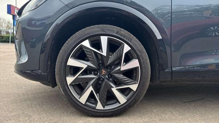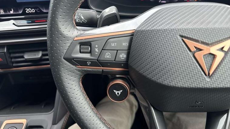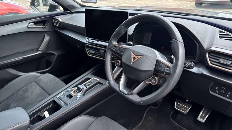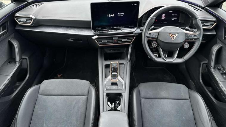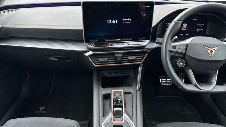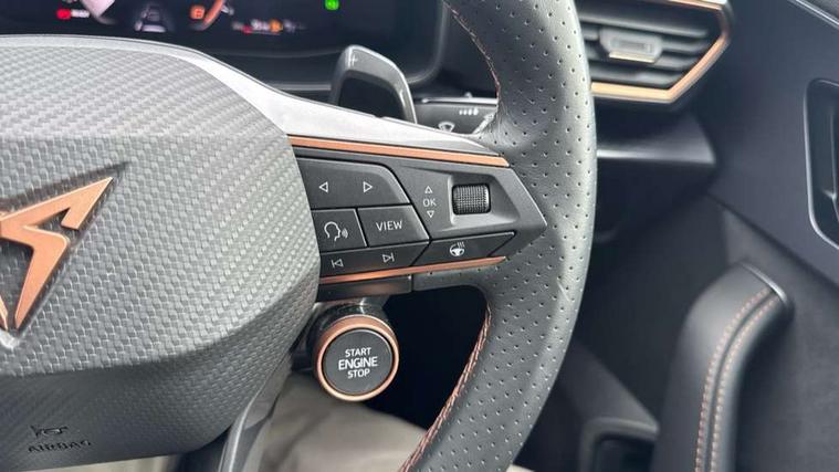10.25" digital cockpit and configurable dashboard, Adaptive cruise control with follow-to-stop and speed limiter, Advanced driver alert system, Driving profile selection, Dynamic road sign display, Emergency steering support with turn assist, Forward collision warning with automatic braking, Front and rear parking sensors, Full link phone integration, Lane assist, Progressive steering, Rear view camera, RPM, trip computer, outside temp gauge, instrument light brightness, low fuel warning light, lights on reminder, gearshift indicator, Service interval indicator, Start/stop system with regenerative braking, Virtual pedal and electric tailgate, Voice control system, Wired Android Auto, Wireless apple carplay, Wireless phone charger, CUPRA sport suspension, Electronic locking differential and dynamic traction support, 2 front and 2 rear USB type C sockets, Media system with navigation, 12.9" touchscreen display, voice control, DAB, steering wheel mounted controls, Auto dimming rear view mirror, Body colour door handles, Body coloured bumpers, Dark grey wing mirror, Daytime running light with automatic headlight control and coming home feature, Door panel ambient lighting, Dynamic headlight range control, Electric front/rear windows, Electrically adjustable heated and folding door mirrors with memory function, Gloss black roof rails and window surrounds, High beam assist, LED 3rd brake light, LED front fog lamps with cornering function, LED Headlights, LED Taillights with dynamic indicator, Rain sensing wipers, Rear diffuser with black simulated exhaust pipes, Rear fog lights, Rear side wing doors, Rear wash/wipe, Tinted rear windows, Welcome lights (within exterior mirror housing), 12V socket, 2 front and 2 rear reading lights, 3 seat bench in 2nd row, 60/40 split rear bench seat with armrest and mechanical seat release, Black headlining, Black interior roof lining, Cupra sports pedals, Dust/pollen filter, Electrically adjustable driver's seat with memory and lumbar support, Front and rear head restraints, Front centre armrest, Heated front seats, Heated supersports multifunction leather steering wheel with satellite buttons and gear shift paddles, Height/reach adjust steering wheel, Illuminated aluminium doorsteps, Illuminated interior front door sills, Illuminated sunvisor with mirror, Isofix, Leather dashboard, door insert and side trim panel, LED smart wraparound lighting, PVC/Dinamica microfiber upholstery + bucket seats, Satellite steering wheel, Single front passenger seat, Storage pockets on rear of front seats, Three zone climate control with control panel in rear, Variable luggage/load compartment floor, 3 point seatbelts on all rear seats, ABS, Brake control system - ESC and brake booster, Child proof door locks, Driver and front passenger airbags with front passenger airbag de-activation, Electronic parking brake, Front and rear disc brakes, Front side curtain airbags, Hill hold control, Public e-call, Seat belt reminder for front and rear seats, Tyre pressure monitoring system, Anti theft alarm system, KESSY Advanced - Keyless start, keyless entry with SAFELOCK, Locking wheel bolts, Copper and aluminium interior detailing, 19" Sandstorm machined sport black and silver alloy wheels,