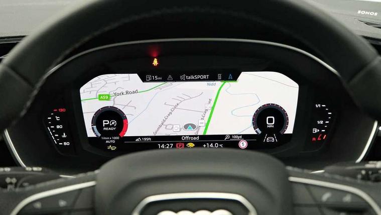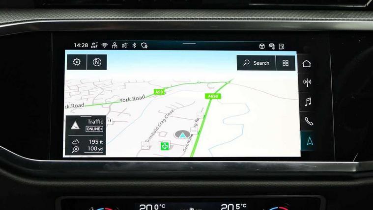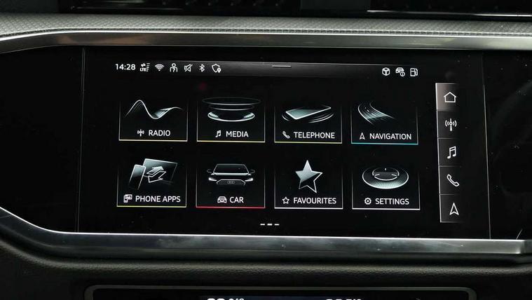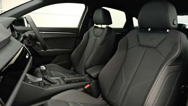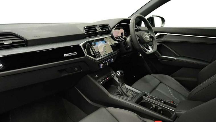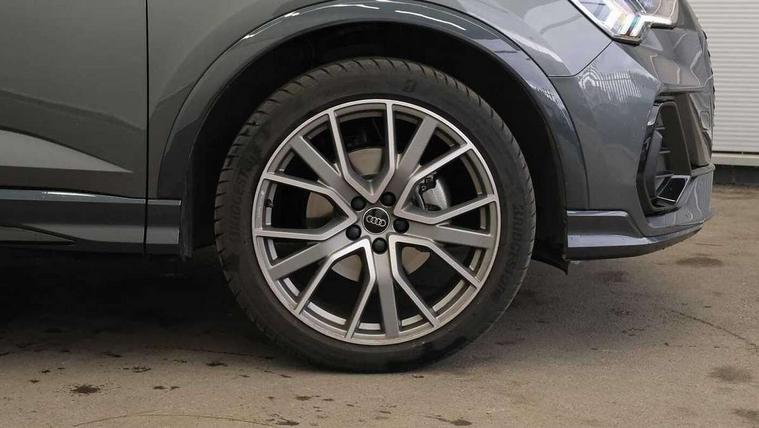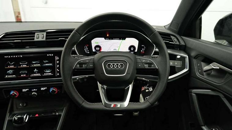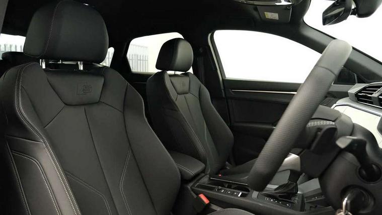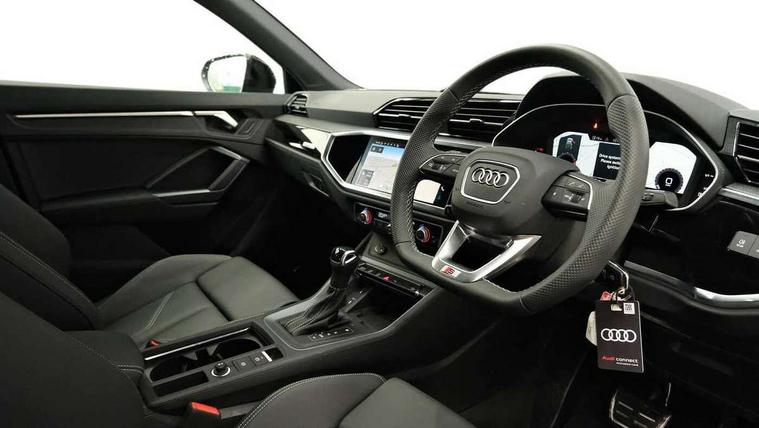 Audi connect safety and service, Audi drive select, Audi lane departure warning, Audi Virtual Cockpit - 10.25" display, Bluetooth interface, Camera based traffic sign recognition, Distraction and Fatigue warning, Legal emergency call, MMI Navigation Plus with high resolution 10.1 inch touchscreen colour display, Power operated tailgate, Progressive steering, Service interval indicator, Smartphone interface includes wireless Apple carplay/Android Auto, Start stop system with recuperation, Voice control system with natural language interaction, Sports suspension, 2 USB-C ports with charge and data functions, 6 passive loudspeakers, DAB digital radio module, Acoustic windscreen, Audi Beam uses LEDs to project the Audi logo onto the ground as you exit your Q3, Auto dimming door mirrors, Auto dimming frameless rear view mirror, Electrically folding, adjustable and heated door mirrors with integrated LED side indicators and kerb view function for passenger side, Front and rear electric windows, Front fog lights, Front underbody protection in manhattan grey paint finish, High gloss black finish B and C pillars, Honeycomb design radiator grille in matt anthracite black, LED Dynamic rear indicators, LED headlights with LED daytime running lights, LED rear lights, LED third brake light, Privacy glass dark tinted rear and rear-side windows (from B-pillar backwards), Rain and light sensors, Rear diffuser grille in grained matt black, Rear diffuser strip in matt anthracite black, Rear side wing doors, Rear underbody protection in matt black, Rear wiper, S line front and rear bumpers and side skirts in contrasting Manhattan grey paint finish, Variable front intermittent wipers, 12V socket in rear centre console, 3 seat bench in 2nd row, 40:20:40 folding with manual adjustment for 60:40 forwards/backwards position and backrest angle, Adjustable rear seat bench/backrest with centre armrest and cupholder, Black carpet mats, Black cloth headlining, Dual zone electronic climate control, Electric lumbar support, Front and rear black floor mats with contrast stitching in rock grey, Front and rear headrests, Front centre armrest, Height and reach adjustable steering wheel, Illuminated door sill trims with S logo, ISOFIX child seat mounting for front passenger with airbag deactivation and outer rear seat including top tether attachment point for outer rear seats, Luggage compartment sill protection in stainless steel, Manual front seats with height adjustment, Perforated leather gearknob, Single front passenger seat, Stainless steel pedals, Twin leather upholstery with front sport seats + S embossing, Black styling pack - Q3, Non smoking pack - Q3, 3x3 point rear seatbelts, 6 airbags - Driver, front passenger, curtain and side windows, Audi pre-sense front with pedestrain and cyclist recognition, Electrically operated child locks on rear doors, Electromechanical parking brake, Electronic stabilisation control including ABS, ASR and EDL, Front seatbelt reminder, Hill descent control, Hill hold assist, Pre sense basic, Seatbelt monitoring, Tyre pressure warning, Warning triangle and first aid kit, Anti theft wheel bolts, Immobiliser, Remote central locking, Thatcham approved category 1 anti theft alarm, Aluminium look interior elements, Detail dashboard around MMI touch colour display in glass look, black with surround in aluminium look, Leatherette door armrest, Piano black inlay,