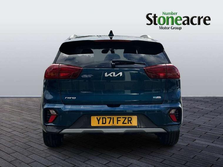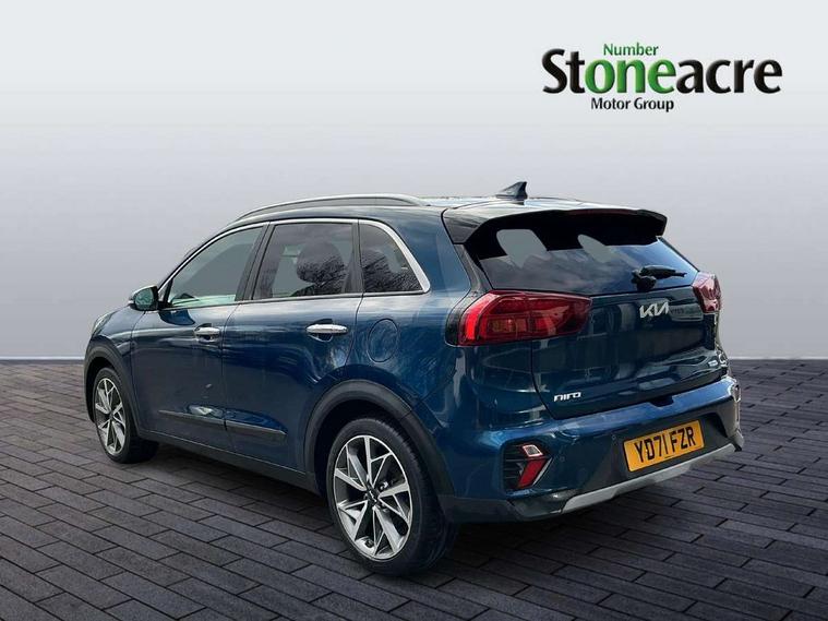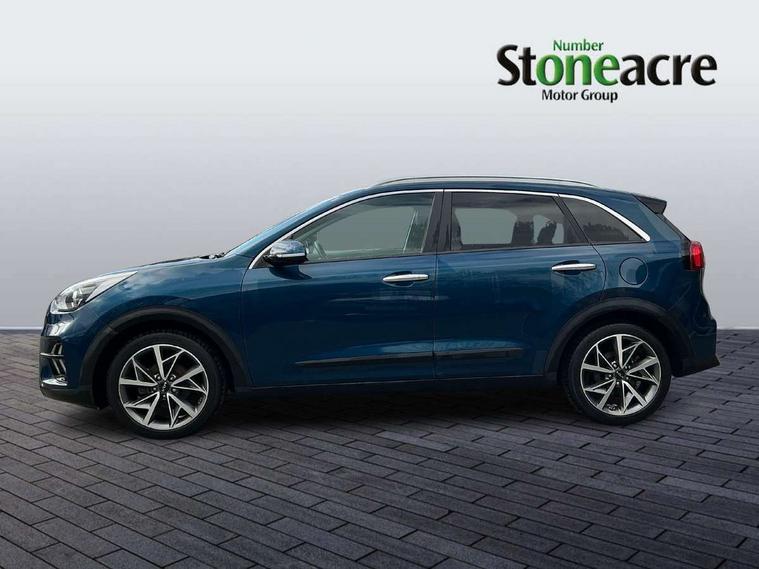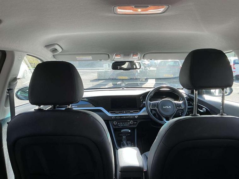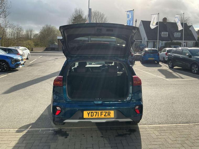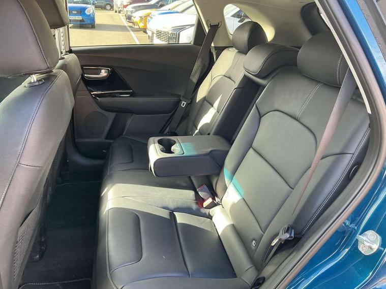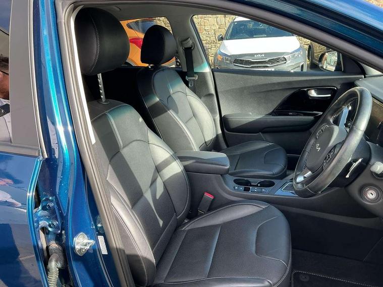 10.25" Touch screen satellite navigation with european mapping and traffic messaging channel, 7" full supervision cluster with TFT colour display, Adaptive smart cruise control function (SCC) with stop and go, Apple car play/Android Auto with voice control, Digital clock, Drive mode selector, Driver attention warning, Emergency stop signalling system, Forward collision avoidance assist, Front parking sensors, Kia connected services featuring TomTom live, Lane Following Assist (LFA), Lane keep assist, Motor driven power steering, Rear parking sensors, Reversing camera, Speed limiter, Trip computer with distance/fuel consumption/average speed, UVO connect, Wireless Smartphone charger, 'Shark fin' mobile antenna, 6 speakers, Bluetooth with music streaming, DAB Radio with MP3, Steering wheel mounted controls, USB connection located in centre console, USB port, All round electric windows with drivers and front passenger auto up/down function, Auto dimming rear view mirror, Automatic defog system, Automatic headlight control system, Black beltline mouldings, Black side sills, Black wheel arch mouldings, Body colour bumpers, Body coloured/high gloss door mirrors, Chrome door handles, Driver's side wide angle mirror, Electrically folding/adjustable/heated door mirrors with LED indicators, LED daytime running lights, LED fog lights, LED rear combination lights, Manual headlight levelling, Matt black radiator grille, Privacy glass - Rear windows and tailgate, Projector headlamps, Rain sensing front wipers, Rear spoiler, Rear wiper, Roof rails, Solar glass, Waistline black paint, Welcome and follow-me home light functionality, 3 x passenger assist grips, 60/40 split/folding 2nd row of seats, 8 way electric adjustable drivers seat, All-round height adjustable headrests, Aluminium door scuff plates, Bulb type overhead console lamp with sunglasses case, Centre console storage box, Centre room lamp, Cupholders in rear armrest, Driver/passenger sunvisors with illuminated vanity mirrors, Drivers seat power lumbar support, Dual zone automatic air conditioning, Front and rear door storage, Front/rear centre armrests, Headlining in Light grey, Heated front seats, Heated steering wheel, High gloss black lower console trim, High gloss black steering wheel trim, Illuminated ignition key hole, Interior door lock/unlock function, ISOFIX Child seat top tethers and anchor fixings, Leather trimmed door armrests, Leather trimmed gearshift, Leather trimmed steering wheel, Leather upholstery, Luggage area lamp, Luggage area load cover, Luggage net with hooks, Passenger seat height adjuster, Satin finish inner door handles, Seatback pocket - driver, Seatback pocket - front passenger, Steering wheel mounted paddle shift, Tilt/telescopic adjustable steering wheel, Under floor storage box, Ventiliation ducts to rear compartment, Towing pack - Niro, 3 point seatbelts on all seats, ABS, Automatic unlocking of doors in case of impact, Drivers knee airbag, Electric parking brake with auto hold function, Electronic stability control, Front passenger airbag cut-off switch, Height adjustable front seatbelts, Hill start assist control (HAC), Traction control, Twin curtain airbags with roll over sensor, Twin front and side airbags, Tyre pressure monitoring system, Alarm system and engine immobiliser, Deadlocks, Locking wheel nuts, Remote central door locking with fold away key, Speed sensitive auto door locking, Visible vehicle identification number, High gloss black centre fascia, High gloss black door inserts, 18" Alloy wheels, Tyre mobility kit,