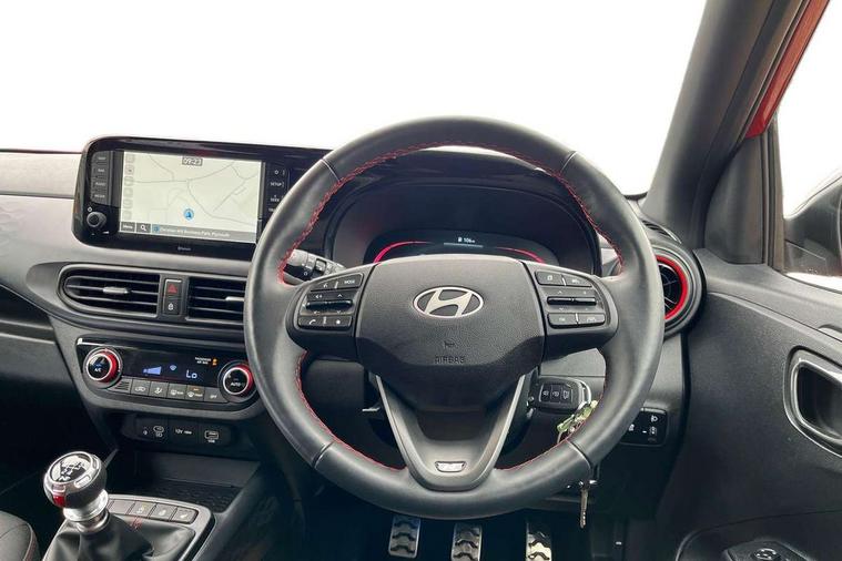 Apple car play/Android Auto, Bluelink mobile remote connectivity, Bluetooth connectivity with voice recognition, Cruise control, Driver attention alert system, eCall emergency call system, Forward Collision-Avoidance Assist (FCA) - Pedestrian/Cyclist, Front USB-C charging and USB-A data, Full-width 4.2" LCD instrument cluster, Intelligent speed limit assist, Lane departure warning system with lane keep assist - LKAS, Lane follow assist, PAS, Rear parking sensors, Rear view camera with guidelines, Roadside assistance, Start/Stop function, Tailgate, Trip computer, Wireless charging pad, 2 front/2 rear speakers, Rear USB-C device charger, Steering wheel audio, phone and cruise controls, 1 speed non intermittent rear windscreen wiper, Black finish on B pillars, Body colour door handles, Body coloured bumpers, Electric folding door mirrors, Electric front windows, Electric rear windows, Electrically adjustable and heated door mirrors, Flat metal emblem, Front fog lights, Front intermittent wipers, Glossy black door mirrors, Halogen bi-function headlights, Headlights inner with Blade design, Heated rear window, High beam assist, Indicator light on door mirrors, N Line Badging, N Line design front grille, Privacy glass - Rear windows and tailgate, Rear LED combination lamps in H pattern, Rear roof spoiler with integrated LED brake light, Rear side wing doors, Unique LED daytime running lights, 12v power outlet - front, 3 seat bench in 2nd row, 60/40 split folding flat to floor rear seats, Air conditioning, Auto light control, Bottle holders in front/rear doors + front centre console, Cabin and luggage compartment interior lighting, Cloth upholstery, Dashboard finisher in Dark Grey Metal with Flame Red air surrounds, Driver + passenger vanity mirrors, Driver's seat height adjustment, Driver/passenger sunvisors with ticket holders, Floor mats, Front door pockets, Front Head Restraints - Vertical and Horizontal Adjustment, Front LED blue mood lighting, Glove compartment, Heated front seats, Heated steering wheel, Height adjustable steering column, Isofix child seat preparation, Leather multifunction steering wheel, N Line branded leather gear stick, N Line branded leather steering wheel, Rear door pockets, Single front passenger seat, Vertical adjustment rear head restraints, 3x3 point rear seatbelts, Airbags - front, front side and curtain airbags, Anti-lock brake system (ABS), Autonomous emergency braking (AEB) with forward collision warning system, Brake assist function, Childproof rear door locks, Electronic stability control, Front and rear seatbelt reminder, Front seatbelt pretensioners, Hill start assist control (HAC), Passenger airbag deactivate switch, Traction control, Tyre pressure monitoring system, Immobiliser, Perimeter alarm, Rear occupant alert, Remote central locking, Second remote key, Speed sensitive auto door locking, 16" alloy wheels, N logo centre caps, Tyre repair kit,