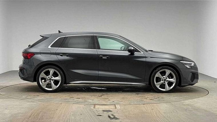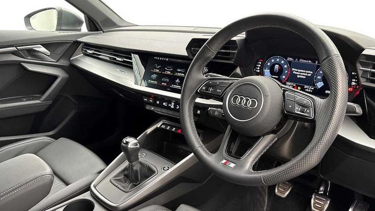 Audi drive select (Auto, Comfort, Dynamic, Efficiency and Individual), Audi smartphone interface, Audi Virtual Cockpit - 10.25" digital and colour instrument cluster, Automatic start/stop system with recuperation, Bluetooth interface, Collision avoidance assistant, Cruise control, e-Call (emergency call), Electromechanical power speed sensitive steering, Lane departure warning system, MMI Navigation Plus with high resolution 10.1" colour touch screen display, Rear parking sensors, Service indicator, Trip computer, Voice control system with natural language interaction, Sports suspension, 2xUSB-C connection with data and charging functions, 6 passive loudspeakers, DAB Digital radio, 3rd brake light, Acoustic glass windscreen, Aluminium window trim, Auto dimming frameless rear view mirror, Body colour exterior mirrors, Electrically adjustable/heated/folding/auto dimming door mirrors with integrated LED indications + kerb view function for passenger side, Front electric windows, Illuminated aluminium inserts front door sills with S logo, LED daytime running lights, LED headlights with LED rear lights and dynamic rear indicators, Light and rain sensors, Privacy glass - dark tinted rear window, rear door and side windows, Rear electric windows, Rear side air outlets in grained matt black, Rear side wing doors, Rear wiper, S line bumpers, S roof spoiler, 12V socket and storage compartment in front centre console, 3 seat bench in 2nd row, 3 spoke leather multifunction steering wheel, 40/20/40 split folding rear seat bench with cupholder, Black cloth headlining, Dual zone electronic climate control, Front and rear centre armrest in leather, Front and rear headrests, Front/rear floor mats, Height and reach adjustable steering wheel, Illuminated vanity mirror, Interior lighting - glove compartment light and right hand side, Luggage compartment floor covering, Manual boot compartment lid, Manually adjustable front seats, Seat side bolsters, Single front passenger seat, Stainless steel pedals and front footrest in black, Twin leather upholstery with front sports seats S embossed logo, Aluminium interior elements pack - A3 Sportback, LED interior lighting pack - A3 Sportback, S line styling pack - A3 Sportback, 3x3 point rear seat belts, Audi pre sense front, Driver and front passenger airbag with passenger airbag deactivation, Electronic Stabilisation Control (ESC) including ABS, ASR and EDL, First aid kit with warning triangle and 2 safety vests, Front side airbags with head airbags and interaction airbag, Pre-sense front with pedestrian and cyclist detection, Seatbelt monitoring, Tyre pressure loss indicator, Anti theft alarm, Anti-theft wheel bolts, Electronically operated child lock, Immobiliser, Remote control central locking, Accent surfaces in the dashboard and centre console in platinum grey silk effect paint finish, Dark spectrum aluminium inlays,