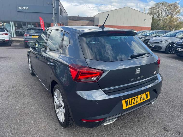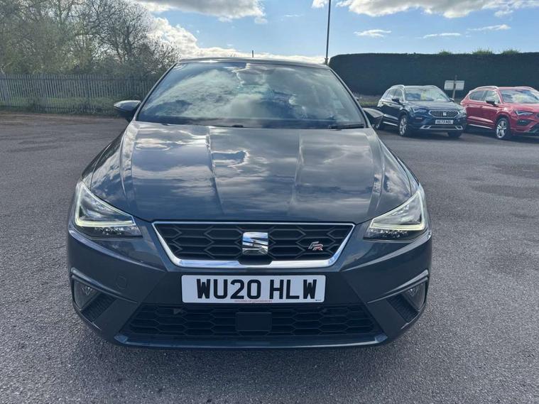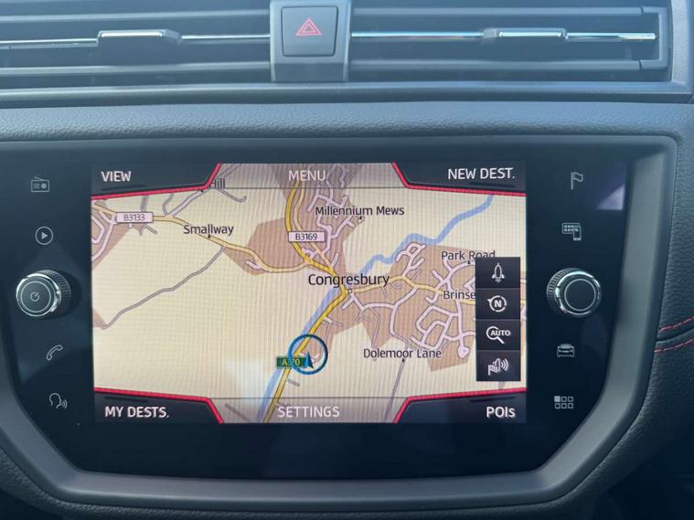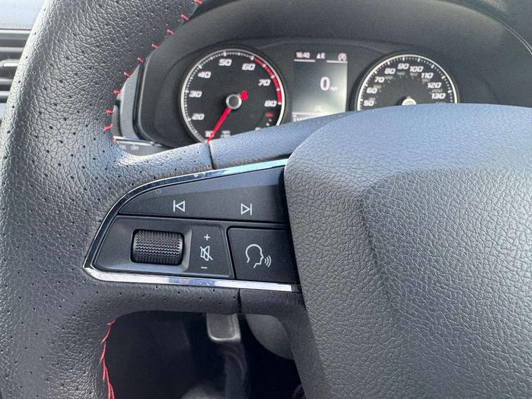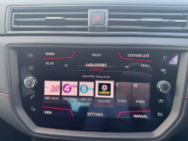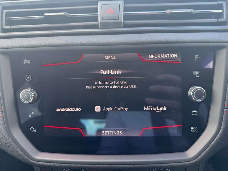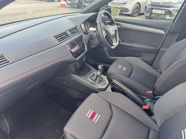 'Lights On' Reminder warning buzzer, Bluetooth Handsfree Phone Connection, Cruise control, Digital clock, Full Link Smartphone Integration with Mirror Link, Apple Car Play, Google Android Auto, Low fuel warning light, Outside temperature gauge, Power Steering, Satellite navigation system with 3D mapping, 8" touch screen, voice control and additional USB port, SEAT Drive profile, SEAT logo boot release, Trip computer, Sports suspension, 6 speakers, Auxiliary input socket, CD player, Digital Audio Broadcast (DAB) Tuner, Radio/MP3 player, SD card slot, SEAT USB media cable, Steering wheel mounted controls, USB port, Anti theft roof antenna, Auto dimming rear view mirror, Automatic headlights, Automatic rain sensing wipers, Body colour bumpers, Body colour door handles, Brilliant black door mirrors, Chrome front grille frame, Chrome grille, Coming/leaving home lighting function, Cornering front fog lights, Dark tinted rear windows, Electric folding door mirrors, Electric front windows, Electric headlight adjustment, Electrically adjustable and heated door mirrors, Exclusive FR rear bumper, Full LED headlights, LED daytime running lights, LED tail lights, Rear fog lights, Twin exhaust pipes, 3 rear headrests, 60/40 split folding rear seat, Air conditioning, Door and steering wheel ice metal decorative inserts, Driver's sunvisor with ticket holder/vanity mirror, Dust/pollen filter, Flat bottomed perforated leather steering wheel with red stitching and FR logo, Front courtesy lights, Front cupholders x 2, Front reading lights, Gear shift indicator, Glovebox, Height adjustable driver's seat, Height adjustable front/rear head restraints, Height adjustable passenger seat, Height/reach adjust steering wheel, Illuminated boot, Instrument lighting with brightness control, Leather handbrake, Multi-colour ambient interior lighting, Nora cloth upholstery, Passenger sunvisor, Rear top tether child seat ISOFIX attachment, Sports seats, Full LED headlight pack - Ibiza, 3 point seatbelts on all 3 rear seats, ABS, Active front headrests, Child locks on rear doors, Curtain airbags, Driver/Front Passenger airbags, ESP+EBA, Front assist (AEB), Front passenger airbag deactivation, Front side airbags, Hill hold control, Multi-Collision braking, Seatbelt warning, Tiredness recognition system, Tyre pressure monitoring system, Electronic engine immobiliser, Locking wheel bolts, Remote central locking + deadlocks, Volumetric alarm with back up horn, Leather dashboard, 17" Dynamic alloy wheels,