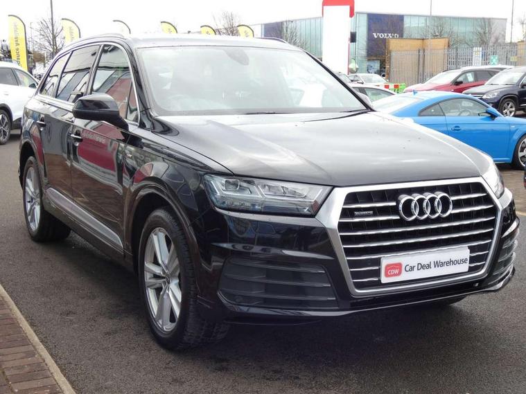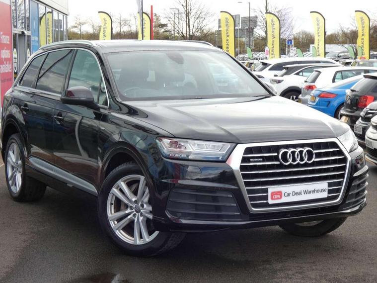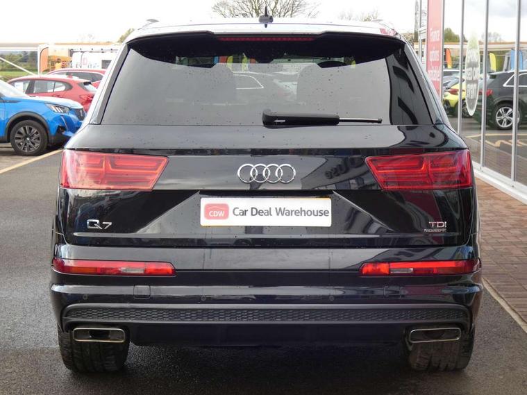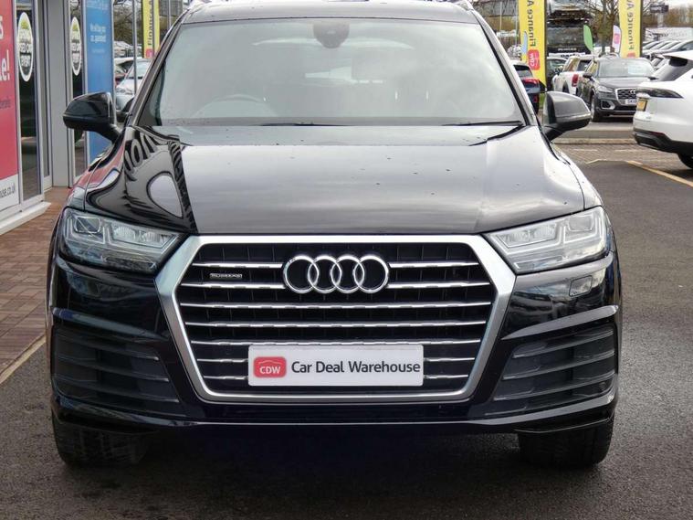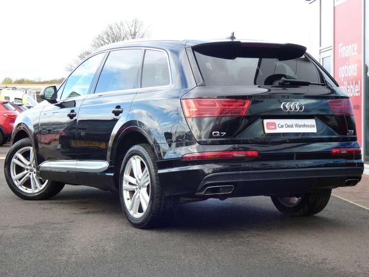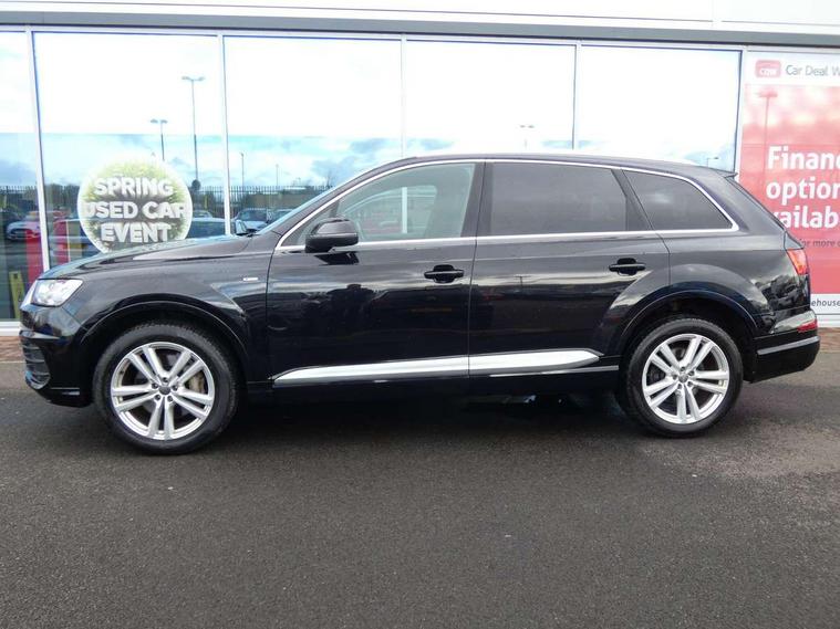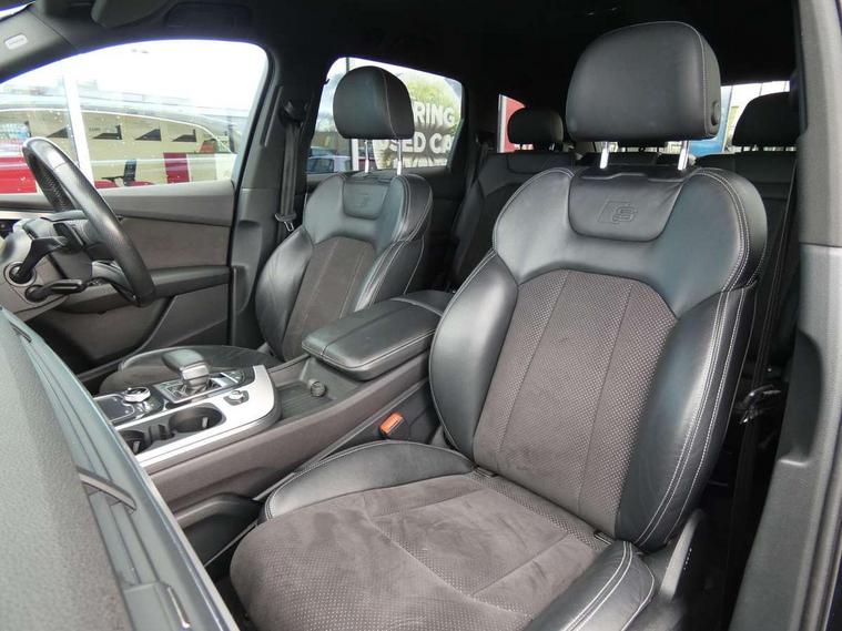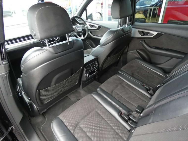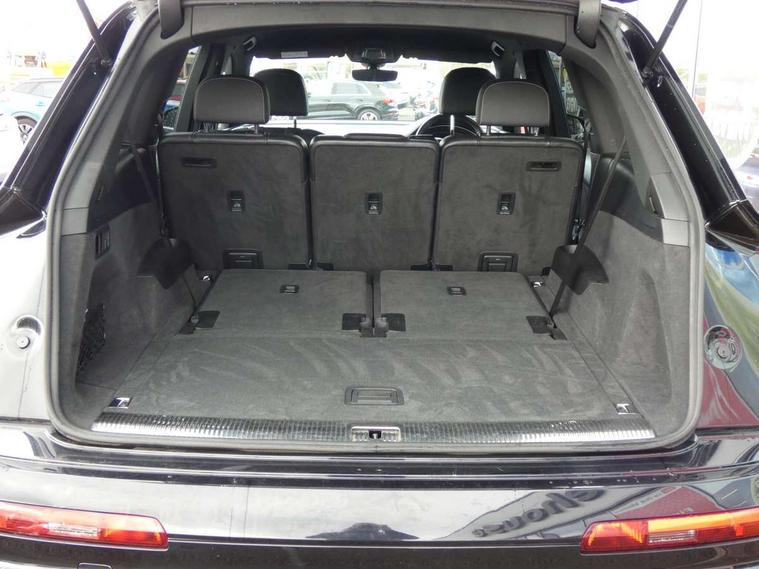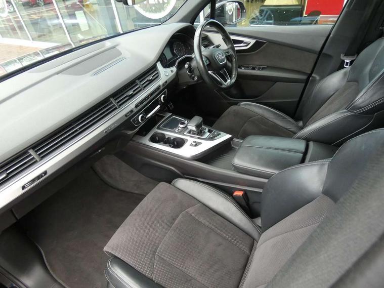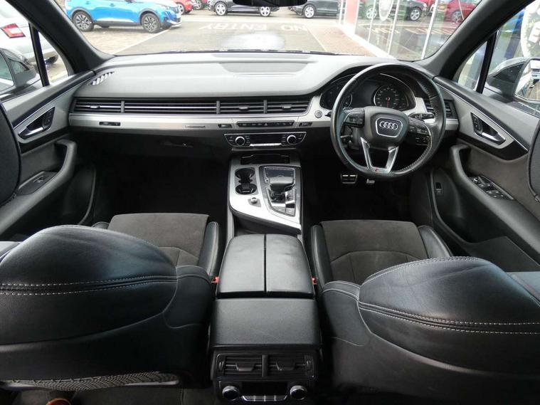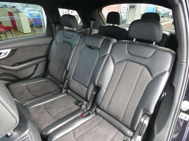 Audi drive select, Audi smartphone interface, MMI - Multi Media Interface control system, MMI navigation plus with touch and 8" colour display, DVD, SD card reader, 10GB music storage, Mobile phone preparation with bluetooth interface, Remote electric boot opening/closing, Service interval indicator, Servotronic speed related PAS, Speed limiter, Voice control system, 2 USB ports, Audi music interface, Aux-in socket, CD player, DAB digital radio module, MMI radio plus, Acoustic windscreen, Auto dimming rear view mirror, Body coloured bumpers, Dynamic rear indicators, Electric front+rear windows, Headlight washers, High beam assist, LED daytime running lights, LED tail lights, Loading sill protector in stainless steel, Platinum grey front lip spoiler, Rain and light sensors, Rear wiper, Roof spoiler, S Line body styling, 2 cupholders in front centre console, 35/30/35 split fold 2nd row seats, 4 way electrically adjustable lumbar support for drivers seat, 4 way electrically adjustable lumbar support for front passenger seat, Door sill trims with S line logo, Electric adjustable front seats, Four zone electronic climate control, Front ashtray and cigar lighter, Front centre comfort armrest with storage + cupholders, Front head restraints, Front sports seats, Gearshift paddles, Heated front seats, ISOFIX on front passenger and rear outer seats, Leather gear knob, Rear centre armrest with 2 cupholders, Rear headrests, Stainless steel pedals, Sunvisors with illuminated vanity mirrors, Top tether anchor plate for isofix child seat, Interior light pack - Q7, 3 point seatbelts on all seats, ABS+Electronic Brake force Distribution, Curtain airbags, Driver and passenger airbags, EDL + ASR, Electrically operated child locks on rear doors, Electromechanical parking brake, ESP, Front passenger airbag deactivation, Front side airbags, Hill descent control, Hill hold assist, Seatbelt warning, Traction control, Tyre pressure monitoring system, Warning triangle and first aid kit, Alarm with interior monitoring, Immobiliser, Keyless Go access/ignition system, Locking wheel bolts, Remote central locking, Chrome door inserts,