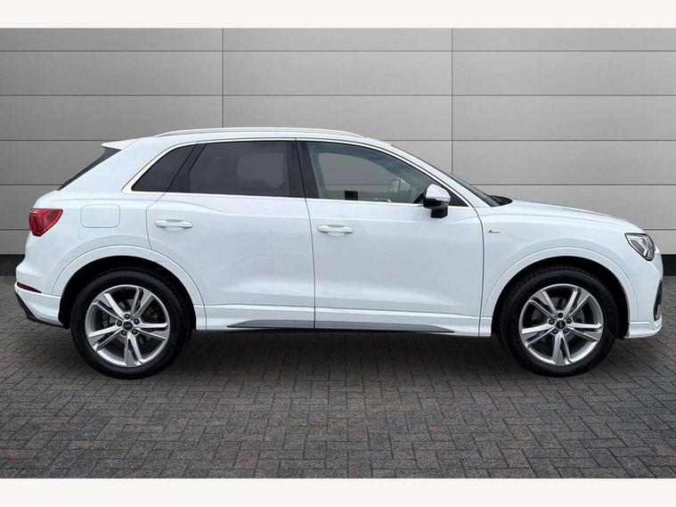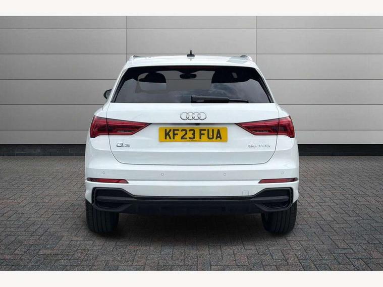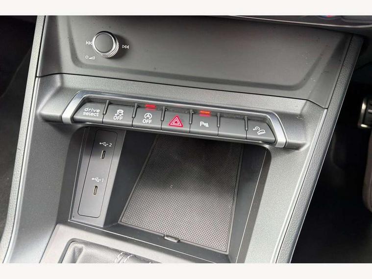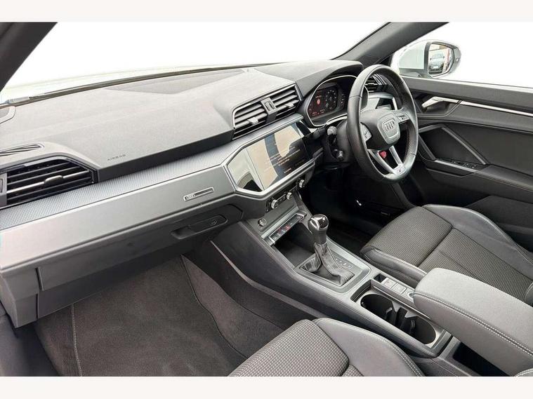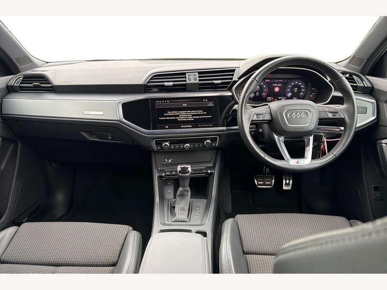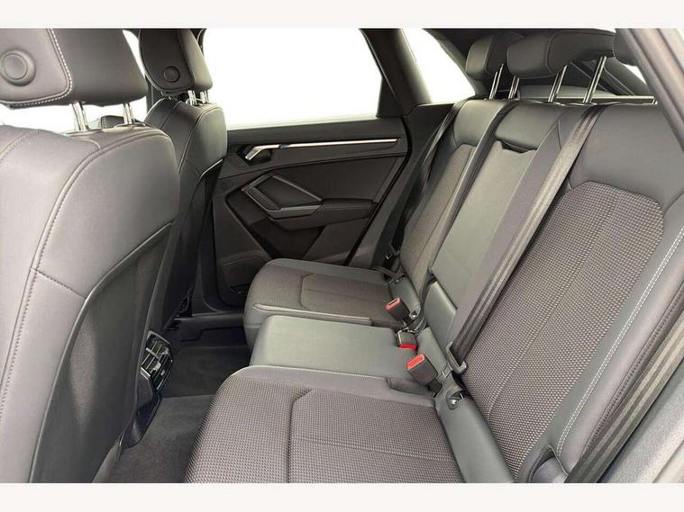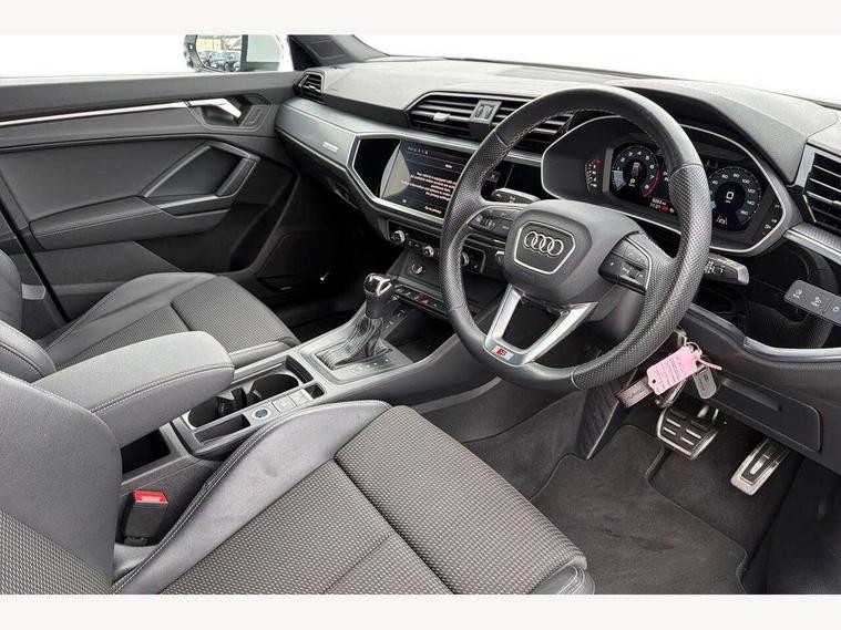 Amazon alexa Integration, Audi drive select, Audi lane departure warning, Audi smartphone interface includes wireless Apple carplay/Android Auto, Audi Virtual Cockpit - 10.25" display, Bluetooth interface, Camera based traffic sign recognition, Legal emergency call, MMI Navigation Plus with high resolution 10.1 inch touchscreen colour display, Power operated tailgate, Progressive steering, Service interval indicator, Start stop system with recuperation, Voice control system with natural language interaction, Sports suspension, 2 USB-C ports with charge and data functions, 6 passive loudspeakers, DAB digital radio module, Acoustic windscreen, Aluminium roof rails, Aluminium window trim, Anthracite black radiator grille, Auto dimming frameless rear view mirror, Body colour front spoiler blade, Body coloured bumpers, Electrically folding, adjustable and heated door mirrors with integrated LED side indicators and kerb view function for passenger side, Front and rear electric windows, Front fog lights, Front side air inlets in matt platinum grey, Grille vertical bars in aluminium silver/Matt, High gloss black finish B and C pillars, LED Dynamic rear indicators, LED headlights with LED daytime running lights, LED rear lights, LED third brake light, Privacy glass dark tinted rear and rear-side windows (from B-pillar backwards), Rain and light sensors, Rear diffuser grille in grained matt black, Rear diffuser strip in matt anthracite black, Rear side wing doors, Rear wiper, S line badges on front wings, S Line front and rear bumpers, Side skirt insert in matt Platinium grey, Variable front intermittent wipers, 12V socket in rear centre console, 3 seat bench in 2nd row, 3 spoke leather multifunction steering wheel features S badging and grips in perforated leather with contrast stitching, 40:20:40 folding with manual adjustment for 60:40 forwards/backwards position and backrest angle, Adjustable rear seat bench/backrest with centre armrest and cupholder, Black cloth headlining, Dual zone electronic climate control, Front and rear black floor mats with contrast stitching in rock grey, Front and rear headrests, Front and rear roof module including reading lights, Front centre armrest, Glove compartment lighting, Height and reach adjustable steering wheel, Illuminated door sill trims with S logo, ISOFIX child seat mounting for front passenger with airbag deactivation and outer rear seat including top tether attachment point for outer rear seats, Luggage compartment light, Manual front seats with height adjustment, Perforated leather gearknob, Single front passenger seat, Stainless steel luggage compartment sill finisher, Stainless steel pedals, Ambient lighting pack - Q3, Non smoking pack - Q3, 3x3 point rear seatbelts, 6 airbags - Driver, front passenger, curtain and side windows, Audi pre-sense front with pedestrain and cyclist recognition, Electrically operated child locks on rear doors, Electromechanical parking brake, Electronic stabilisation control including ABS, ASR and EDL, Front seatbelt reminder, Hill descent control, Hill hold assist, Pre sense basic, Seatbelt monitoring, Tyre pressure warning, Warning triangle and first aid kit, Anti theft alarm, Anti theft wheel bolts, Immobiliser, Remote central locking, Aluminium look interior elements, Dark matt brushed aluminium inlay, Detail dashboard around MMI touch colour display in glass look, black with surround in aluminium look, Leatherette door armrest,