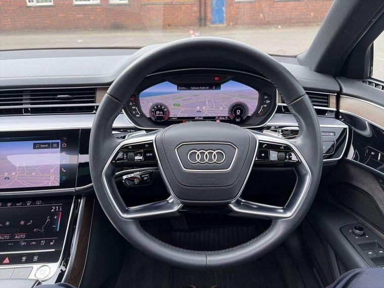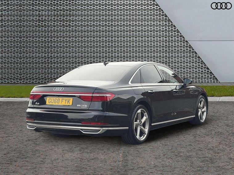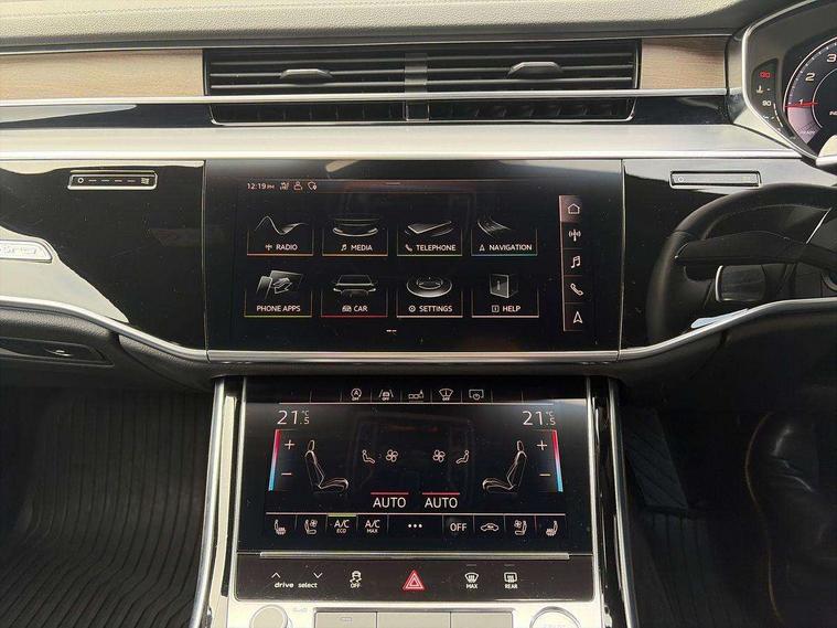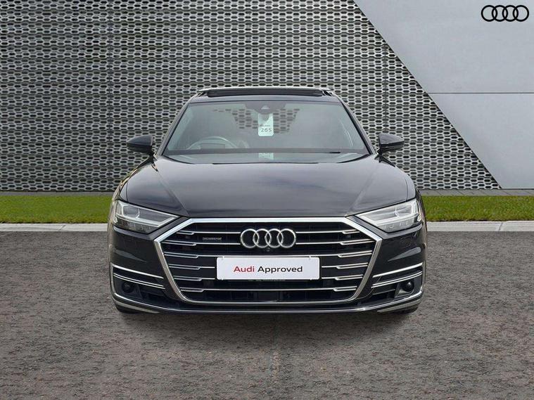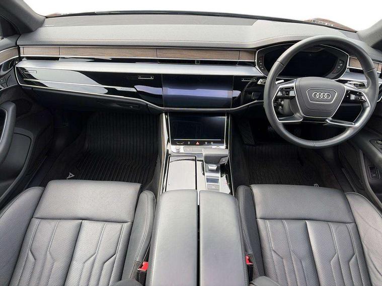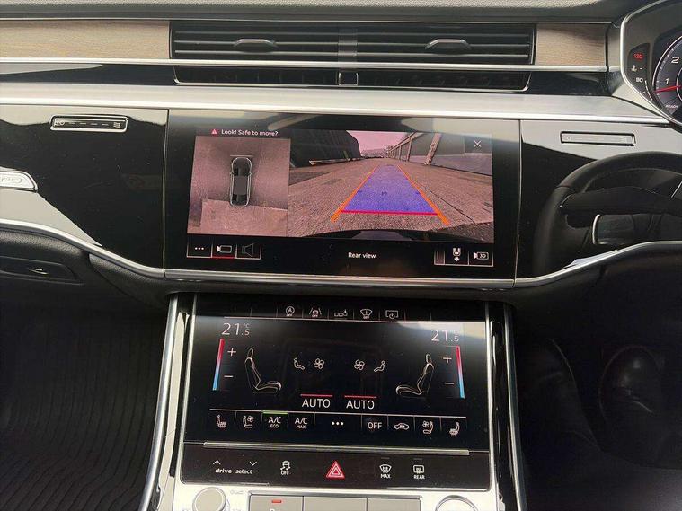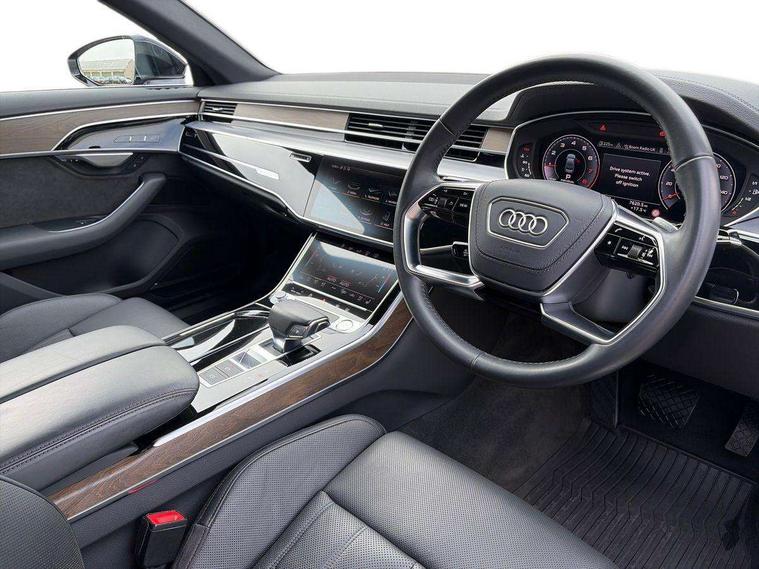 'Lights On' Reminder warning buzzer, Adaptive cruise control with Stop and Go + pre sense front, Audi connect, Audi drive select, Audi phone box with wireless charging, Audi smartphone interface, Camera based traffic sign recognition, Colour driver's information system display, Head up Display, Lane departure warning system, MMI navigation plus with MMI touch, Power tailgate, Rear view camera, Remote fuel filler release, Service interval indicator, Virtual cockpit, Adaptive air suspension, DAB digital radio module, DVD System, MMI radio plus, USB connection, Acoustic windscreen, Auto dimming rear view mirror, Automatic headlight control system, Body colour bumpers, Body colour door handles, Body colour door mirrors, Body colour side protection with aluminium trim strips, Electric front windows, Electric heated, adjustable, folding and dimming door mirrors with memory, Electric rear windows with isolation switch, Heat insulating glass windscreen and side windows, Heated rear window, Heated windscreen washer jets, LED brake lights, LED daytime running lights, Reverse activated kerb-view adjustment on passenger's door mirror, 230V socket, 3 rear seats, Centre console with cupholders, Climate controlled seats, Comfort front centre armrest, Cooled glovebox, Door armrest with storage, Door pockets with bottle holder, Dust/pollen filters, Electric 4-way lumbar support for front seats, Electric adj front seatbelt height + memory, Electric front seats with memory function, Front/rear floor mats, Height/reach electric steering column with easy exit function, ISOFIX child seat mounting in front passenger and rear outer seats, Jack and tool kit, Leather gear lever, Multifunction steering wheel, Passenger footwell storage net, Rear centre armrest, Rear head restraints, Roof mounted sunglasses holder, Sunvisors with illuminated vanity mirrors, LED ambient interior lighting pack - A8, Light and rain sensor pack - A8, Luggage compartment pack - A8, 3 point seatbelts on all rear seats, ABS/EBD, Active front headrest system, ASR traction control, Driver and front passenger airbag with front side and head airbags, EDL traction control, Electromechanical parking brake, Emergency brake assist, ESP, Front passenger airbag deactivation, Hill hold assist, Hill start assist, Pre sense basic, Predictive pedestrian protection, Rear child proof door locks, Seatbelt warning, Tyre pressure warning light, Warning triangle and first aid kit, Advanced key, Anti theft alarm tow away protection, Anti theft wheel bolts and loose wheel warning, Locking wheel bolts, Remote central locking, Brushed aluminium lower inlay, Space saver spare wheel,