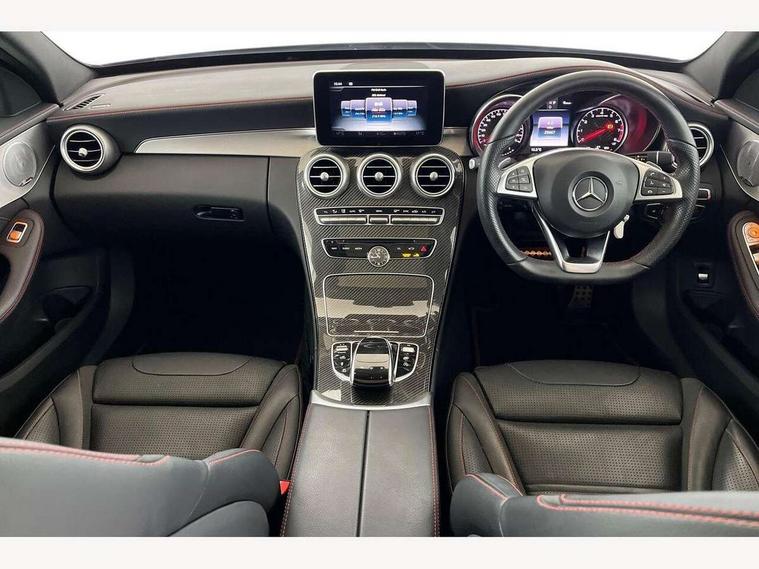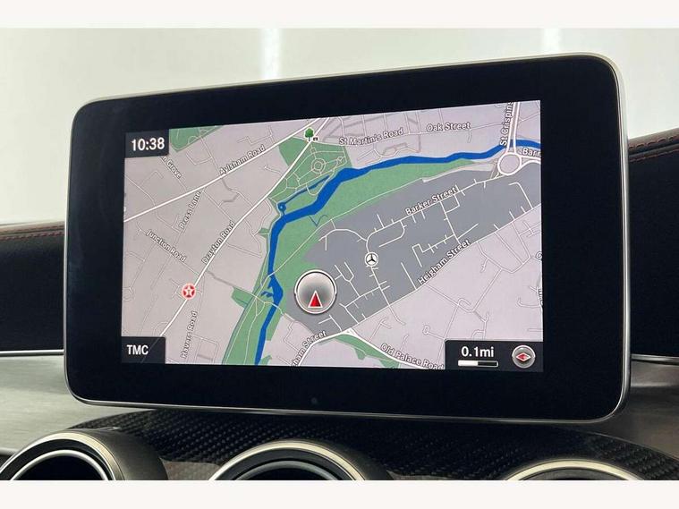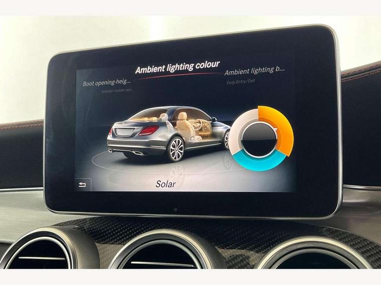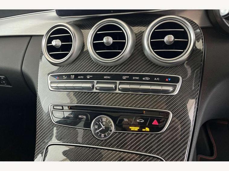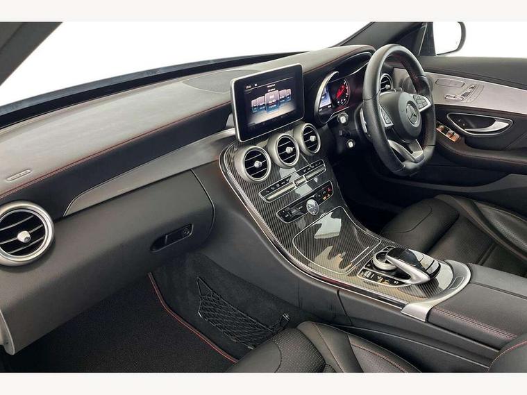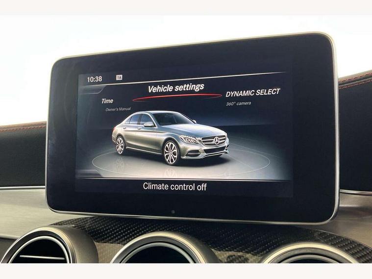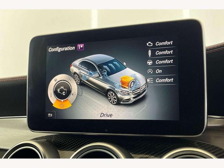 Active park assist with parktronic system, Analogue clock, Attention assist, Bluetooth system, Collision prevention assist, COMAND online nav with colour display, radio/CD/DVD/MP3, SD card, 10GB music, Emergency Call system, speed limit assist, linguatronic voice control, DYNAMIC SELECT with a choice of driving modes (ECO, Comfort, Sport, Sport+ and Individual), Multi function trip computer, Outside temperature gauge, Remote boot release, Service indicator (ASSYST PLUS), Speed sensitive steering, AMG Ride Control sports suspension, 2 USB ports in centre console, Burmester surround sound system, DAB Digital radio, SD card slot, Adaptive brake lights, AMG body styling, Body coloured bumpers, Chrome pins diamond radiator grille with integrated stars, Electric front sliding and fixed rear panoramic glass sunroof, Electric windows one touch open/close, Electrically adjustable and heated door mirrors, Green tinted glass, LED daytime running lights, LED tail lights, Rain sensor windscreen wipers, 2 cupholders in front centre console, 3 spoke flat bottomed nappa leather sport steering wheel, Advanced multicolour ambient light and LED interior light, AMG floor mats with red stitching, Auto Mercedes-Benz child seat recognition sensor, Dual zone automatic climate control, Front and rear head restraints, Front centre armrest with storage compartment, Gearshift paddles, Heated front seats, Illuminated glovebox, Lumbar support, Multifunction steering wheel, Rear top tether child seat ISOFIX attachment, Sports pedals with stainless steel surfaces and rubber studs, Sunvisors with illuminated vanity mirrors, Lighting pack - C class, Memory pack - C Class, Mirror pack - C Class, Seat comfort pack - C Class, Stowage space pack - C Class, 3 rear 3 point seatbelts, ABS with Brake Assist, Active bonnet, Adaptive brake system, Child proof door locks, Drivers knee airbag, Dual stage driver/passenger airbags, Electronic parking brake, ESP with ASR, Front passenger seat occupancy sensor, Front side airbags, Hill start assist, Rear seatbelt warning indicator, Red seat belts, Tyre pressure monitoring system, Warning triangle and first aid kit, Window airbags, Alarm system/interior protection/immobiliser, Chrome surround in electric key, Keyless entry and keyless start, Remote central locking, Artico upholstered dashboard with contrast stitching, Tyre inflation kit,