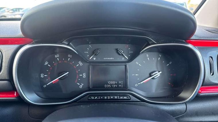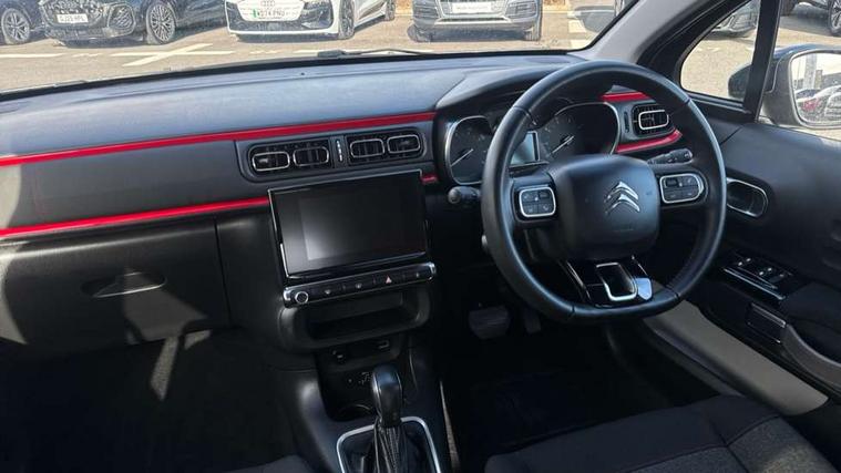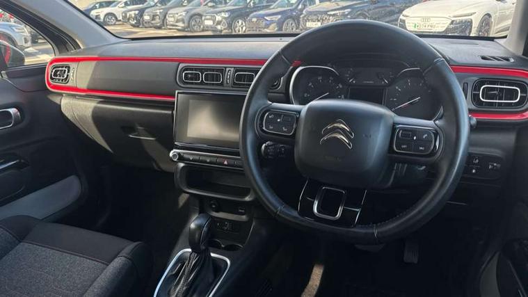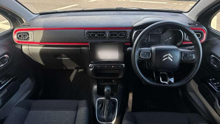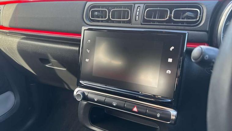 Citroen connected CAM, Coffee Break Alert, Cruise control + speed limiter, Exterior temperature display, Lane departure warning system, Mirror screen with Apple CarPlay and Android auto, Multi function on board trip computer, Rear parking sensors, Rev counter, Reversing camera, Speed limit recognition and speed warning, Variable assistance power steering, Auxiliary input socket, Bluetooth hands free and media streaming, Citroen connected DAB radio with 6 speakers, Steering wheel mounted audio controls, Auto dimming electrochrome rear view mirror, Automatic lights and windscreen wipers, Body colour bumpers, Dark tinted rear glass, Electric adjustable/heated/folding door mirrors, Electric front windows + one touch + anti-pinch, Electric rear windows with one touch/anti-pinch, Front fog lights, Height adjustable halogen headlights, LED daytime running lights, Rear wiper, Wheel arch extensions, 12 volt socket in cabin, Automatic air conditioning, Boot light, Driver and passenger's sun visor with courtesy mirror, Front courtesy reading lights, Front cupholders x 2, Front seat back storage pockets, Height adjustable driver's seat, Height adjustable front headrests, Height/reach adjust steering wheel, Lashing eyelets in boot, Leather steering wheel with satin chrome and brillant black inserts, Luggage style interior door handles, Rear cupholder, Rear isofix mounting points (outside seats) with top tether, Split folding rear seats, Three height adjustable rear head restraints, Technology pack - C3, Urban red ambiance pack - C3, ABS with Electronic brakeforce distribution and Emergency braking assistance, Airbags - Driver/front passenger, front lateral and curtain, Drivers/passengers and rear seats unfastened seat belt warning, Electric child locks, Electronic stability control, Five 3 point inertia reel seat belts, Front seatbelt pretensioner, Hill start assist function, Tyre pressure monitor, Alarm, Immobiliser, Locking wheel nuts, Remote central locking + deadlocks, Space saver spare wheel,