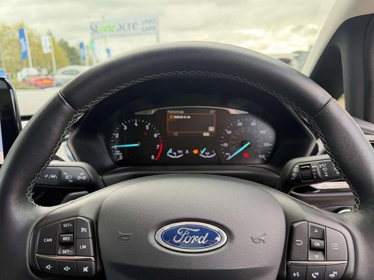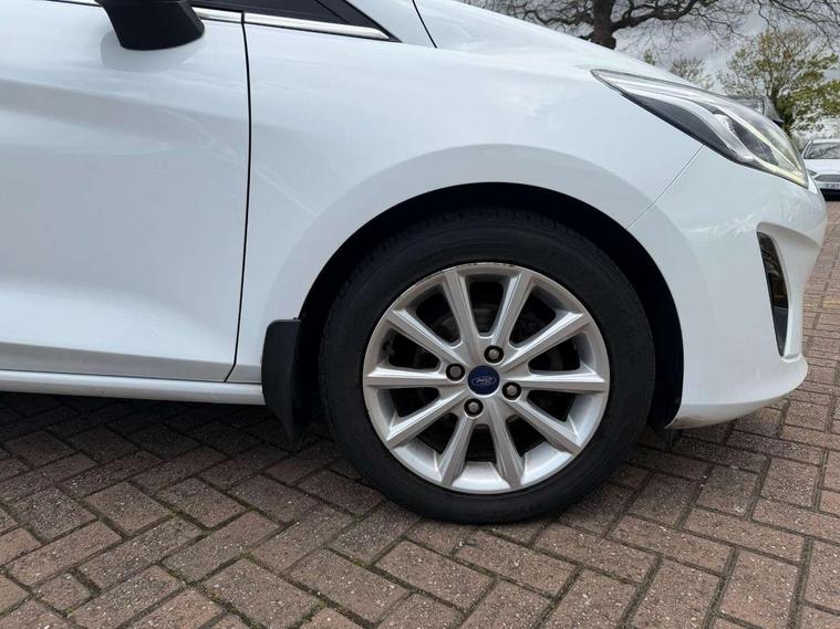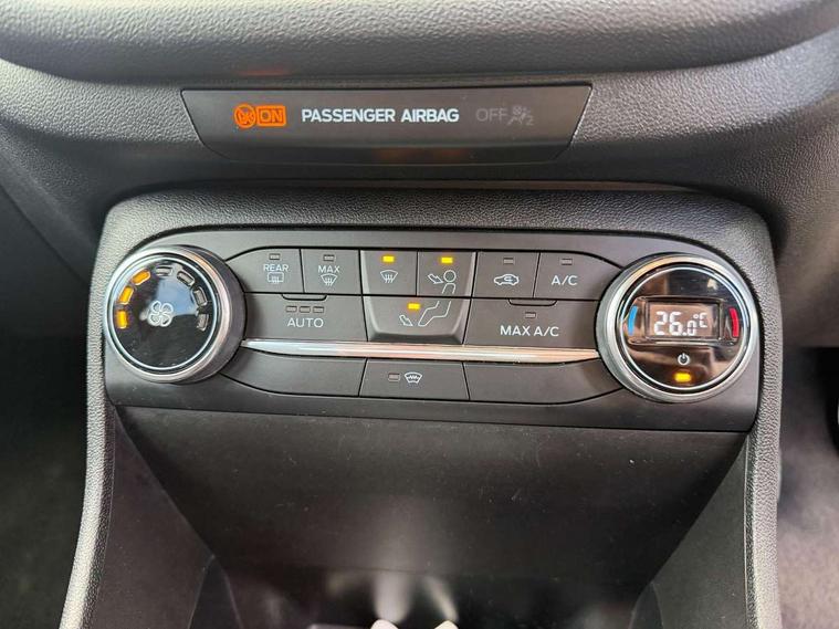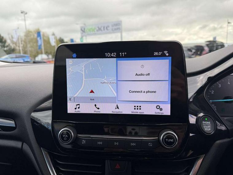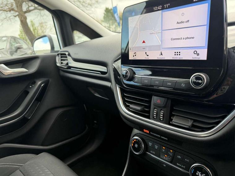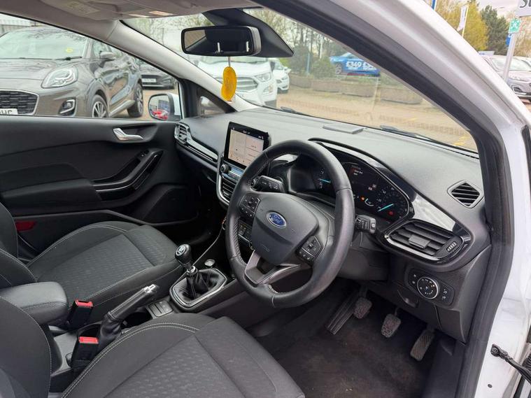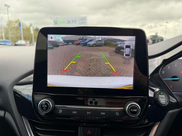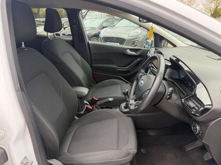 Bluetooth system, Electric power steering, Ford easy fuel, Trip computer, 2 USB ports, Auxiliary input socket, DAB Digital radio, Steering wheel mounted controls, Auto dimming rear view mirror, Automatic headlights, Body colour bumpers, Body colour door handles, Body colour electric adjustable heated door mirrors with integral indicators, Body colour rear spoiler, Chrome beltline trim, Chrome lower window surround, Cornering front fog lights, Electric front windows/one touch facility, LED Night signature to rear lights, LED rear lights, Power foldable door mirrors with puddle lights, Quickclear heated windscreen, Rain sensing wipers and auto dimming rear view mirror, Rear privacy glass, Rear wiper, Tinted glass, Upper front grille chrome surround, 12V Accessory socket in centre console, 3 spoke leather trimmed steering wheel with audio control, 60/40 split folding rear seat, Adjustable head restraints, Ambient lighting, Boot carpet, Centre console with armrest and illuminated cupholders, Chrome inner door handles, Cloth upholstery, EATC - Electronic Auto Temperature control, Footwell illumination, Front and rear velour floor mats, Front map reading lights, Front seat and rear pockets, Height adjustable driver's seat, Illuminated glovebox, Leather gear knob, Leather trimmed handbrake handle, Load area light, Luxury woven headliner, Overhead console with sunglasses holder, Pollen filter, Rake/reach adjustable steering wheel, Rear centre head restraint, Driver assistance pack - Fiesta/Titanium/Titanium X/Active B+O/Active X/ST-Line X, NCAP Pack - Fiesta, 3 point seatbelts on all rear seats, ABS+EBA, Curtain airbags, Driver and passenger airbags, Drivers knee airbag, Electronic stability control with hill start assist, Front passenger airbag deactivation, Front side airbags, Seatbelt warning, Tyre pressure monitoring system, MyKey system, Remote central locking & engine immobiliser, Thatcham Cat.1 alarm,