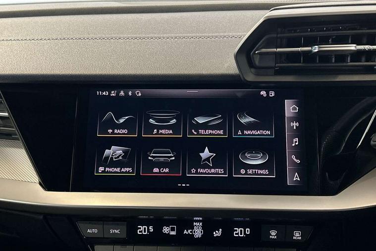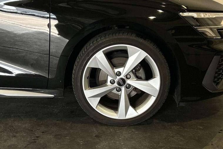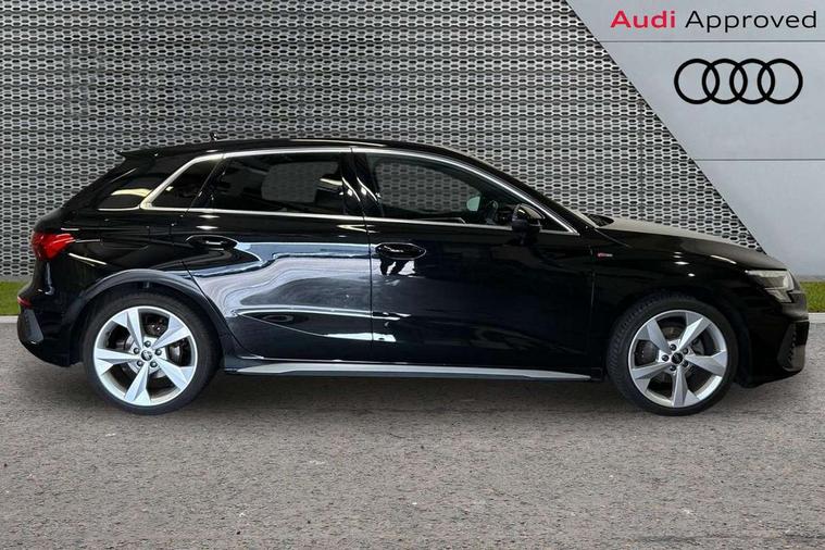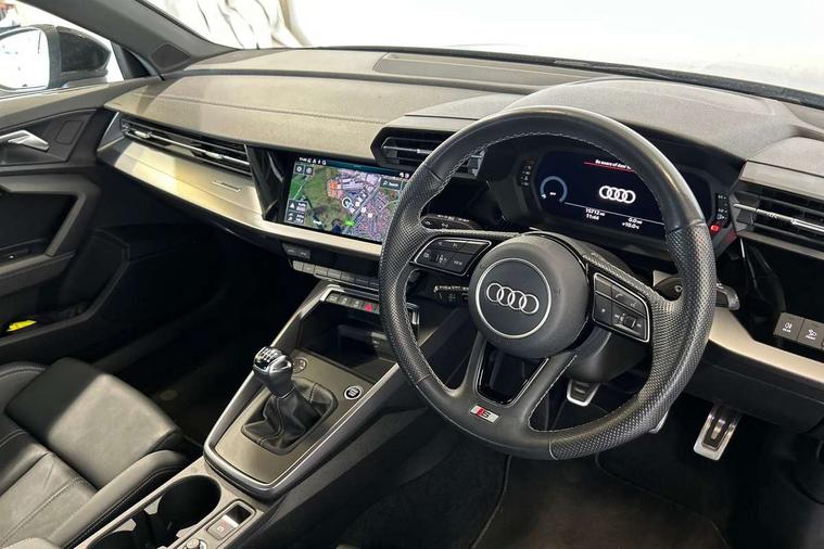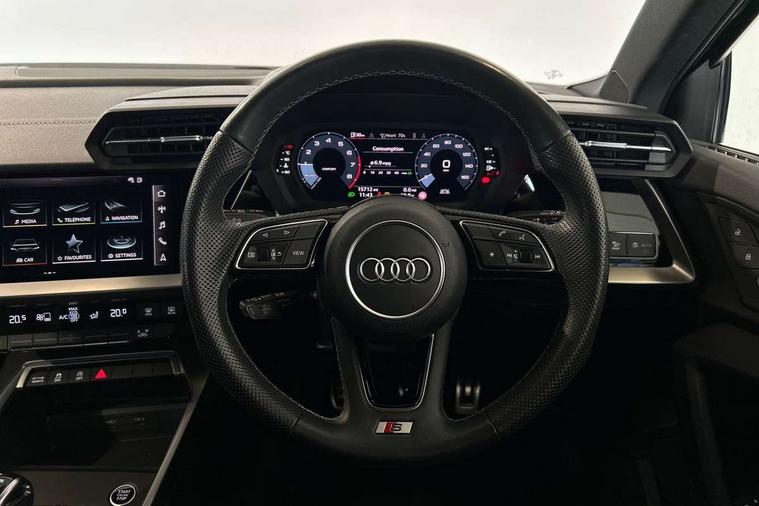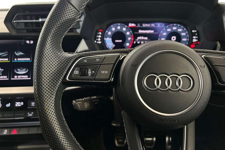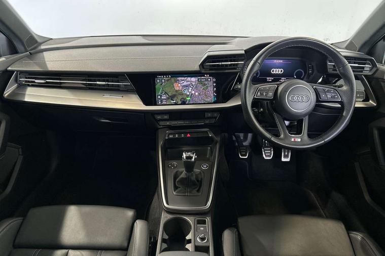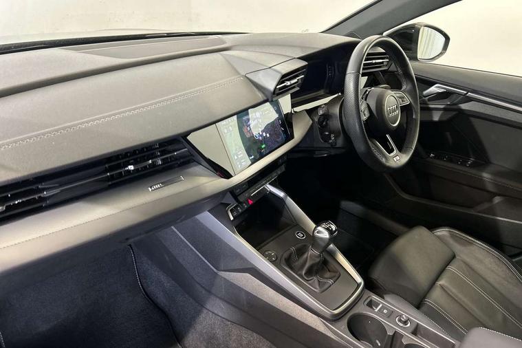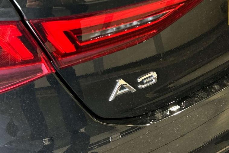 Audi drive select (Auto, Comfort, Dynamic and Individual), Audi smartphone interface, Audi Virtual Cockpit - 10.25" digital and colour instrument cluster, Automatic start/stop system with recuperation, Bluetooth interface, Camera based traffic sign recognition, Collision avoidance assistant, Cruise control, e-Call (emergency call), Electromechanical power speed sensitive steering, Lane departure warning system, MMI Navigation Plus with high resolution 10.1" colour touch screen display, Rear parking sensors, Service indicator, Trip computer, Voice control system with natural language interaction, Sports suspension, 2xUSB-C connection with data and charging functions, 6 passive loudspeakers, DAB Digital radio, 3rd brake light, Acoustic glass windscreen, Aluminium window trim, Auto dimming frameless rear view mirror, Body colour exterior mirrors, Electrically adjustable/heated/folding/auto dimming door mirrors with integrated LED indications + kerb view function for passenger side, Front electric windows, Illuminated door sills with aluminium inserts at the front with S logo, LED daytime running lights, LED headlights with LED rear lights and dynamic rear indicators, Light and rain sensors, Privacy glass - dark tinted rear window, rear door and side windows, Rear electric windows, Rear side air outlets in grained matt black, Rear side wing doors, Rear wiper, S line bumpers, S roof spoiler, 12V socket and storage compartment in front centre console, 3 seat bench in 2nd row, 3 spoke leather multifunction steering wheel, 4 way electrically adjustable lumbar support for driver and front passenger, 60/40 split folding rear seat bench, Black cloth headlining, Dual zone electronic climate control, Front and rear centre armrest in artificial leather, Front and rear headrests, Front/rear floor mats, Height and reach adjustable steering wheel, Interior lighting - glove compartment light and right hand side, Luggage compartment floor covering, Manual boot compartment lid, Manually adjustable front seats, Seat side bolsters, Single front passenger seat, Stainless steel pedals and front footrest in black, Twin leather upholstery with front sports seats S embossed logo, Aluminium interior elements pack - A3 Sportback, LED interior lighting pack - A3 Sportback, S line styling pack - A3 Sportback, 3x3 point rear seat belts, Driver and front passenger airbag with passenger airbag deactivation, Electronic Stabilisation Control (ESC) including ABS, ASR and EDL, First aid kit with warning triangle and 2 safety vests, Front side airbags with head airbags and interaction airbag, Pre-sense front with pedestrian and cyclist detection, Seatbelt monitoring, Tyre pressure loss indicator, Anti theft alarm, Anti-theft wheel bolts, Electronically operated child locks, Immobiliser, Remote control central locking, Dark spectrum aluminium inlays, accent surfaces in the dashboard and centre console in platinum grey silk effect paint finish,
