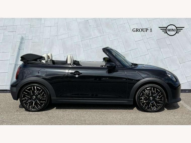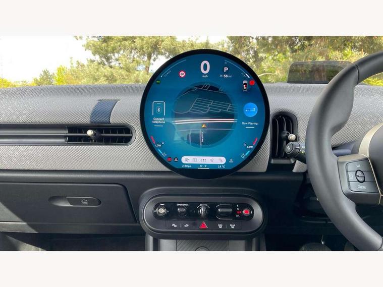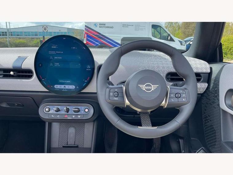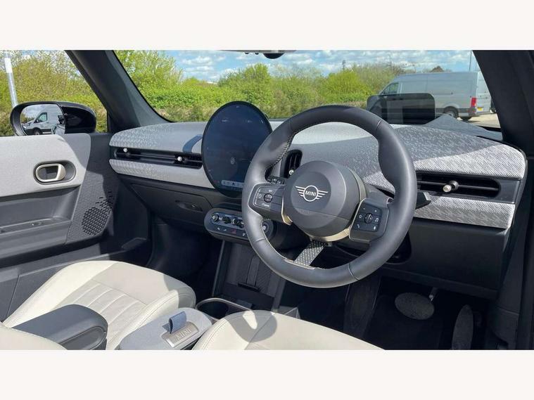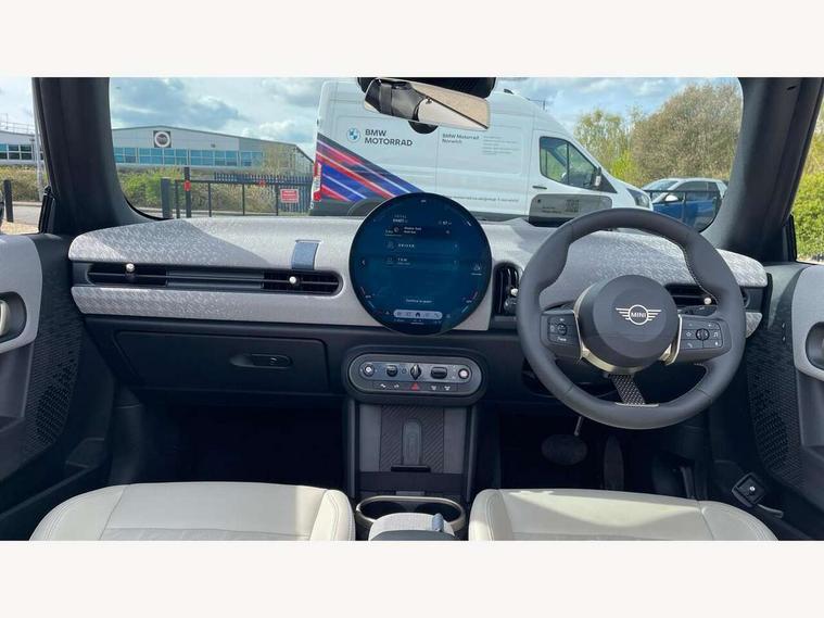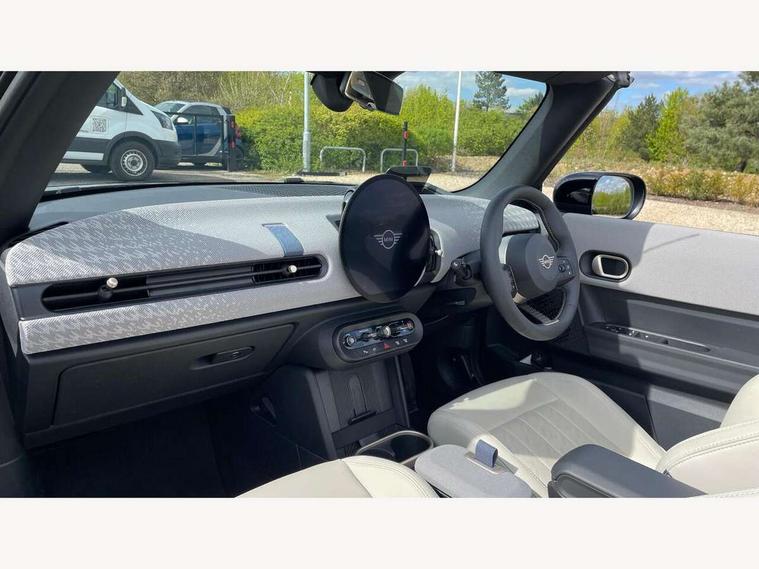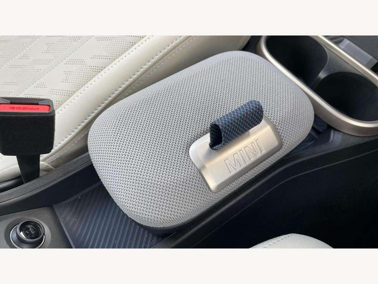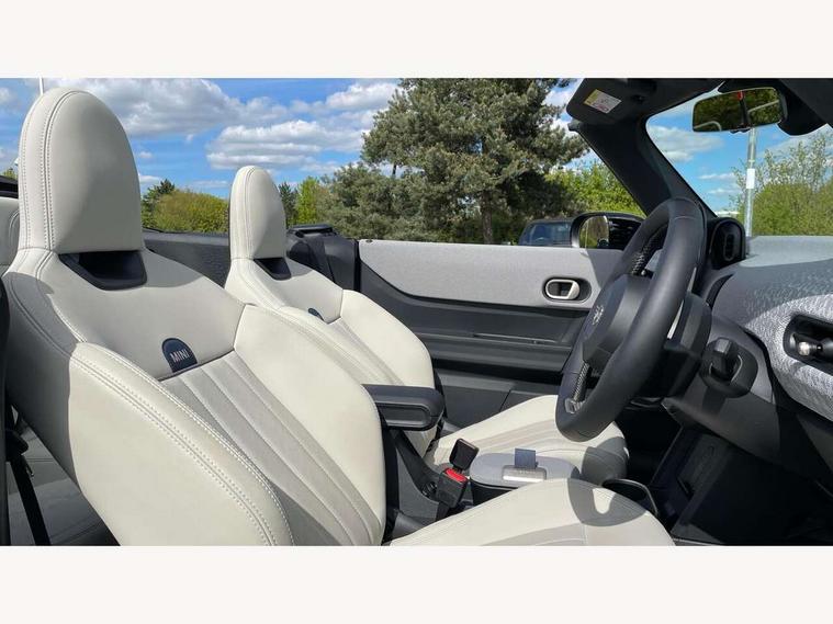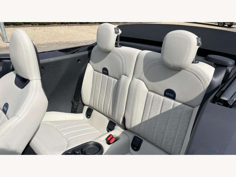 Always open timer, Central toggle bar, Circular OLED Screen, Compatible mobile phone bluetooth with audio streaming, Cruise control, Digital instrument cluster, e-Call (emergency call), MINI Experience Modes, Mini navigation system, On board computer, PAS, Service interval indicator, 7 speed steptronic transmission with double clutch, DAB Digital radio, Personal eSim, Auto headlights, Electric front windows, LED 3rd brake light, LED daytime running lights, LED Headlights, LED indicator lights, LED rear lights, Logos in Vibrant Silver, Rain sensor window wipers, Rear boot, Rear fog lights, Vibrant silver grille surround, Wind deflector, 2 seat bench in second row, 2 zone automatic air conditioning, 60/40 rear seat bench, Ambient lighting, Floor mats, Front and rear head restraints, Front compact armrest, Heated steering wheel, Height adjustable passenger seat, Lidded storage box in grey knit, Light headliner, Luggage compartment lighting, Single front passenger seat, Sport Vescin Steering Wheel black with vibrant silver accents, Sunvisors with vanity mirrors, Vescin synthetic leather upholstery includes dash knit in beige with grey accents, Driving assistant pack - Cooper Convertible, Park assistant pack - Cooper Convertible, 3 point seatbelts on all four seats, 6 Airbags - front, side, head and seat belt tensioners, Anti-lock braking system (ABS), DSC - Dynamic Stability Control, Electronic parking brake, Front and rear disc brakes, Front ISOFIX (iSize), Front passenger airbag deactivation, Traction control, Tyre pressure monitoring system, Alarm, Immobiliser, Physical spare key (not digital), Remote central locking, Blue decorative dash strap, Tyre repair kit,