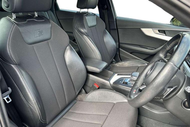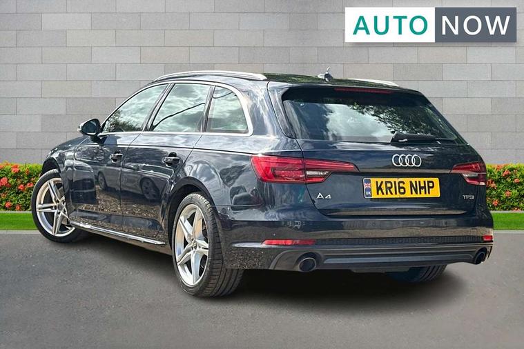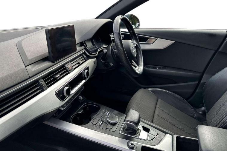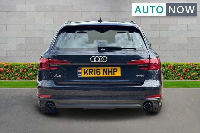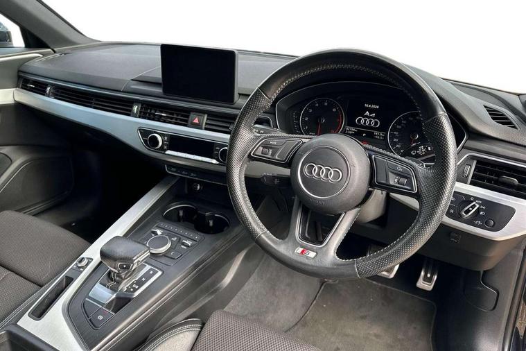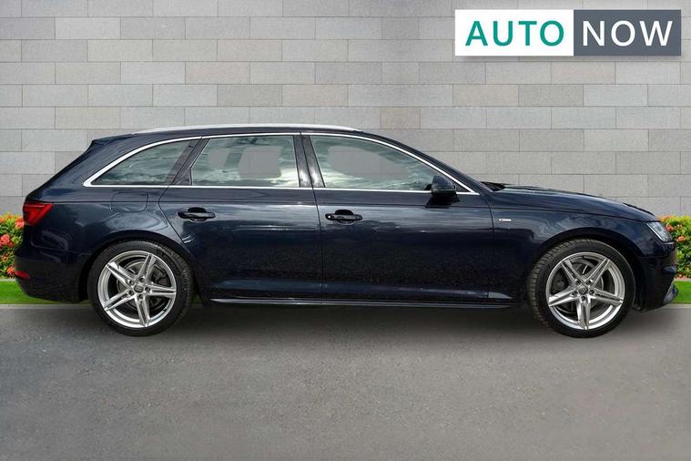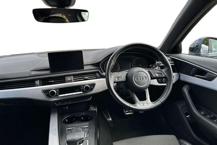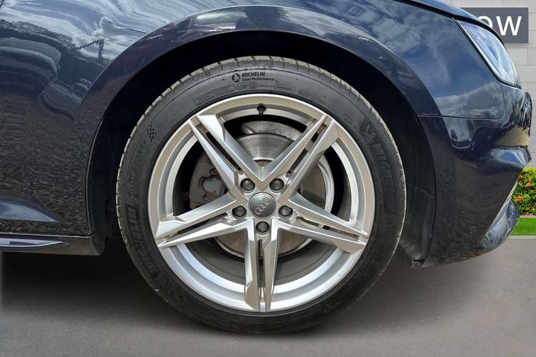 Audi drive select, Audi parking system plus with front and rear sensors, Audi Pre sense collision avoidance, Audi smartphone interface, Electro-mechanical PAS, Power boot opening and closing, Service interval indicator, Stop/start button, Voice control system, 2 USB ports, Aux input, DAB digital radio module, MMI radio plus with CD player, Acoustic windscreen, Aluminium roof rails, Auto dimming rear view mirror, Automatic headlights + automatic windscreen wipers, Body colour bumpers, Body colour door mirrors, Chrome rolled exhaust, Electric adjustable heated door mirrors, Electric front windows, Electric rear windows, Headlight range control, LED daytime running lights, Rear diffuser in Twilight grey matt, Rear wiper, Twilight grey matt radiator grille with chrome inlay, 3 zone climate control, 4 way electric lumbar support for driver and front passenger, Black cloth headlining, Front centre armrest with 12v socket, Front sport seats, Front/rear floor mats, Gearshift paddles, Illuminated door sill finishers, Isofix child seat preparation for front passenger/outer rear seats inc passenger airbag deactivation, Jack and tool kit, Perforated leather gearknob, Reach + rake adjustable steering column, Rear headrests, Retractable load area cover, Split folding rear seats, Stainless steel pedals, Sunvisors with vanity mirrors, Top tether anchor plate for isofix child seat, Exterior aluminium pack - A4, S line exterior styling pack - A4 Avant, 3 point seatbelts on all rear seats, ABS/EBD, Adaptive driver and front passenger airbags, Electromechanical parking brake, ESP, First aid kit, Front head airbags, Front seatbelt pretensioners + load limiters, Front side airbags, Seatbelt warning, Traction control, Tyre pressure monitoring system, Warning triangle, Locking wheel bolts, Remote central locking, Thatcham category 1 alarm + immobiliser, Space saver spare wheel,