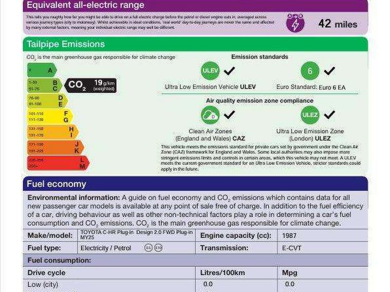 12.3" Digital Combimeter, 12.3" multimedia display screen, 4 rear parking sensors, Acceleration suppression at low speed, Adjustable speed limiter, Blind spot monitor, Bluetooth connectivity, Built-in and cloud navigation, Colour multi information display, Digital speedometer, Digital tachometer, eCall emergency call system, Electric power steering, Emergency driving stop system, Emergency steering assist, Front parking sensors with auto braking, Hybrid system indicator, I/P center cluster X, Instrument finish panel, Intelligent adaptive cruise control, Intelligent parking sensors (objects and vehicle), Lane Departure Alert (LDA) switch on steering wheel, Lane departure alert with steering control, Lane trace assist, Memory on speed limiter, MyT connected services, Power tailgate, Pre collision system with emergency steering assist, Pre collision system with intersection detection, Proactive driving assist (PDA), Push button tailgate release, Rear cross traffic alert, Remote boot door release in cabin, Reversing camera, Reversing camera display in audio screen, Road sign assist - RSA, Safe exit assist, Smart entry and push button start, Smart voice assist, Start and stop, Static guide lines on reversing camera, Toyota Smart Connect multimedia system with wireless Smartphone integration incl Apple CarPlay, Voice recognition, Wireless phone charger, Electric accelerator pedal, Fast charger 32A Mennekes cable, Front and rear stabilizers, Vehicle Stability Control (VSC), 6 speakers, Aux-in connector, DAB Radio (Digital Audio Broadcasting), Front USB Type-C connector, Rear USB Type-C connector, Road events, Toyota touch 2 with go navigation, USB connector integrated with radio and CD player, Anti-jam protection on power windows, Auto dimming rear view mirror, Auto high beam, Auto up and down function on all power windows, Auto wipers, Automatic headlights, Automatic headlights cut-off, Automatic rear flashing hazard lights, Automatically retractable door mirrors, B - Pillar in Black, Black centre air vent, Black painted insert on boot door, Black side air vents, Black wheel arch mouldings, Body colour door handles, Body coloured front bumper, Body coloured rear spoiler, Body coloured roof, Clear headlights design, Door scuff plates, Electric heated door mirrors, Emergency brake-light signal (EBS), exhaust tail pipe and diffuser, Flush front and rear door handles, Follow me home headlights, Front and rear power windows, Fuel caution label, Gloss black door belt moulding, Grained front side grille, Grained lower front grille, Grained rear bumper extension, Gunmetal surround on lower front grille, Headlight cut off reminder, LED daytime running lights, LED fog lights, LED High mounted stop light, LED rear brake lights, LED rear combination lights, LED reverse light, Manual headlight levelling, Noise reduction layer on windscreen, Power adjustable door mirrors, Pre wiring for towing hook, Privacy glass, Puddle lights, Rain sensor, Rear bumper with gunmetal insert, Rear fog lamps, Rear side wing doors, Rear tailgate, Rear window defogger, Rear window wiper, Reflective LED headlights, RHD aiming, Satin chrome centre air vent surrounds, Satin chrome insert on centre air vents, Satin chrome insert on side air vents, Satin chrome side air vent surrounds, Silver large centre cap surrounds, Standard Front Side Grille, Standard roof, Turning signal integrated in door mirrors (LED), UV-filter on driver and passenger windows, UV-filter on rear windows, Variable front intermittent wipers, Wing liner front with sil rear without sil, 12v power outlet - front, 2 rear coat hooks, 220v power output in luggage compartment, 3 bench rear seats in 2nd row, 3 rear headrests, 3 spoke synthetic leather steering wheel, 60/40 split folding 2nd row rear seats, Adjustable rear headrests, Ambient lighting on front doors, Assist grips front and centre pillar, Audio and telephone switches on steering wheel, Boot light, Boot under floor storage, Clean air filter, Cloth upholstery with grey stitching, Cover front console box, Dark grey interior door handles, Door Edge Protection Film, Driver and front passenger personal light, Driver and front passenger Whiplash Injury Lessening seats, Dual zone automatic air conditioning, Fabric door trim, Floor mats - border/stitching, Front console box, Front cupholders, Front door pockets, Front headrests, Front room light, Front sports seats, Full-flat loading, Glovebox with internal light, Hard tonneau cover, Heat pump system with humidifier, Heated driver and front passenger seats, Heated steering wheel, Hooks for luggage holding net, Hybrid key cover, Illuminated entry system, ISOFIX child restraint system, LED Overhead Console light, Light on driver sun visor, Light on passenger sun visor, Luggage floor board with protection mat, Manual telescopic steering wheel, Manual tilt steering wheel, Manually height adjustable driver seat, Manually height adjustable front passenger seat, Manually reclining driver seat, Manually reclining front passenger seat, Manually sliding driver seat, Manually sliding front passenger seat, Mat Fitment, Microphone on front personal light, Mirror on driver sun visor, Mirror on passenger sun visor, Multimedia switches on steering wheel, Pollen air filter with deodorising odour eliminator, Power adjustable lumbar support on driver seat, Rear door cup holder, Rear door pockets, Rear passenger personal lights, Remote air conditioning, Single compartment glovebox, Single front passenger seat, Slow opening on lower glovebox, Synthetic leather gear shift knob, Voice recognition switch on steering wheel, 3x3 point rear seat belts, ABS+EBD+Brake assist, Driver and passenger side airbag, Driver knee airbag, Electronic parking brake, Front and rear seatbelt reminder, Front passenger airbag on/off switch, Front to front oncoming car and motorbike daytime detection, Hill start assist control (HAC), Pre collision system with pedestrian, cyclist and motorbike day detection, 