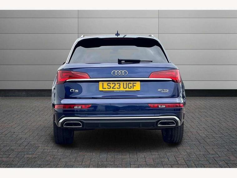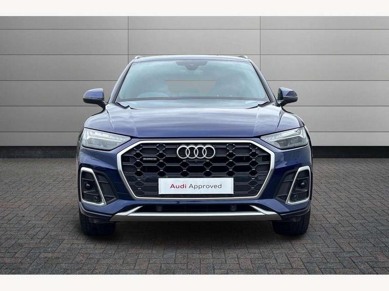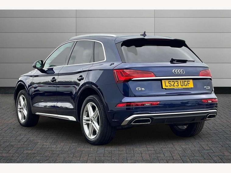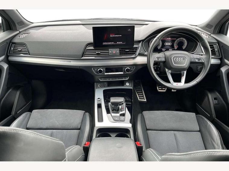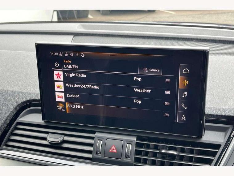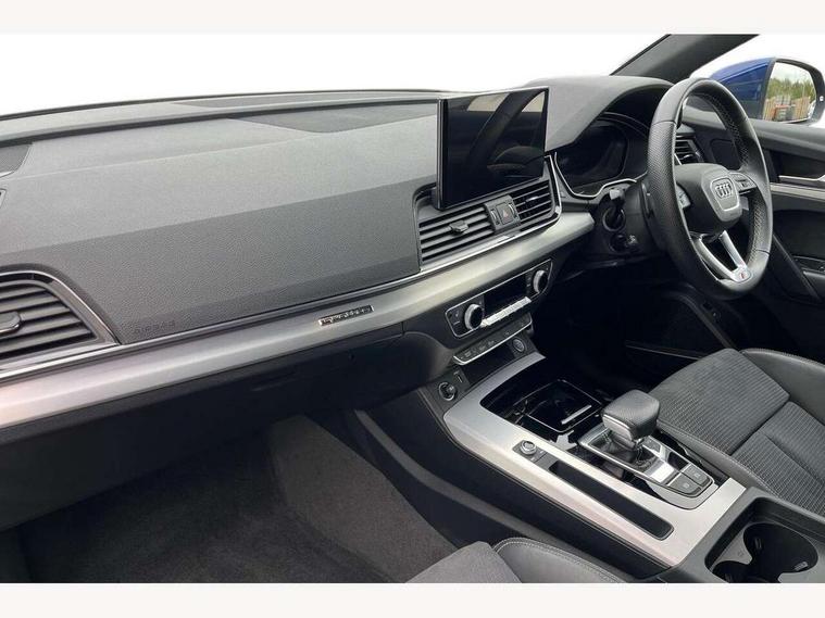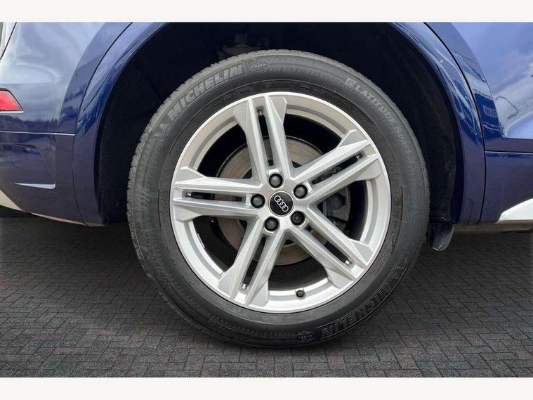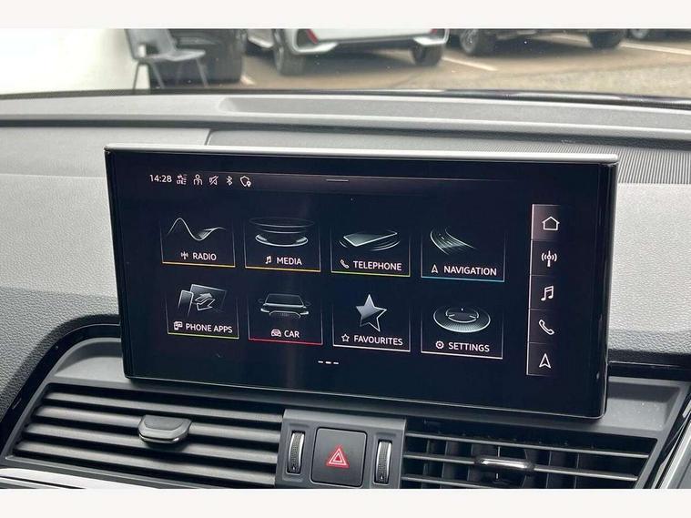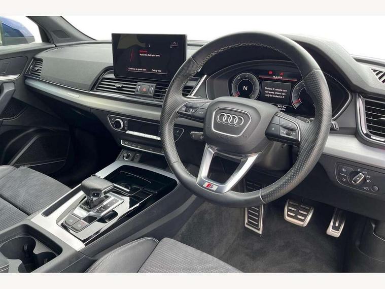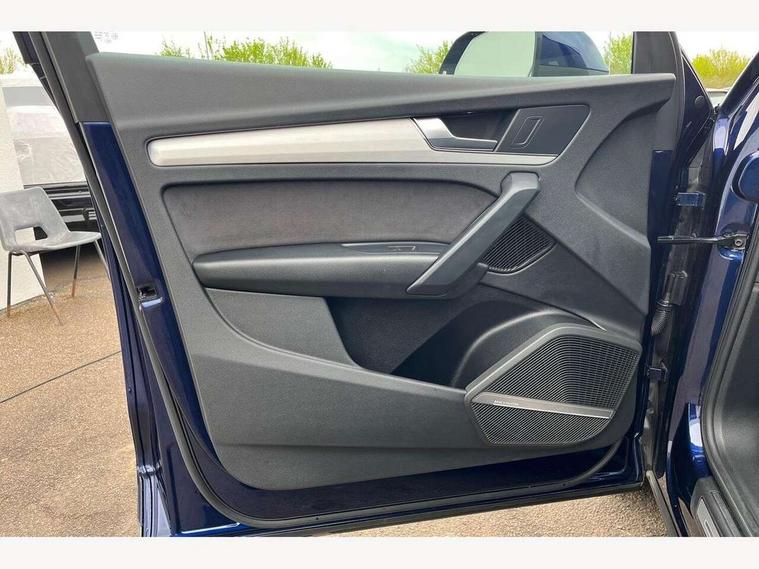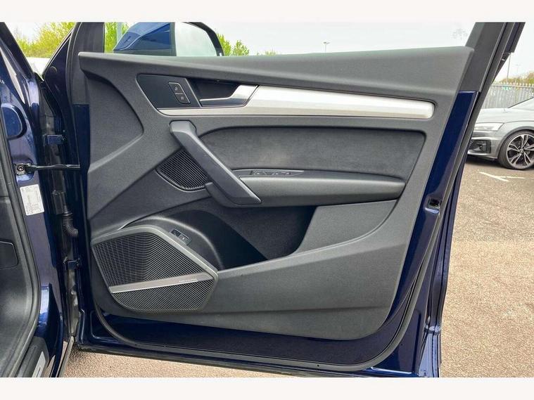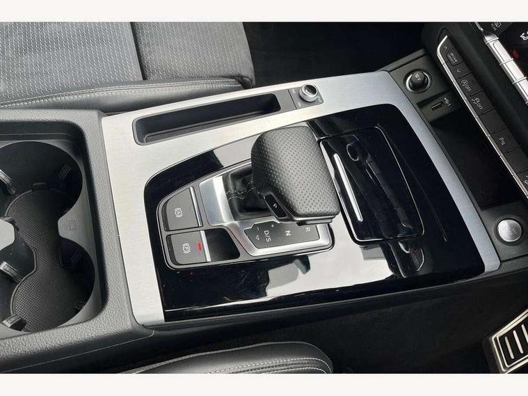 Acoustic front and rear parking sensor, Audi connect safety and service (e-call), Audi connect with Amazon Alexa Integration, Audi drive select, Audi virtual cockpit plus with 12.3" screen and three different layout designs, Audi wireless smartphone interface, Automatic start-stop system with coasting functionality and efficiency programme, Bluetooth interface, Electro - mechanical power assisted steering, MMI navigation plus with 10.1" touch screen, Power tailgate, Reversing camera, Service interval indicator, Voice control system with Audi hotword activation "Hey Audi", Diesel particulate filter, Quattro on demand, S line sports suspension, 2 x USB charging port with aux input socket, 8 loudspeakers, DAB Digital radio, Acoustic windscreen, Aluminium roof rails, Audi matrix LED headlights with dynamic front and rear indicators, Auto dimming door mirrors, Auto dimming frameless rear view mirror, Automatic headlight adjustment, Automatic headlights and windscreen wipers, Body colour bumpers, Body colour door mirrors, Body colour rear diffuser with matt aluminium silver surrounds, Body colour underbody protection, Chrome plated exhaust trims, Daytime running lights, Door sills in Selenite silver, Electric adjustable/heated/folding door mirrors, Front air inlet surrounds in aluminium, Front and rear electric windows, Front radiator grille in honeycomb design, Headlight washers, High level LED brake light, Lower bumpers painted in contrast Manhattan grey, Rear chrome trim strip below lights, Rear privacy glass and rear side windows, Rear side wing doors, Rear wiper, Roof bars, S Line badges on the front wings, S Line front and rear bumpers, S Line rear spoiler, S Line side skirts, 3 rear headrests, 3 spoke leather multifunction steering wheel with S badging perforated leather grips, 40:20:40 split folding 3 rear bench seat in 2nd row with rear centre armrest, Black cloth headlining, Comfort front centre armrest, Contrast stitching on seats, steering wheel and gear lever gaiter, Deluxe 3 zone electronic climate control, Front/rear floor mats, Gear lever in black leather, Heated front seats, Height adjustable front head restraints, Height/reach adjustable steering column, Illuminated door sill trims with S logo, Luggage compartment cover, Manual seat adjustment with 4-way electric lumbar support, Removable luggage compartment floor, Single front passenger seat, Stainless steel pedals, Sunvisors with vanity mirrors, High gloss pack - Q5, LED interior light pack - Q5, 3 point seatbelts on all seats, 6 airbags - Driver, front passenger, curtain and side airbags, Electrically operated child locks on rear doors, Electromechanical parking brake, Electronic stabilisation control including ABS, ASR and EDL, First aid kit with warning triangle and vests, Front passenger airbag deactivation, Hill descent control, Hill hold assist, ISOFIX child seat mounting for front passenger seat and ISOFIX child seat mounting with Top Tether for outer rear seats, Multi collision brake assist, Pop-up bonnet for pedestrian protection, Pre sense city, Seat belt force limiter, Seatbelt monitoring, Tyre pressure warning, Anti theft alarm, Anti-theft wheel bolts, Keyless Go access/ignition system, Remote central locking, Air vents inserts and centre console in gloss black, Matt brushed aluminium inlays,