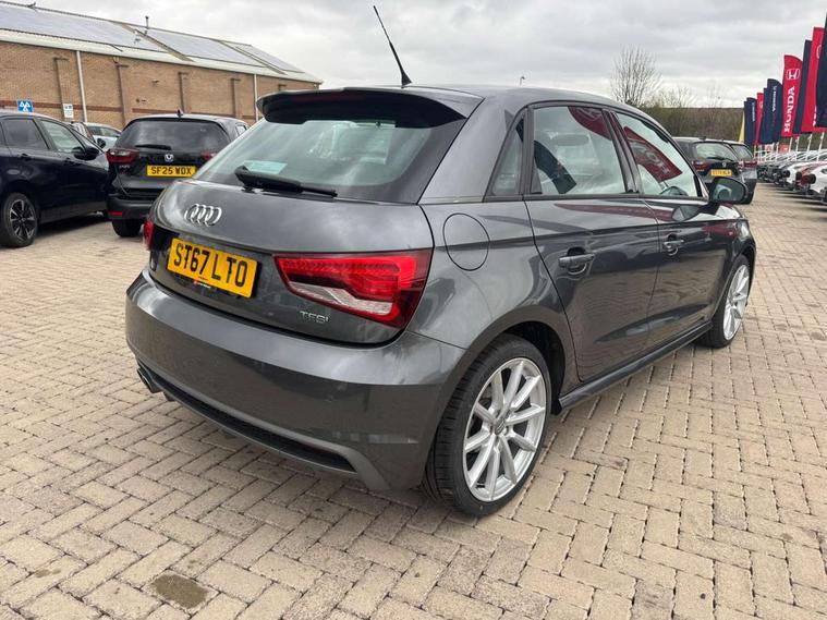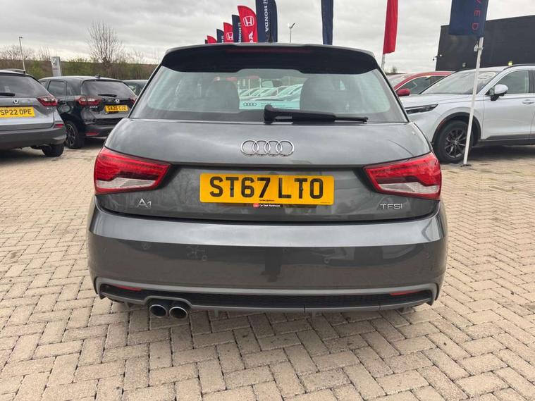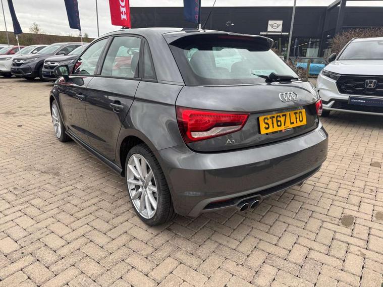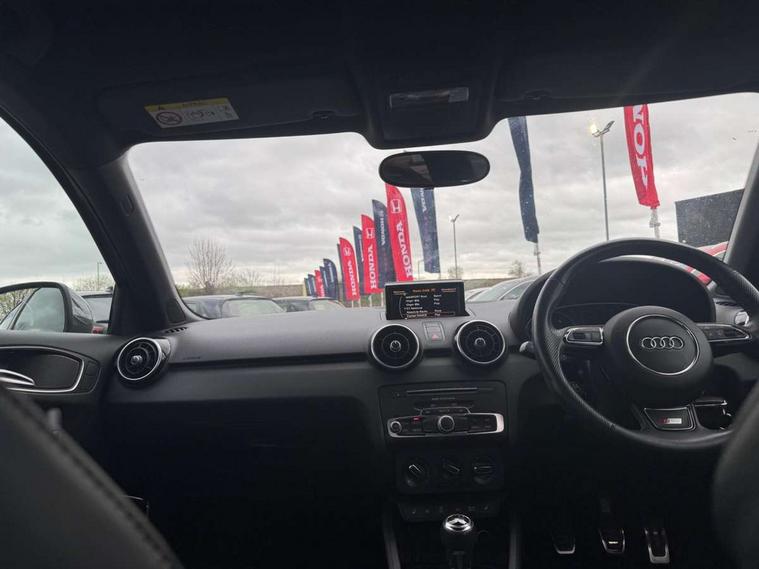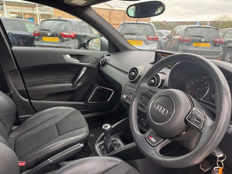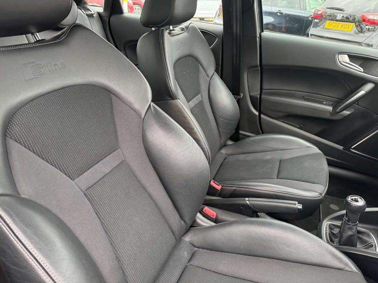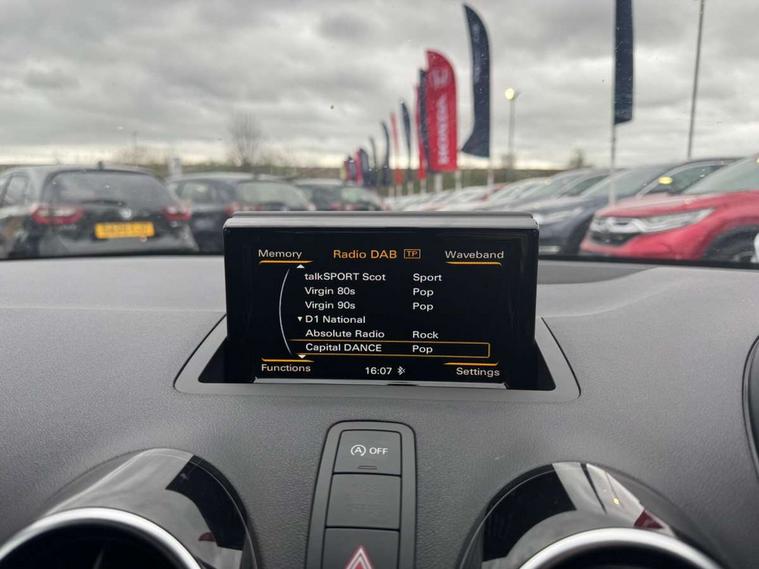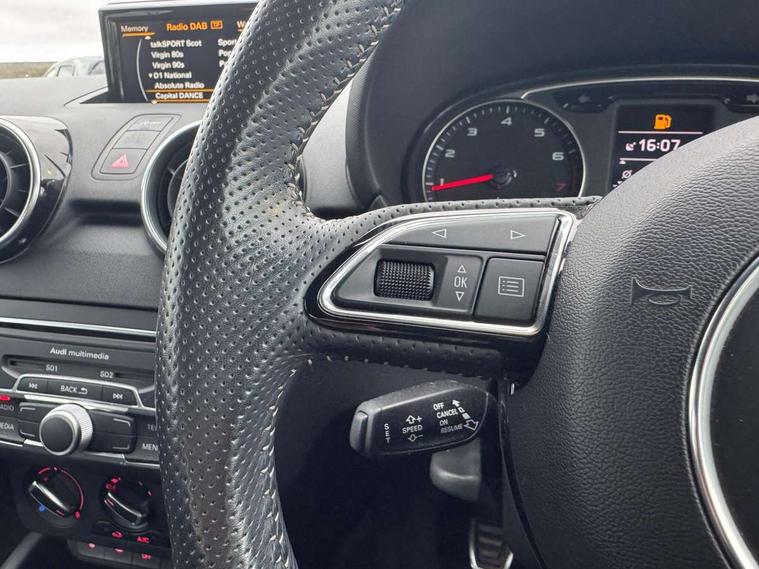 Audi drive select, Cruise control, Driver's information system, Electro-mechanical PAS, Low washer fluid indicator, Service interval indicator, Voice control system, Additional SD card reader, Audi music interface, Bluetooth audio streaming, DAB Digital radio, Adaptive brake lights, Body coloured bumpers, Body coloured door mirrors, Electric adjustable door mirrors, Electric front windows, Electric rear windows, Front fog lights, Heat insulating glass, Heated door mirrors, Heated rear windscreen, Rear diffuser, Rear wiper, Roof spoiler, S Line body styling, Xenon plus headlights including automatic headlights, LED daytime running lights, LED rear lights, dynamic range control and headlight washers, 12V Accessory socket in centre console, Adjustable rear head restraints, Black cloth headlining, Cupholders in centre console, Door sills trims with aluminium inlays, Front floor mats, Front head restraints, Height adjustable front seats, Illuminated glovebox, Isofix attachments on outer rear seats, Jack and tool kit, Leather handbrake, Lumbar adjustment for front seats, Rake/reach adjustable steering wheel, Split folding rear seats, Non smoking pack - A1, ABS/EBD, Brake assist function, Driver and passenger side airbags, Driver/Front Passenger airbags, EDL, ESP with ASR, First aid kit, Front and rear seatbelt reminder, Front passenger airbag deactivation, Head airbags, Height adjustable front seatbelts, Tyre pressure monitor, Warning triangle, Locking wheel bolts, Remote control central locking, Thatcham category 1 alarm + immobiliser, Tyre repair kit,