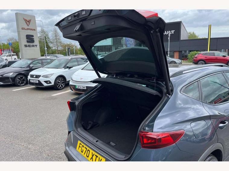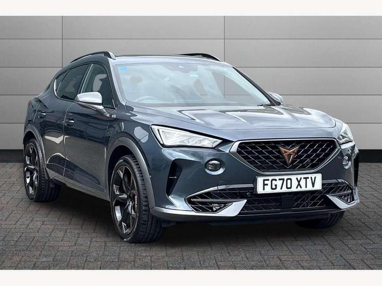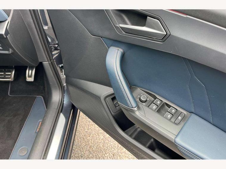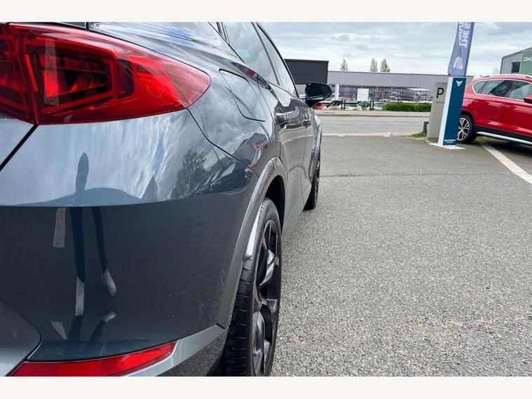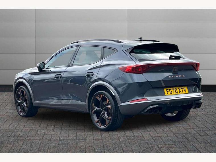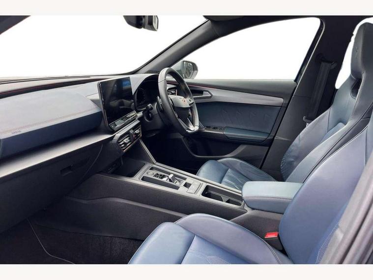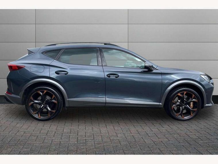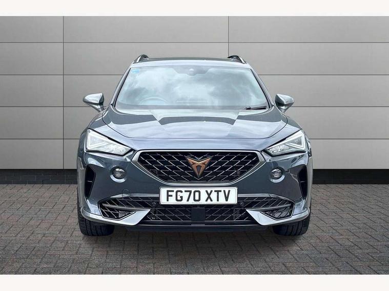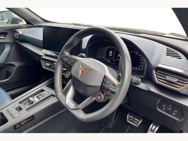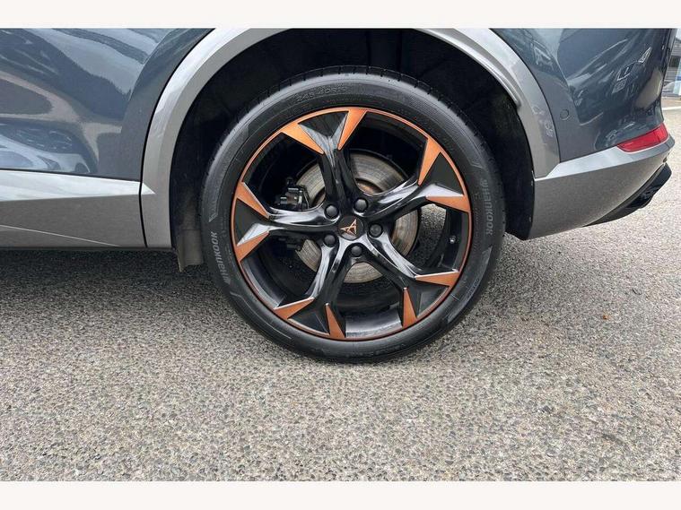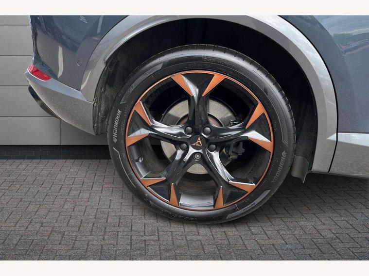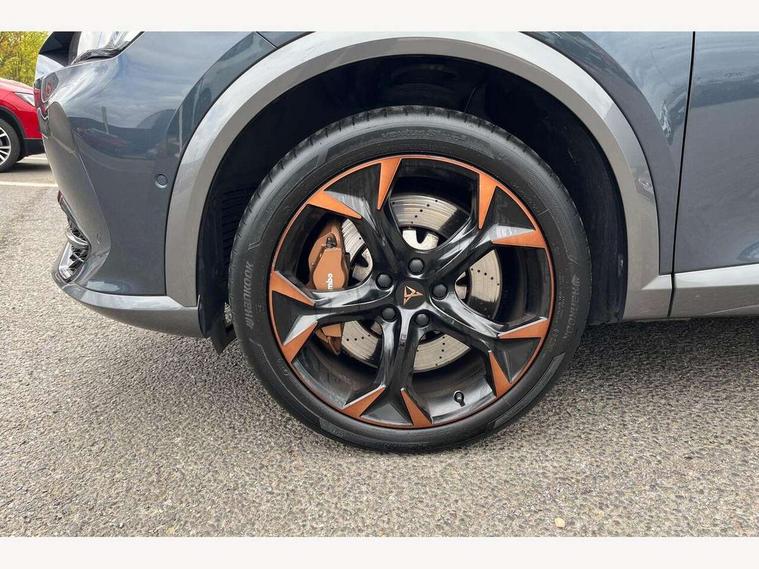 Digital cockpit and configurable dashboard, Driver alert system, Dynamic chassis control with driving profile selection (Comfort, Sport, CUPRA, Individual), Forward collision warning with automatic braking, Park assist (inc front/rear parking sensors), Predictive adaptive cruise control with speed limiter, Rear view camera, RPM, trip computer, outside temp gauge, instrument light brightness, low fuel warning light, lights on reminder, gearshift indicator, Service interval indicator, Speed sensitive power steering, Start/stop system with regenerative braking, Virtual pedal and electric tailgate, Wireless apple carplay, Wireless phone charger, Electronic locking differential and dynamic traction support, Sports suspension with front shock absoption, 2 front and 2 rear USB type C sockets, Auxiliary input socket, DAB radio, Auto dimming rear view mirror, Body colour door handles, Body coloured bumpers, Dark grey wing mirror, Daytime running light with automatic headlight control and coming home feature, Dynamic headlight range control, Electric front/rear windows, Electrically adjustable, heated and folding door mirrors, Front fog lamps with cornering function, Gloss black roof rails and window surrounds, LED Headlights, LED Taillights with dynamic indicator, Metallic paint, Panoramic sunroof, Rain sensing wipers, Rear diffuser with twin exhaust pipe on each side, Rear wash/wipe, Sports bumpers, Tinted rear windows, Welcome lights, 12v power supply in centre console, 12v socket in loadspace, 2 front and 2 rear reading lights, 230V socket, 60/40 split rear bench seat with armrest and mechanical seat release, Black headlining, Cupra sports pedals, Dust/pollen filter, Front and rear head restraints, Front centre armrest, Heated steering wheel, Height/reach adjust steering wheel, Illuminated interior front door sills, Illuminated sunvisor with mirror, Interior ambient lighting, Isofix, Leather multi-function sports steering wheel with start stop, CUPRA mode button and gear shift paddles, Luggage tie-down hooks, Three zone climate control, Three zone climate control with control panel in rear, Variable luggage/load compartment floor, Wraparound lighting, Genuine Nappa leather Pack - Cupra, Navigation system pack - Formentor, Safety and driving pack (XL) - Formentor, 3 point seatbelts on all rear seats, ABS, Brake control system - ESC and brake booster, Brembo brakes, Child proof door locks, Driver and front passenger airbags with front passenger airbag de-activation, Electronic parking brake, Front side curtain airbags, Hill hold control, Seat belt reminder for front and rear seats, Tyre pressure monitoring system, Anti theft alarm system, Keyless entry and start system (KESSY), Locking wheel bolts, Copper and aluminium interior detailing, 19" Sport copper/black alloy wheels with 94W tyres, Breakdown kit, Emergency tyre repair kit,