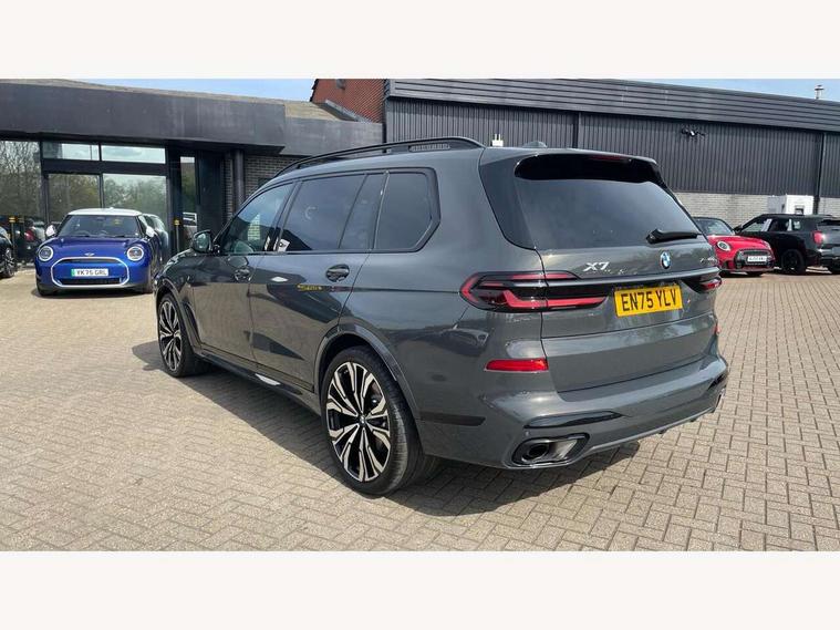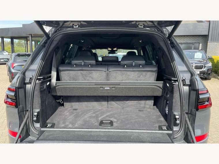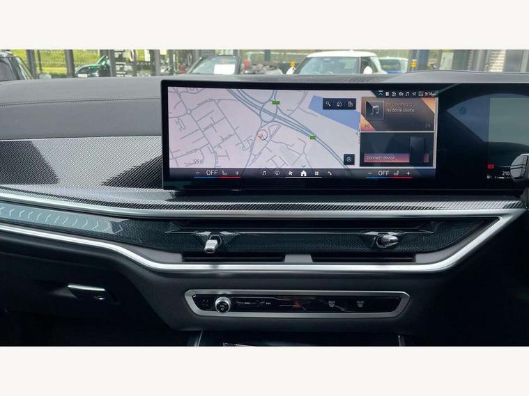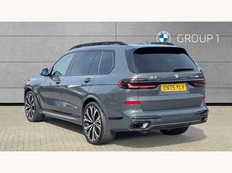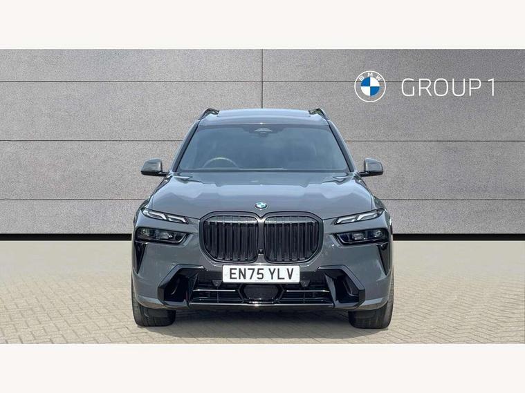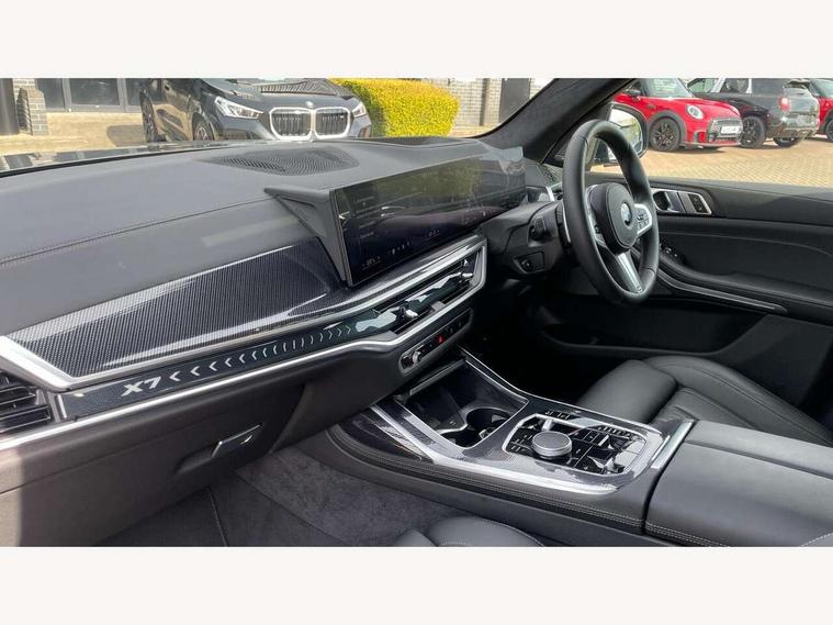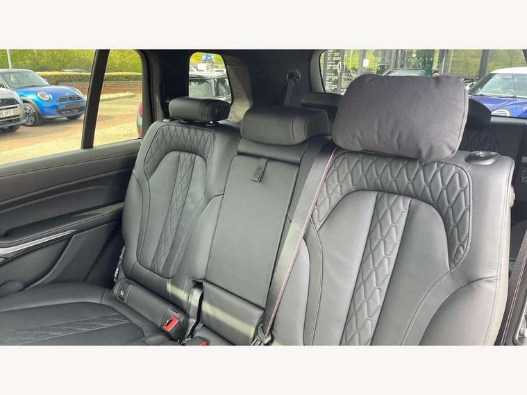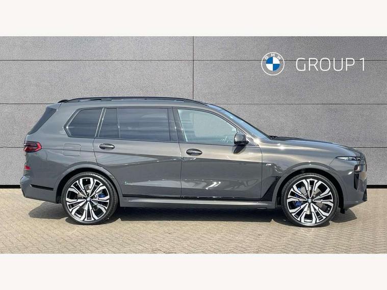 Attentiveness assist, Automatic start/stop function, Automatic tailgate operation, BMW ConnectedDrive online services, BMW Drive recorder, BMW gesture control, BMW Teleservices, Brake pad wear indicator in front and rear, Condition based service, Integrated owner's handbook, Live Cockpit Professional with head up display including 12.3" instrument cluster and 14.9" central display, Parking assistant pro including reversing assistant, PDC, lateral parking aid, reversing assist camera, parking drive off monitoring, 48V Mild hybrid technology, 8 speed automatic with steptronic transmission including automatic hold function and gearshift paddles on the steering wheel, Drive experience switch with comfort mode + ECO PRO + sport mode, Front and rear air suspension, Permanent all wheel drive, 2 rear USB-C ports, 2x Front USB (1x USB-C, 1x USB-A), DAB radio, Personal eSim, Acoustic glazing, Adaptive air flap control bars in high gloss black, Air breather and door claddings in high gloss chrome, Body coloured wheel arches, Dynamic brake lights with LED technology, Electrically adjustable and heated aspheric folding side mirrors with auto dimming, electric fold in function, automatic parking function, Exterior and central air inlets in front bumper painted pearl chrome, Follow me home headlight function, Frameless interior mirror, Front and rear electric windows, Heated windscreen washer nozzles, High beam assist, High gloss black shadow line roof rails, High gloss black shadowline trim in side/window frame, window recess cover, window guide, B and C pillar, mirror triangle, mirror base, mirror frame, Integrated turn indicators (door), LED daytime running lights, LED rear lights, LED third brake light in rear spoiler, Rain sensor with automatic headlight activation and windscreen wiper control, Rear side wing doors, Side window graphic bars + B and C pillar trim panels in black high gloss, Sump guard front and rear painted in silver, Trailer stabilisation logic, 12V - Power sockets with 2x centre console and 1x luggage compartment, 2 seat bench in 3rd row, 2x cupholders in front, rear centre armrest and two in third row seats, 3 seat bench in 2nd row, 3 spoke M leather multifunction steering wheel, 40:20:40 split folding rear seat backrests, Ambient lighting strip in the instrument panel with illuminated, Armrest in front centre console, Compartment in front of cupholder, Driver and front passenger sunvisors with illuminated vanity mirrors and ticket holder, Electrical steering column with adjustable height and length with activation and control on the steering column, Entry sills with illuminated M inscription, Fold down flush into floor of luggage compartment 50:50, Front and rear colour co-ordinated with all standard carpet colours, Front and rear door pockets, Front and rear side armrests integrated into door trim, Front seat back pockets, Grab handles, Height adjustable front headrests, Height adjustable rear headrests, Lockable glove compartment, Nano filter, Single front passenger seat, Soft close doors, Storage tray and compartment with lid in centre console, Wireless charging tray, Additional storage compartment pack - X7, Ambient light interior pack - X7, Connected Package Professional - X7, Interior lighting pack - X7, Luggage compartment pack - X7, M aerodynamics pack - X7, M Sport pack - X7, 3 point seatbelts on all seats, front pyrotechnic belt tensioners, stopper and belt force limiters, front and outer rear seats, Acoustic protection for pedestrians, Active protection, Airbag - Front driver and passenger, side airbags and Head airbags, Anti lock braking system (ABS) with cornering brake control, BMW emergency call, Child seat ISOFIX attachment rear outer seats in 2nd row and both seats in 3rd row includes top tether, Comfort access system with digital key plus, Comfort cushion seats for outer seats in 2nd row, Crash sensor inclu activation of airbags, interior light, safety battery terminal clamp, hazard warn flasher, unlock doors, deactivation of fuel pump, DSC - Dynamic Stability Control, Dynamic Traction Control - DTC, Electromechanical parking brake with automatic drive away release and auto hold function, Front and rear brake discs with interior ventilation, Hill descent control, Integrated braking system, Manual child lock in rear doors, PC iBrake PostCrash approach control warning with light braking function, Tyre pressure monitoring system, Tyre pressure sensors, Variable torque distribution, Warning triangle and first aid kit, Alarm, Central locking including 2 vehicle keys with integrated emergency key, Engine immobiliser, Locking wheel bolts, Galvanic embellisher for controls,