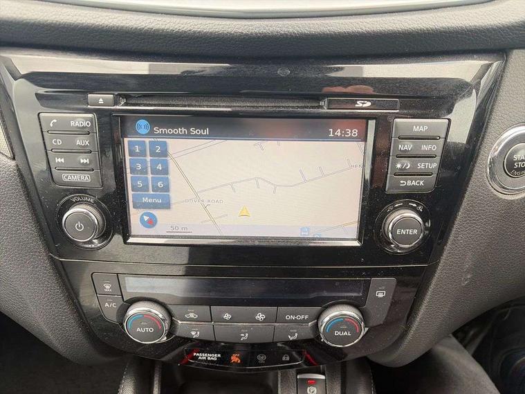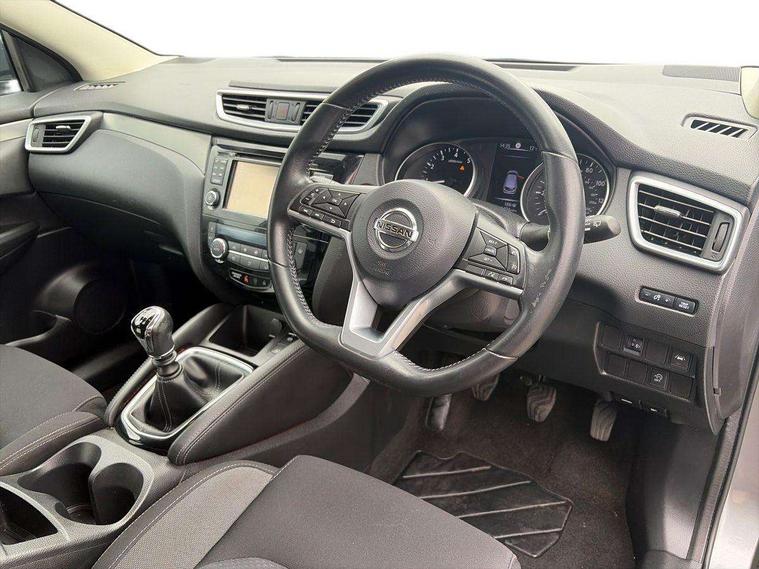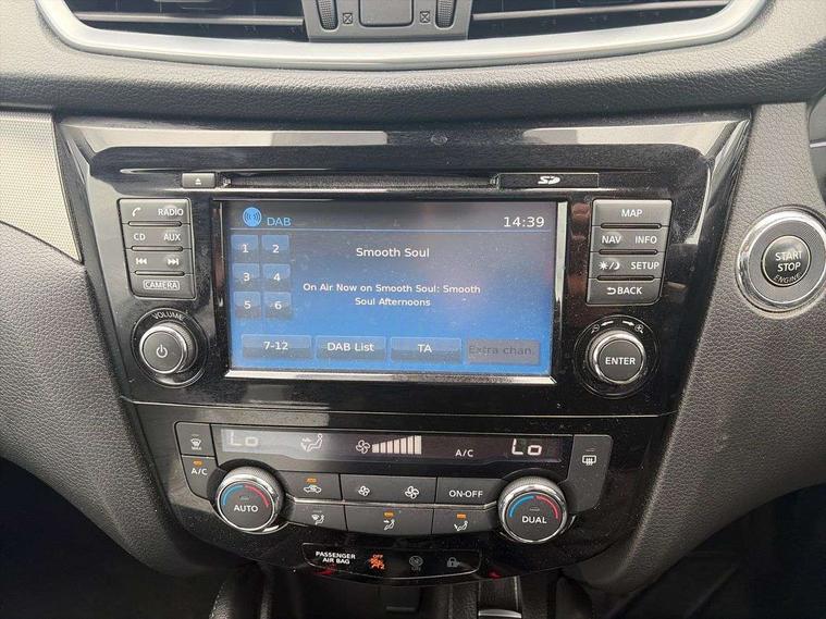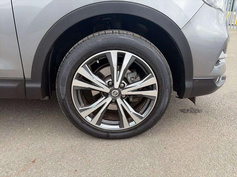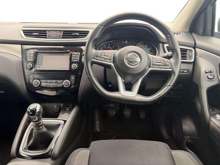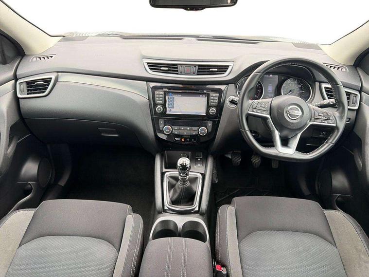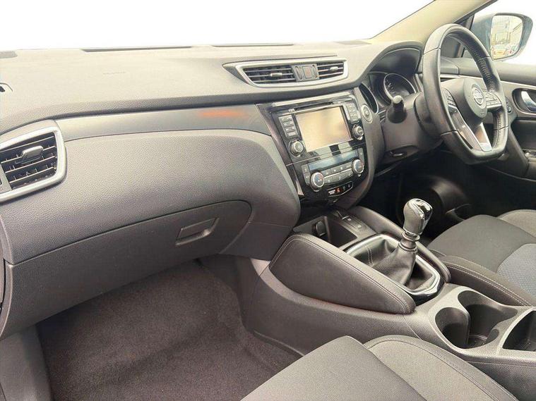 5" TFT driver information centre, Around View Monitor, Bluetooth phone integration system, Cruise control, Electric speed sensitive power steering, Front and rear parking sensors, Lane departure warning system, Nissan connect sat nav system, Outside temperature display, Push button starter, Rear view camera, Service interval indicator, Speed limiter, Traffic sign recognition, Trip computer, 'Shark fin' mobile antenna, 6 speakers, DAB Digital radio, Radio/CD, Smartphone apps, Steering wheel mounted audio controls, USB/aux input socket, Automatic headlamp activation, Body colour bumpers, Body colour door handles, Body colour door mirrors, Chrome window surround, Electric folding and heated door mirrors, Front fog lights, High beam assist, Interior mirror with auto anti dazzle, LED indicators in door mirrors, Matt silver roof rails, One touch electric front/rear windows, Privacy glass, Rain sensor windscreen wipers, Rear roof spoiler, Rear wiper, 2 X front 12v power sockets, 60/40 split folding rear seat, Ambient interior lighting, Centre console with armrest, Chrome interior door handles, Cloth upholstery, Configurable luggage board system, Driver + front passenger lumbar support, Dual zone climate control, Front and rear door pockets with bottle holders, Front headrests, Front seat belt pre-tensioners with load limiters, Height adjustable driver's seat, Height adjustable passenger seat, Illuminated electric window switch, Isofix child seat preparation, Leather gearknob, Leather interior door handles, Leather knee rest, Leather steering wheel, Luggage compartment lighting, Parcel shelf, Pollen filter, Rake/reach adjustable steering wheel, Rear armrest with 2 cupholders, Rear headrests, ABS, brake assist and EBD, Child locks on rear doors, Curtain airbags, Driver/front passenger airbag, Electronic parking brake, ESP + traction control, Forward emergency braking, Front passenger airbag deactivation, Height adjustable front seatbelts, Hill start assist, Seatbelt warning, Side airbags, Three 3 point rear seatbelts, Tyre pressure monitoring system, Alarm, Immobiliser, Intelligent Key, Remote central locking, Piano black interior trim, 18" Bi-colour alloy wheels, Tyre puncture repair kit,