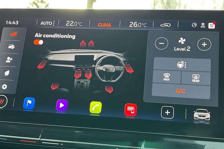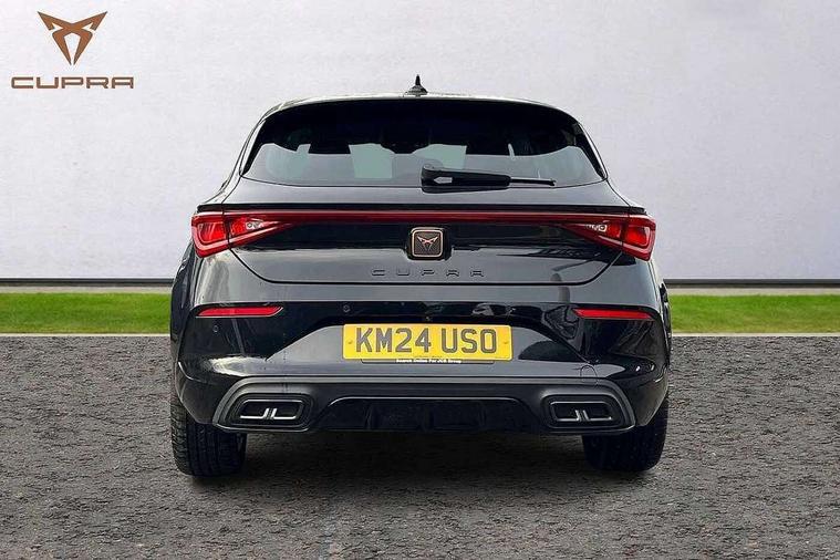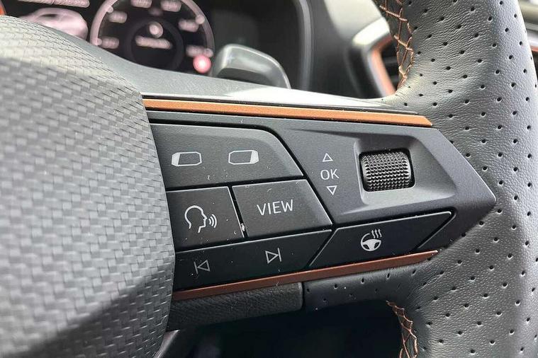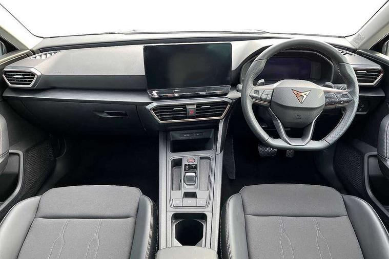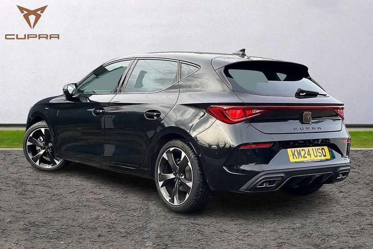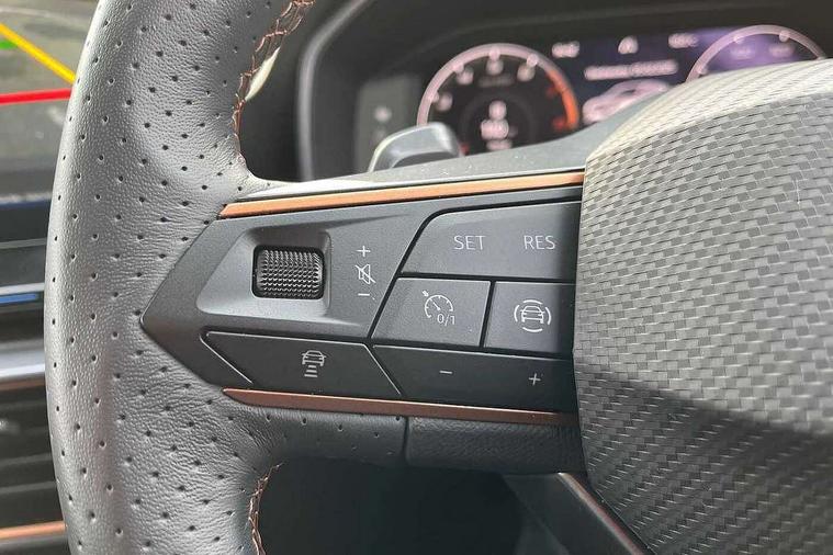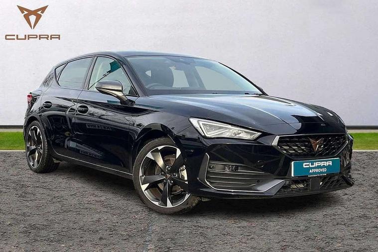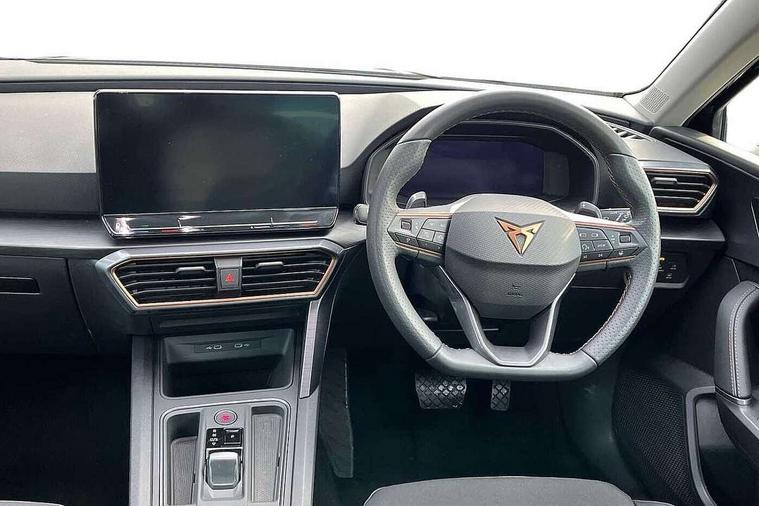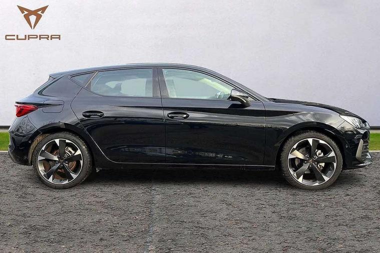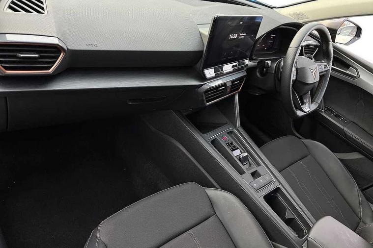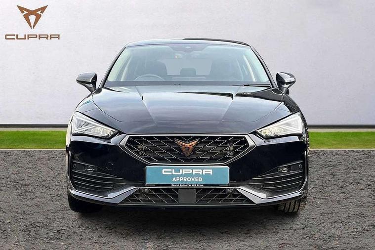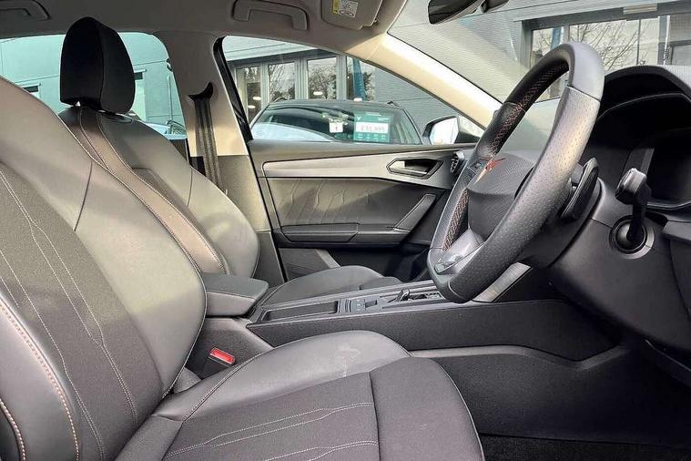 CUPRA drive profile selection with (Comfort/Sport/Individual), throttle response and gearshift mode, Digital cockpit, E-call, Electro mechanical speed sensitive power steering, Front assist with forward collision warning braking reaction to vehicles, pedestrians and cyclists, Full link smartphone integration with Mirror Link, wireless Apple CarPlay and wired Google Android Auto, Lane assist, Lockable tailgate, Park assist (inc front/rear parking sensors), Rear view camera, RPM, trip computer, outside temp gauge, instrument light brightness, low fuel warning light, lights on reminder, gearshift indicator, Service interval indicator, Start/stop system with regenerative braking, Wireless phone charger, Sports suspension, Auxiliary input socket, Auto dimming rear view mirror, Body colour door handles, Body coloured bumpers, Cupra sports bumpers, Dark tinted rear windows, Electric front/rear windows, Electrically adjustable, heated and folding door mirrors, LED front fog lamps with cornering function, LED headlights with dynamic turn signals, tail lights, rear fog lights with rear coast to coast lighting, Rain sensing wipers, Rear diffuser with twin exhaust pipe on each side, Rear side wing doors, Rear wash/wipe, Separate daytime running light with automatic headlight control and coming home feature, Third brake light, 12v power supply in centre console, 3 seat bench in 2nd row, 5 headrests, 60/40 split rear bench seat with armrest, Ambient lighting with glovebox, footwell and single monocolour, CUPRA Leather flat bottomed, heated, perforated steering and gearshift paddles, Driver/passenger manual seat height adjustment, Folding boot cover, Four x USB Type C ports (2 in front and 2 in rear), Front and rear reading lights X 4, Front centre armrest, Front seats manual lumbar adjustment, Grey headlining, Height/reach adjust steering wheel, Illuminated interior front door sills, ISOFIX points in outer rear seats with top tether anchorage points, Jack and tool kit, PVC/Cloth upholstery with copper stitching, Single front passenger seat, Sports seats, Storage pockets on rear of front seats, Sunvisors with illuminated mirror, Three zone climate control, Media system plus with navigation pack - Leon Cupra, Safety and driving pack (M) - Cupra leon, 3 point seatbelts on all rear seats, ABS, Brake control system - ESC and brake booster, Child proof door locks, Cupra black brake calipers, Driver and front passenger airbags with front passenger airbag de-activation, front side and curtain airbags, Electronic parking brake, Extended safety system - seat belt tensioner, window closure and hazard lights, Hill hold control, Rear disc brakes, Seat belt reminder for front and rear seats, Tiredness recognition system, Tyre pressure monitoring system, Anti theft alarm system with interior monitoring in cab, backup horn and towing protection, KESSY Advanced - Keyless start, keyless entry, Locking wheel bolts, Chrome and copper interior detailing, 18" Machined sport black and silver alloy wheels with 92Y tyres,