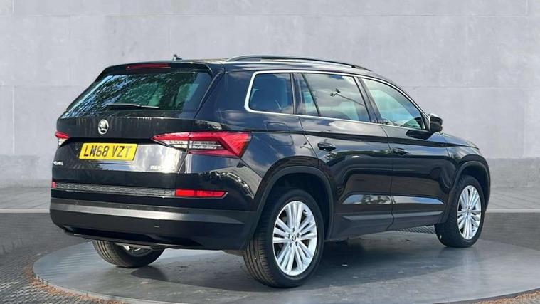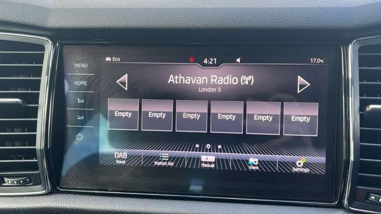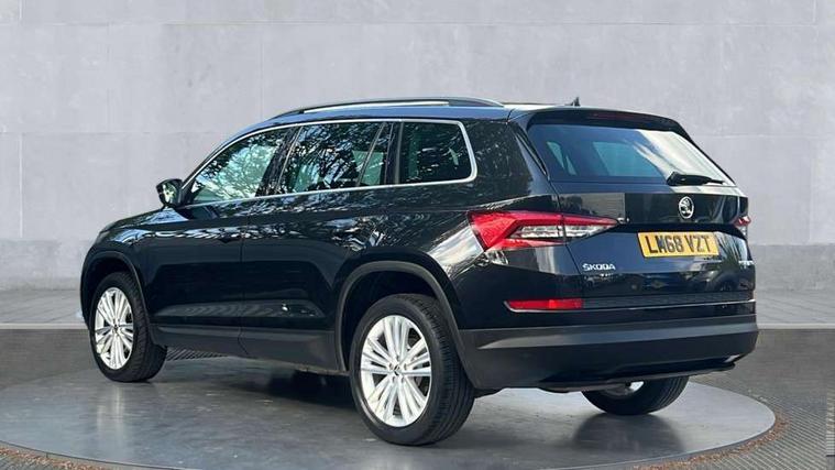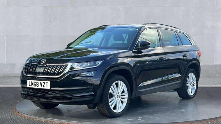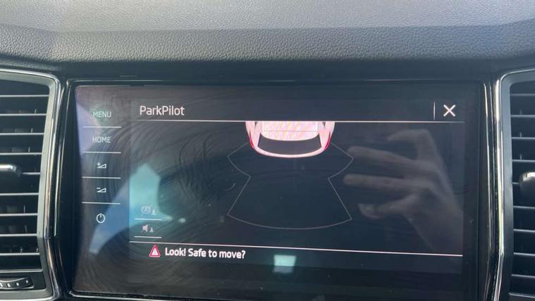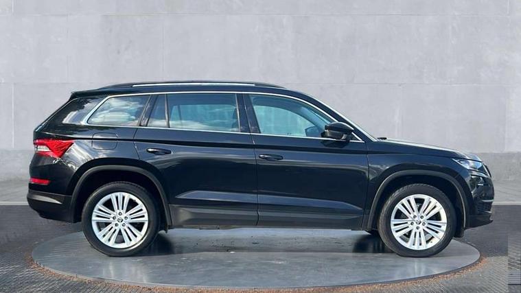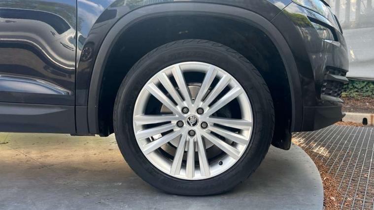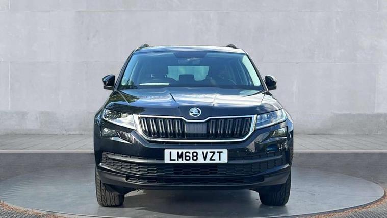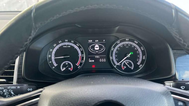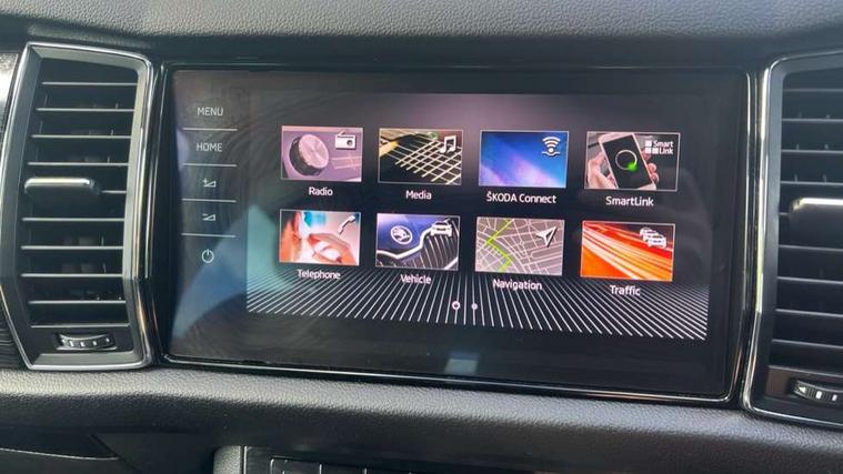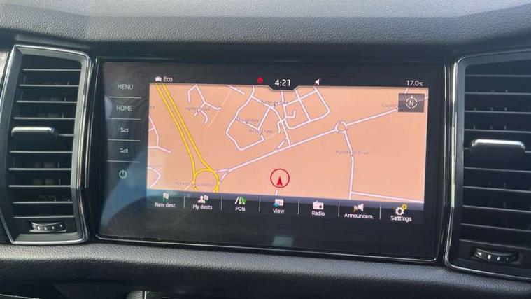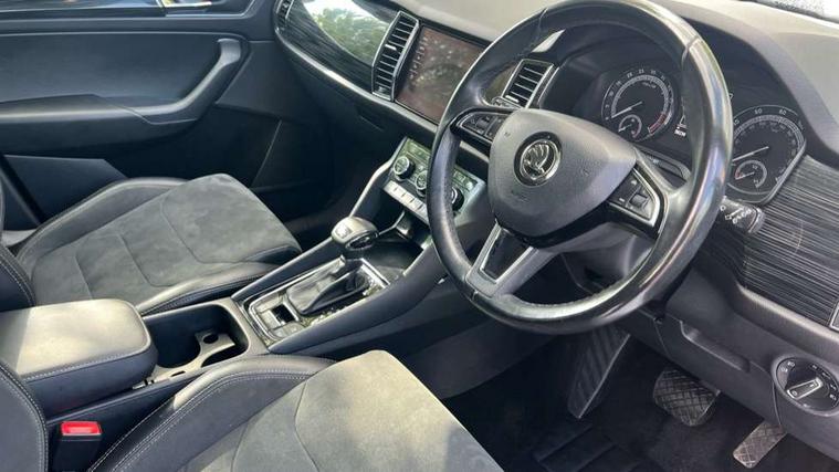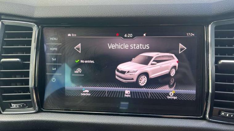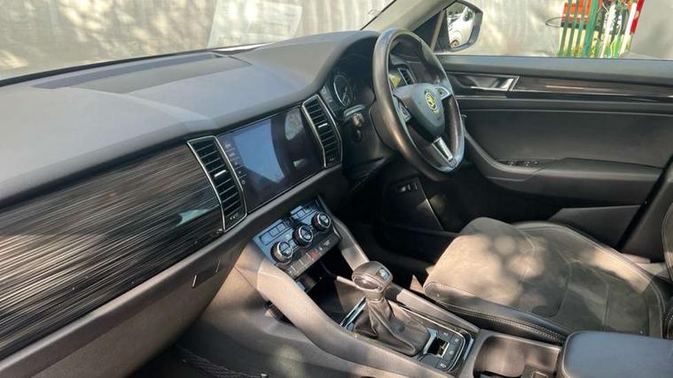 Piano black dash inserts, Chrome pack - Kodiaq, Alarm with interior monitoring and tilt sensor with safe function, Immobiliser, Keyless entry and keyless start, Keyless start/stop, Remote central locking, Bolero Radio, DAB Digital radio, DVD System, USB and SD card connectivity, Auto door release and activation of warning lights, Driver and passenger airbags, Electronic parking brake with hill hold control, Emergency rear braking signal, ESC (incl. ABS+MSR+ASR+EDS+HBA+DSR+RBS+MKB), Front and rear three point safety belt on all seats, Front assist includes AEB city/urban, Front side airbags, Fuel cut off safety device, Head and knee airbags, Passenger airbag deactivate switch, Rear disc brakes, Safety vest holder in door, Seat belt reminder for all seats, Tailgate unlocking from outside, Two tone horn, Tyre pressure monitor, Warning lights in front doors, Aero front windscreen wipers with intermittent function, Aero rear window wiper, Auto dimming rear view mirror, Automatic activation of hazard warning lights, Black wheel arch surrounds, Body colour bumpers, Body colour door mirrors and handles, Electric adjustable heated folding door mirrors with boarding spots, Electric front and rear windows, Front and Rear door steps, Full LED Headlights with adaptive front light system and LED daytime running lights, Headlight washers, Heated rear window, Invisible tailpipe, LED third brake light in rear spoiler, Light assistant (coming home/tunnel light), Radiator grille frame in black with chrome strip, Rain and light sensors, Rear spoiler, Safety reflectors on front and rear doors, Sunset privacy glass, Tinted windows, 12V socket in boot, 2 rails with 2 hooks including 4 hooks for net programme, 4 foldable roof handles with rear coat hooks, 4 lashing points on luggage floor, 60:40 foldable rear seat with sliding adjustment and backrest angle adjustment, Bottle holders in door panel in the 1.5 litre front and 1 litre rear, Cargo storage compartments, Centre console with open storage box, cup holder and 12V socket, Chrome headlight control button, Chrome interior door handles, Coat hooks on B pillar, Covered storage compartment on driver side, Drawers under driver and front passenger seats, Front and rear height adjustable headrests, Front centre armrest with storage compartment, Front/rear courtesy lights, Gear shift lever with chrome frame and black gloss insert, Height adjustable front seats, Illuminated and cooled glovebox, Illuminated luggage compartment, Isofix system on outer rear seats, Manually adjustable steering column, Net programme in boot (1x horizontal Net, 2x vertical Nets), Overhead glasses storage compartment, Passenger side net compartment on centre console, Pollen filter, Rear centre armrest with cupholders, Removable lamp in luggage compartment, Roll up luggage compartment cover with intermediate position, Small Bags on the inner sides of the front backrests, Small pockets on the inner side of the front backrests, Storage compartment in lower middle Instrument panel, illuminated with closing, Sunvisors with illuminated vanity mirrors, Ticket holder on A Pillar, Umbrella in door panel, Bluetooth system, Columbus satellite navigation with 9.2" touch screen and integrated Wi-Fi, Digital voice enhancement, Drive mode selector, ECO Stop/start function, Exterior temperature indicator, SmartLink plus, Speed limiter,