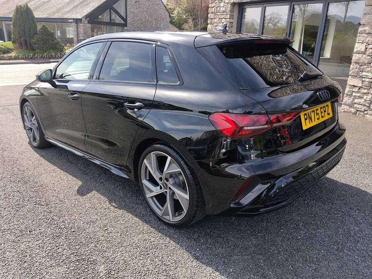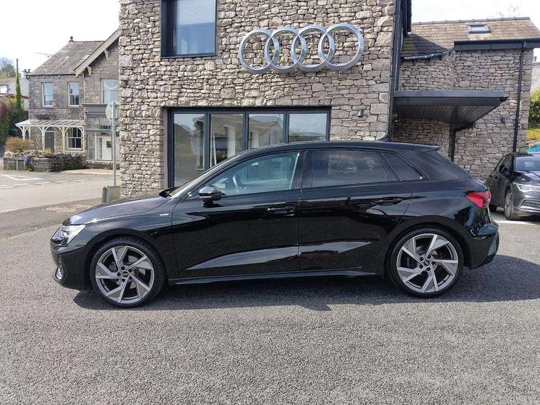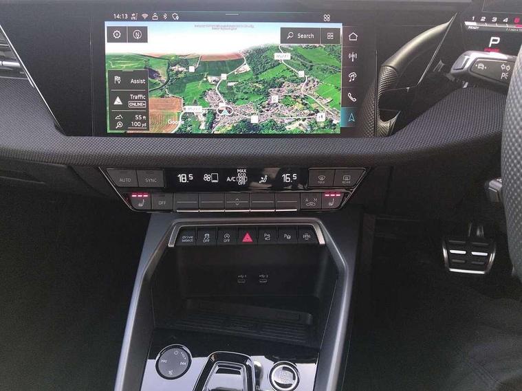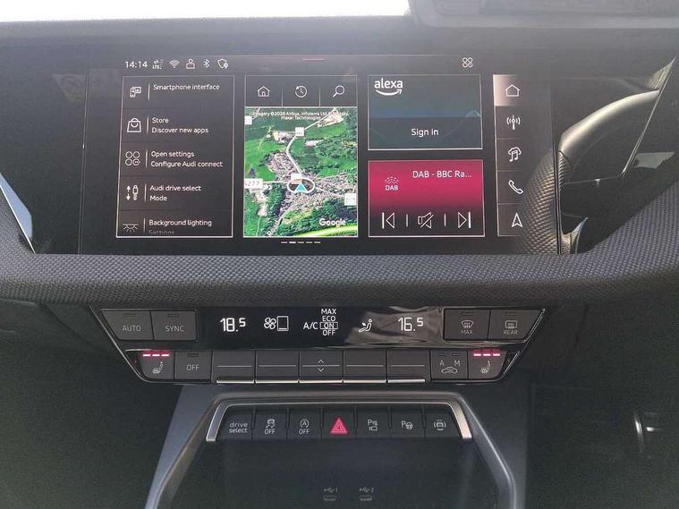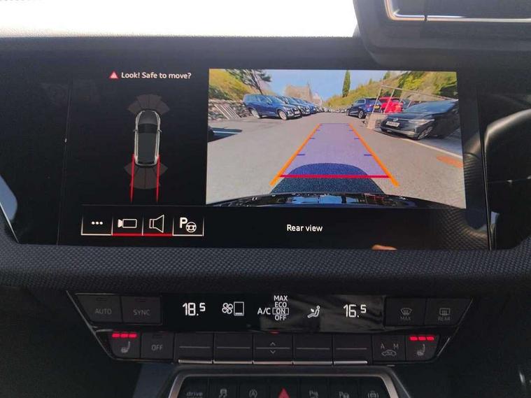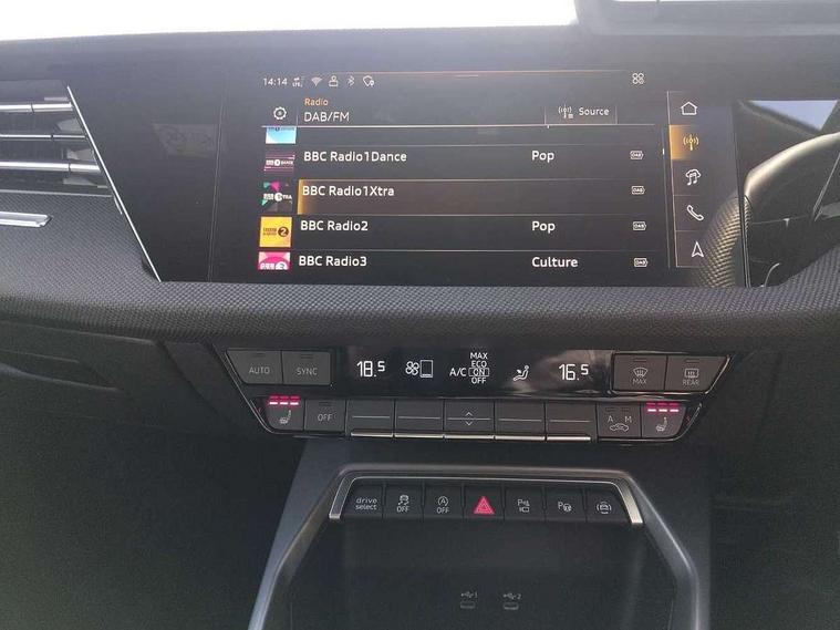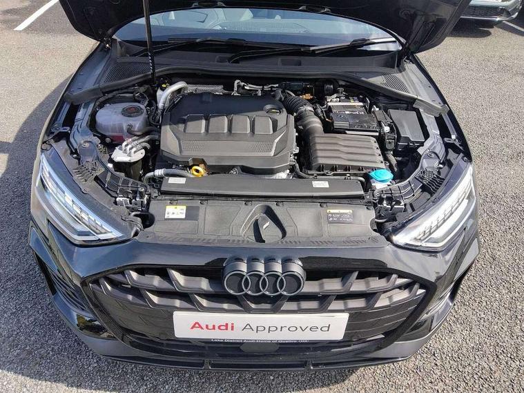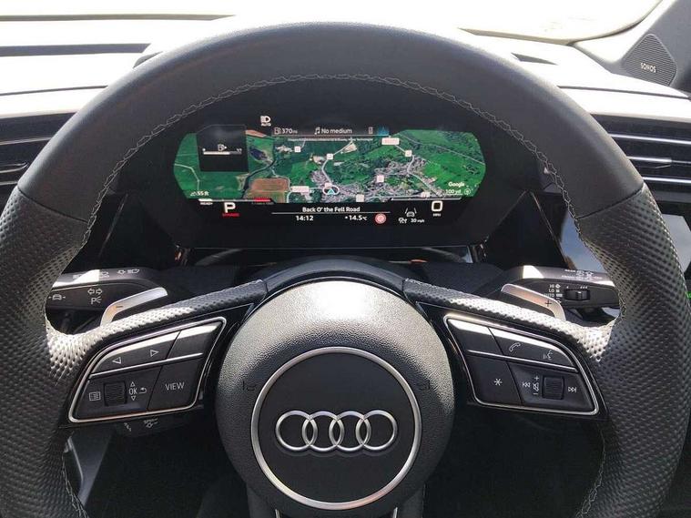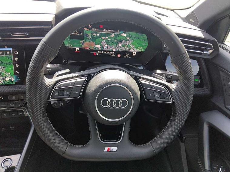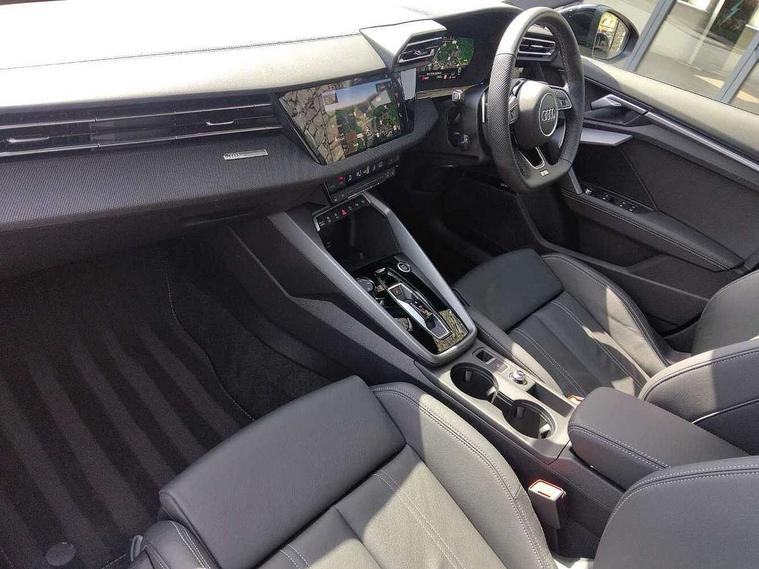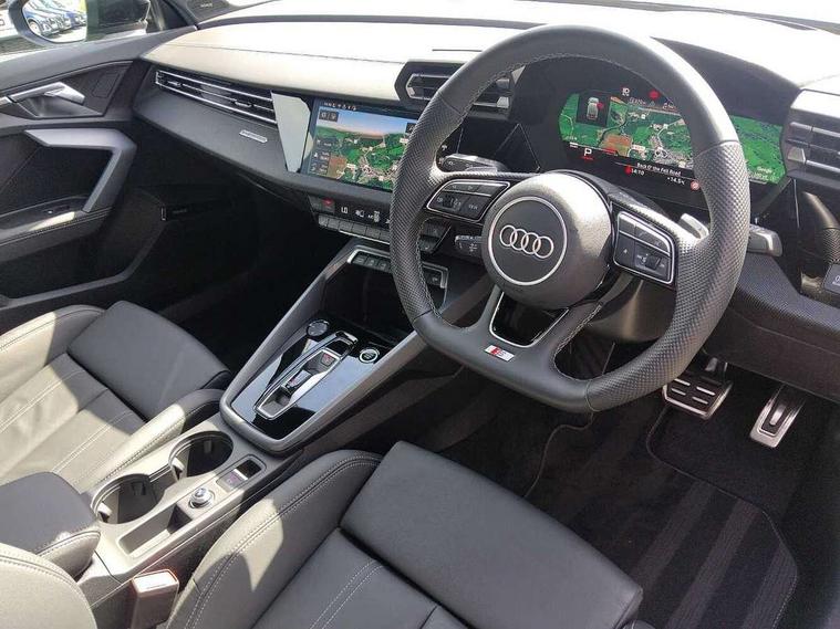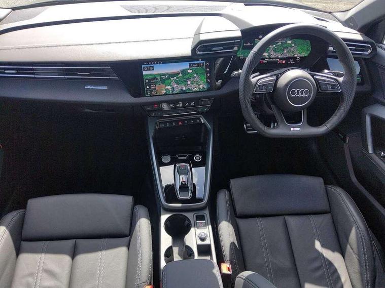 Adaptive cruise control (ACC), Adjustable speed limiter, Audi drive select (Auto, Comfort, Dynamic, Efficiency and Individual), Audi virtual cockpit plus - 12.3" full HD resolution dynamic digital instrument cluster, Automatic start/stop system with recuperation, Bluetooth interface, Camera based traffic sign recognition, Collision avoidance assistant, Driver attention and fatigue detection, e-Call (emergency call), Electromechanical power speed sensitive steering, Emergency assist, Intersection assist, Lane departure warning system, MMI Navigation Plus with high resolution 10.1" colour touch screen display, Park Assist with parking system Plus, Reversing camera, Service indicator, Smartphone interface with app store includes wireless Apple carplay, Android auto and Amazon alexa integration, Trip computer, Voice control system with natural language interaction, Diesel particulate filter, Sports suspension, Audi Phonebox light with wireless charging, Audi sound system - 10 loudspeakers including centre loudspeaker and subwoofer, DAB Digital radio, USB ports with charging function in the rear, Acoustic glass windscreen, All weather light, Anthracite grey Audi rings (front and rear), Audi beam uses LEDs to project the Audi logo onto the ground as you exit your A3, Auto dimming frameless rear view mirror, Automatic dynamic range control, Black accents front and rear bumpers, Black accents in the area of the Audi single frame grille, Black accents window trims strips, Dipped beam, main beam, position light and turning light, Electrically adjustable/heated/folding/auto dimming door mirrors with integrated LED indications + kerb view function for passenger side, Exterior model badging, Front and rear side air inlets in grained matt black with dark liquid chrome frame, Front electric windows, Front radiator grill in high gloss dark chrome, Heat insulating glass windscreen, Illuminated door sills with aluminium inserts at the front with S logo, Intersection light, LED 3rd brake light, LED brake lights, LED daytime running x3, LED headlights with LED rear lights and dynamic rear indicators, LED rear number plate lights, LED reverse light, LED tail lights, Light and rain sensors, Manoeuvring light, Motorway light, Privacy glass - dark tinted rear window, rear door and side windows, Rear diffuser and grill in grained matt black with inlay in dark liquid chrome, Rear electric windows, Rear side wing doors, Rear wiper, S roof spoiler, Side sill trim in dark liquid chrome, Static cornering light, 12V socket and storage compartment in front centre console, 3 seat bench in 2nd row, 3 spoke flat bottomed leather multifunction sport steering wheel with gear shift paddles, 3-zone deluxe automatic air conditioning, 4 way electrically adjustable lumbar support for driver and front passenger, 40/20/40 split folding rear seat bench, Black cloth headlining, Black front and rear floor mats, Front and rear centre armrest in artificial leather with contrasting stitching on armrests and instrument panel, Front and rear headrests, Heated front seats, Height and reach adjustable steering wheel, i-Size child seat mounting on the front passenger side and outer rear seats, i-Size and top tether on the outer rear seats, Manual boot compartment lid, Manually adjustable front seats, Rear centre armrest with cupholder, S badging on the steering wheel, Seat side bolsters, Single front passenger seat, Stainless steel pedals and front footrest in black, Twin leather upholstery with front sports seats S embossed logo, Aluminium interior elements pack - A3, 3x3 point rear seat belts, Driver and front passenger airbag with passenger airbag deactivation, Electronic Stabilisation Control (ESC) including ABS, ASR and EDL, First aid kit with warning triangle and 2 safety vests, Front side airbags with head airbags and interaction airbag, Hill hold assist, Pre-sense front with pedestrian and cyclist detection, Seatbelt monitoring, Tyre pressure loss indicator, Anti theft alarm, Anti-theft wheel bolts, Electronically operated child locks, Immobiliser, Black dashboard,