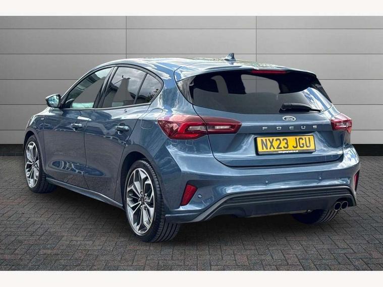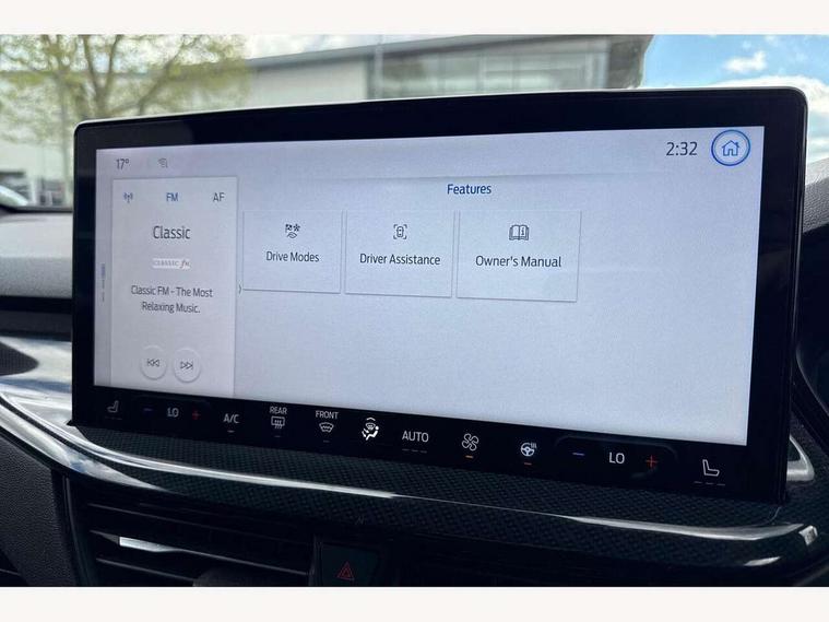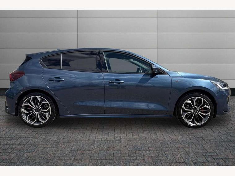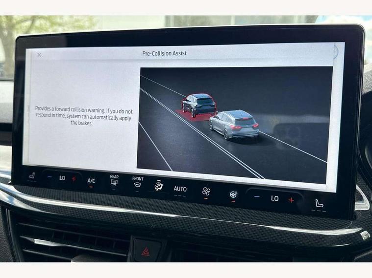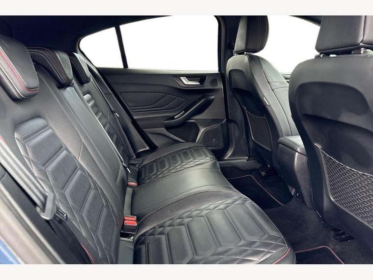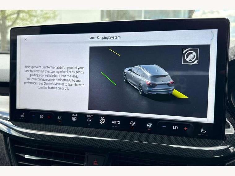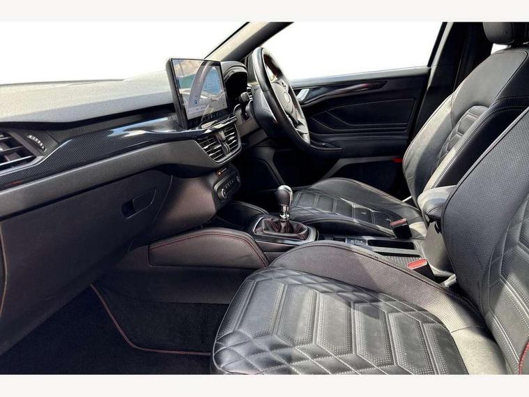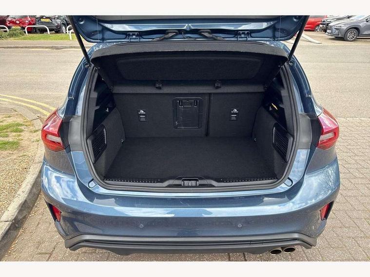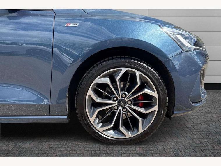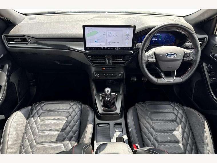 12.3" Digital instrument cluster, Bluetooth system, Digital clock, Easy fuel capless refuelling system, Eco mode, Ford SYNC4 Nav with 13.2'' touchscreen, DAB, Emergency Assistance, Apple Carplay & Android Auto, B&O Premium Audio with 10 speakers, FordPass Connect, Lane keeping system - lane keeping alert and lane keeping aid, PAS, Rev counter, Selectable drive mode, Service interval indicator, Trip computer, Wireless charging pad, Sports tuned suspension, 2 USB ports, Auto headlamps (on/off), Body coloured door handles, Electrically operated front and rear windows with one touch opening and closing, Electrically operated heated power fold door mirrors with puddle lamp with side indicators, Front variable intermittent wipers with electric wash, Heated rear window, LED daytime running lamp, LED rear lamps, LED third brake light, Polished twin tailpipe, Privacy glass, Quickclear heated windscreen, Rain sensor, Rear side wing doors, Tailgate wash/wipe, Unique ST-Line grille, full bodystyling kit, and large body coloured rear spoiler, 3 rear headrests, 3 seat bench in 2nd row, Dual zone electronic air temperature control, Full sensico premium upholstery, Height adjustable front headrests, Isofix child seat preparation, Load through ski hatch, Manual 4-way passenger seat adjusts, Power 4-way driver seat adjust, with power lumbar adjust, Reach + rake adjustable steering column, Single front passenger seat, Winter pack - Focus, 3x3 point rear seatbelts, ABS+Electronic Brake force Distribution, Auto hold function, Driver airbag, EDL traction control, Electronic parking brake, Electronic stability control, Front and rear seatbelt reminder, Front inertia reel height adjustable seatbelts with pre-tensioners, Front passenger airbag, Front side airbags, Passenger airbag deactivate switch, Post collision braking, Pre collision assist with autonomous emergency braking and pedestrian/cyclist detection, Red brake calipers, Remote/power child rear door locks, Side curtain airbags, Three rear inertia reel lap/diagonal seatbelts, Tyre pressure monitoring system, Keyless entry and keyless start, MyKey system, Remote central locking & engine immobiliser, Thatcham alarm with power door dead locks, 18" 5x3 spoke pearl grey high gloss machined finish alloy wheels with mini spare wheel,