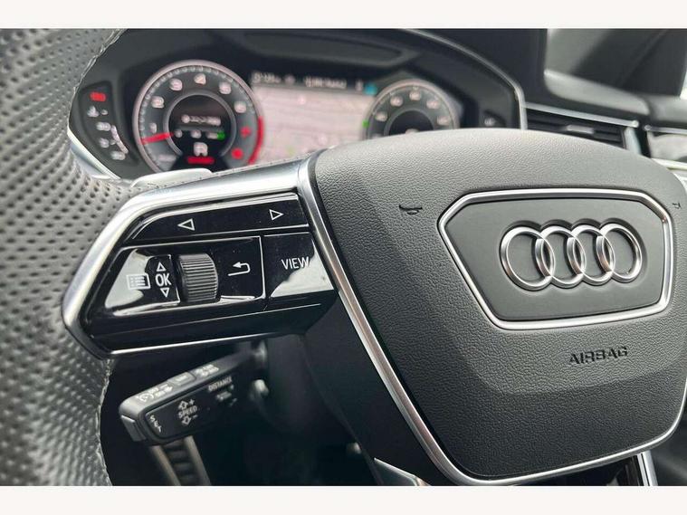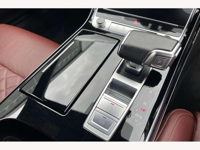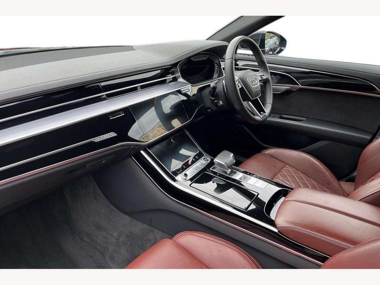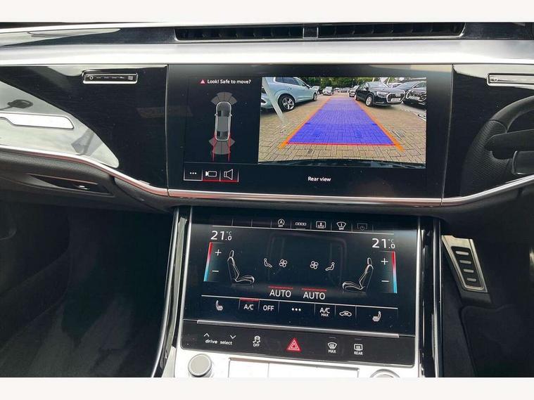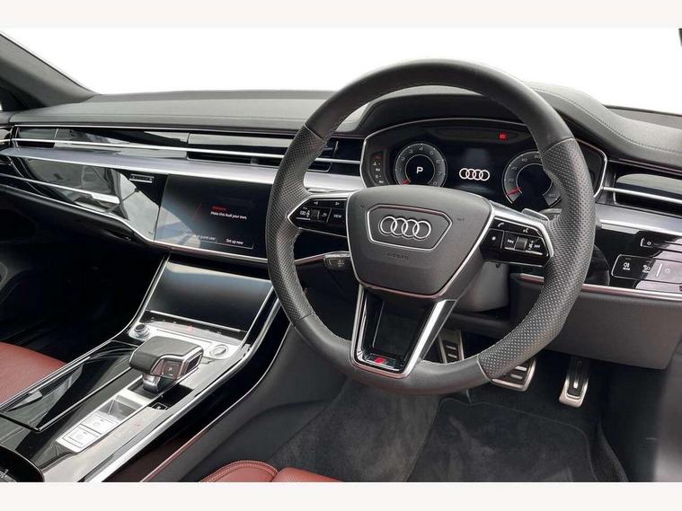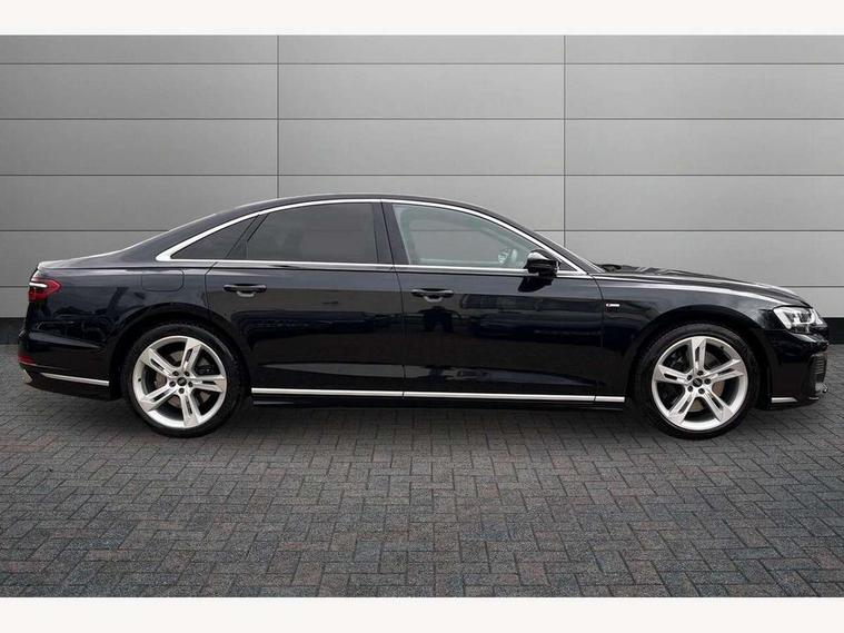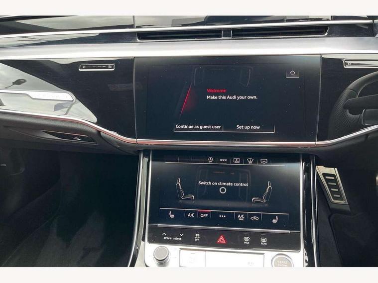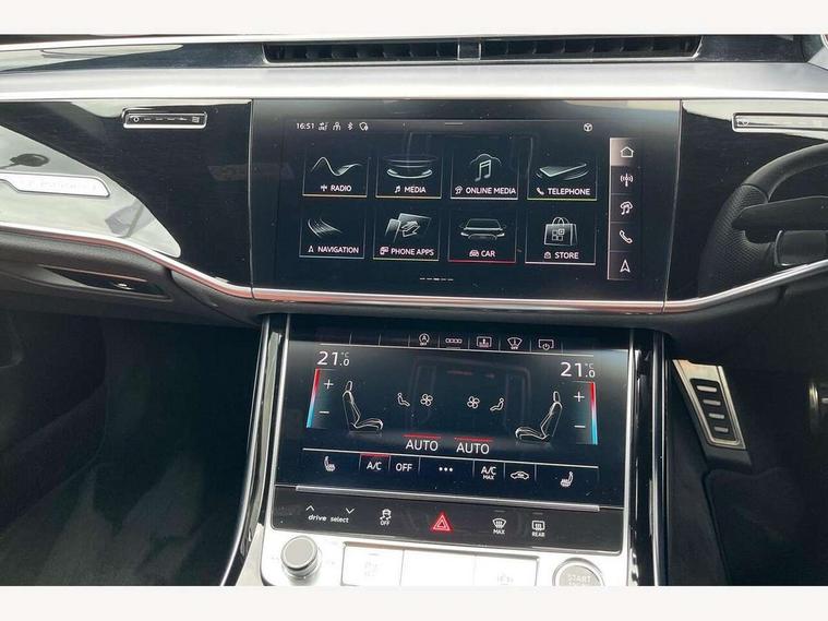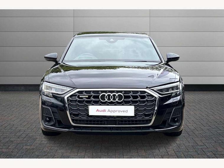 'Lights On' Reminder warning buzzer, Adaptive cruise control with cruise assist, emergency assist, efficiency assist, swerve assist, turn assist and speed limiter, Audi connect safety and service (e-call), Audi drive select, Audi parking system plus with front and rear sensors, Audi smartphone interface with app store includes wireless Apple carplay, Android auto and Amazon alexa integration, Audi virtual cockpit, Bluetooth interface, Camera based traffic sign recognition, Convenience key, Electro - mechanical power assisted steering, Head up Display, MMI navigation plus with MMI touch + Twin touch screens with haptic feedback, Operating buttons in black, glass look with haptic feedback including extended aluminium look, Power door closure, Power operated tailgate, Rear view camera, Remote fuel filler release, Service interval indicator, 48V Mild hybrid technology, 8 speed transmission with hill hold assist, 82 litre fuel tank, Adaptive air suspension, Quattro all wheel drive with self locking centre differential, Audi music interface, Audi sound system, DAB digital radio module, DVD System, MMI radio plus, USB connection, Acoustic double glazing, All-weather, manoeuvring, position, static cornering, turning and motorway lights with automatic dynamic headlight range control, Audi space frame, Auto dimming rear view mirror, Body colour bumpers, Body colour exterior mirror housings, Body colour side protection with aluminium trim strips, Electric front windows, Electric rear windows with isolation switch, Electric sunblinds for rear window and rear door windows, Electrically adjustable heated folding + automatically dimming exterior mirrors with memory function and integrated LED indicators, Front wash/wipe with interval delay, HD matrix LED headlights with dynamic light presentation and dynamic indicators, Headlight cleaning system, Heat insulating darkened glass in side and rear windows, Heat insulating glass windscreen, Heated rear window, Heated windscreen washer jets, High beam assist, LED brake lights, LED daytime running lights, LED third brake light, OLED rear lights with changeable rear light signature, Privacy glass, Rear boot, Rear side wing doors, Side skirts, Welcome/leaving lighting, 12V socket, 2 zone automatic air conditioning, 3 seat rear bench with centre armrest in 2nd row, 4 way electric lumbar support for driver and front passenger, Audi phone box light, Black cloth headlining, Centre console with cupholders, Comfort centre armrest front, Door pockets with bottle holder, Driver and front passenger side sunvisors with illuminated vanity mirrors, Dust/pollen filters, Electric front seats with memory function, Front floor mats, Glove compartment cooling, Heated front seats, Height/reach electric steering column with easy exit function, Illuminated door sill trims with aluminium inlays and S diamond emblem, Interior S Line Badging, Isofix child seat mounting points on outer rear seats, Leather gearknob, Passenger footwell storage net, Reading lights, Rear floor mats, Rear headrests, Roof mounted sunglasses holder, Single front passenger seat, Stainless steel pedals and footrest, Valcona leather upholstery with front sports seats in diamond quilted with S embossed logo, Chrome exterior pack - A8, Extended LED Interior multi coloured light pack - A8, High gloss styling pack - A8, S line exterior styling pack - A8, 3 point seatbelts on all rear seats, ABS/EBD, Active front headrest system, ASR traction control, Audi pre sense basic, Audi pre sense front, Black brake calipers, Driver/Front Passenger airbags, EDL traction control, Electromechanical parking brake, ESP, Extended pedestrian protection measures, Front and rear disc brakes, Front and rear side airbags with head airbag system, Front passenger airbag deactivation, Rear child proof door locks, Seatbelt reminder + electric contact in buckle + advanced safety equipment, Tyre pressure loss indicator, Warning triangle and first aid kit, Anti theft alarm tow away protection, Anti-theft wheel bolts and wheel loosening detection, Remote central locking, Dark matt brushed aluminium lower inlays, Piano black finish upper inlays,